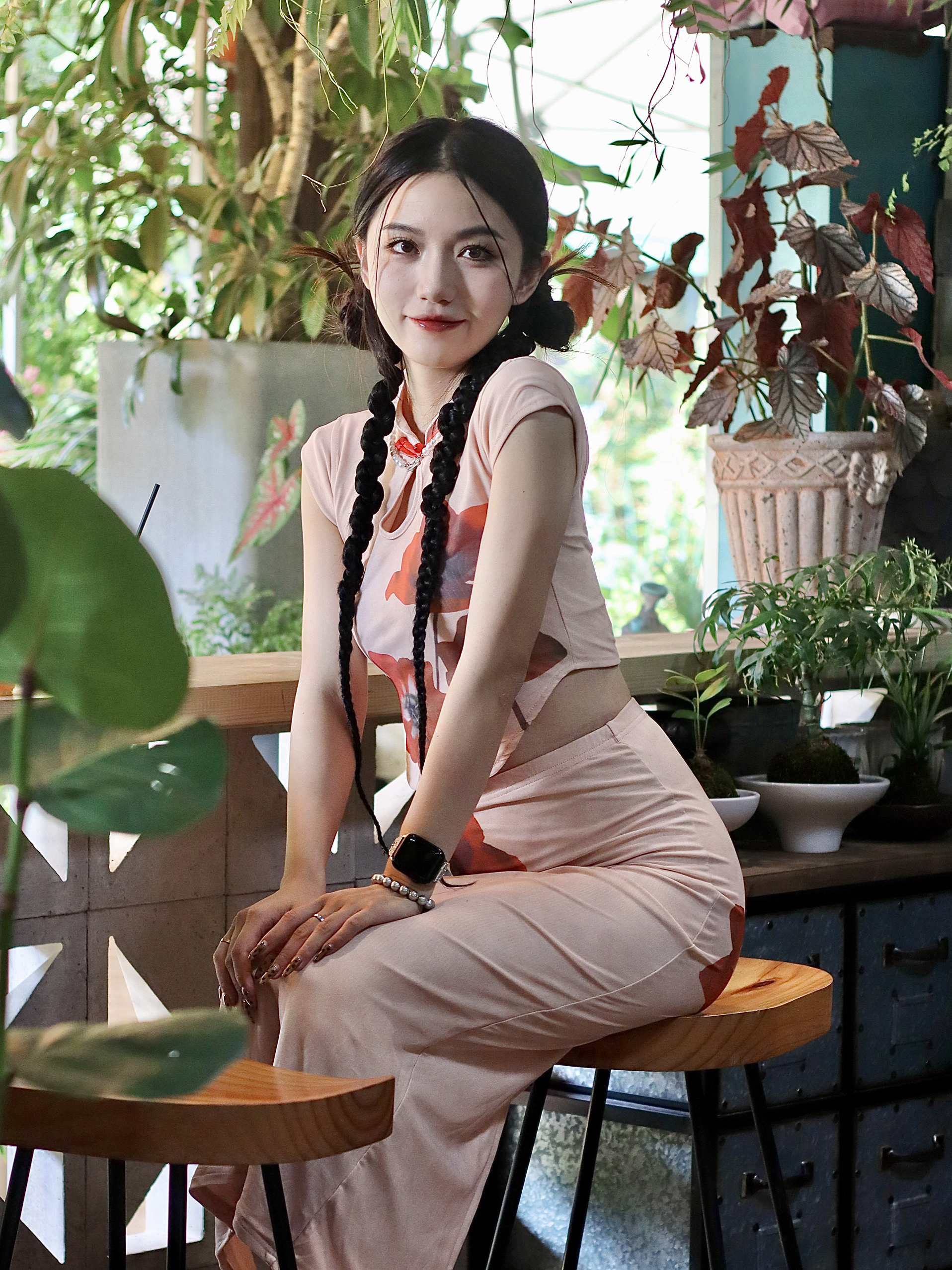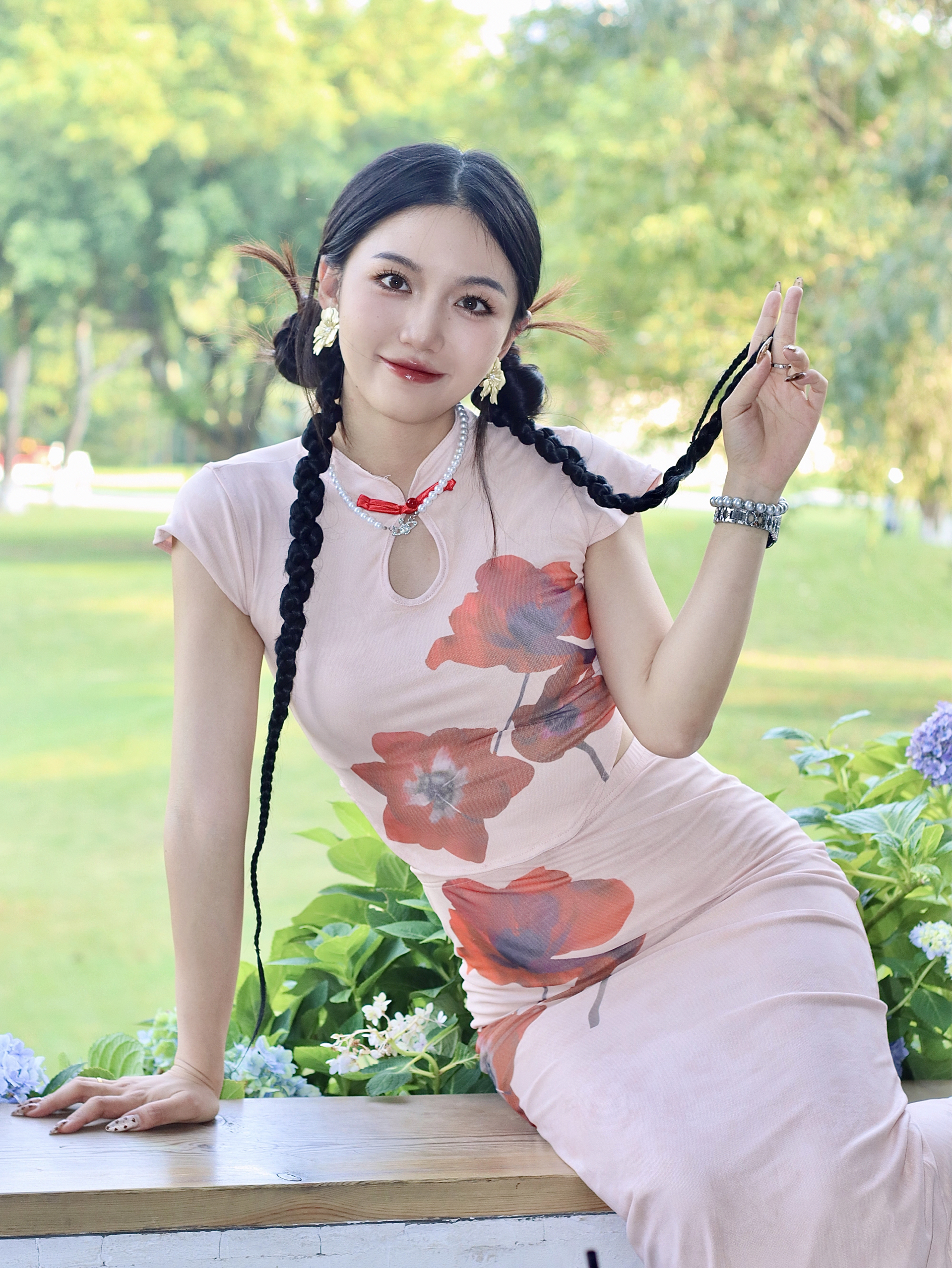 谁懂啊!越来越喜欢新中式审美点瓜粉粉嫩嫩的底色,配上大朵印花 复古又时 髦~领口小设计超别致,中式韵味拉满,又带点小性感愛 全扎个双麻花辫,和旗袍适配度100%⑤ 往公 园长椅一坐,和绿意融融的背景一搭,松弛感这不就来了~咱就是说,中式美学yyds!