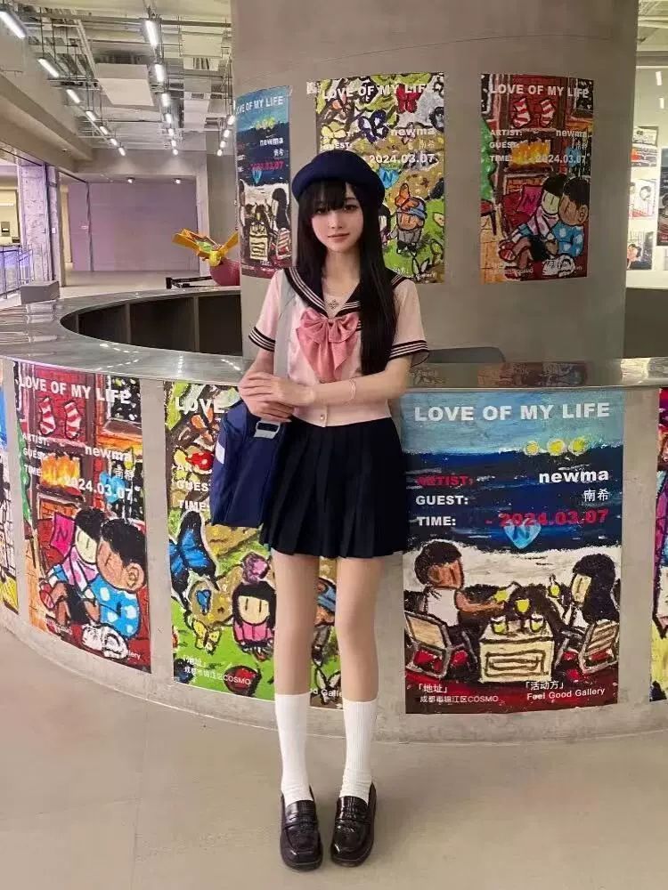 · 粉绀撞色美学:水手服采用定制樱花粉与绀色拼接,领边立体樱花刺绣如花瓣飘落,搭配同色系大蝴蝶结,瞬间化身漫画里的樱花少女