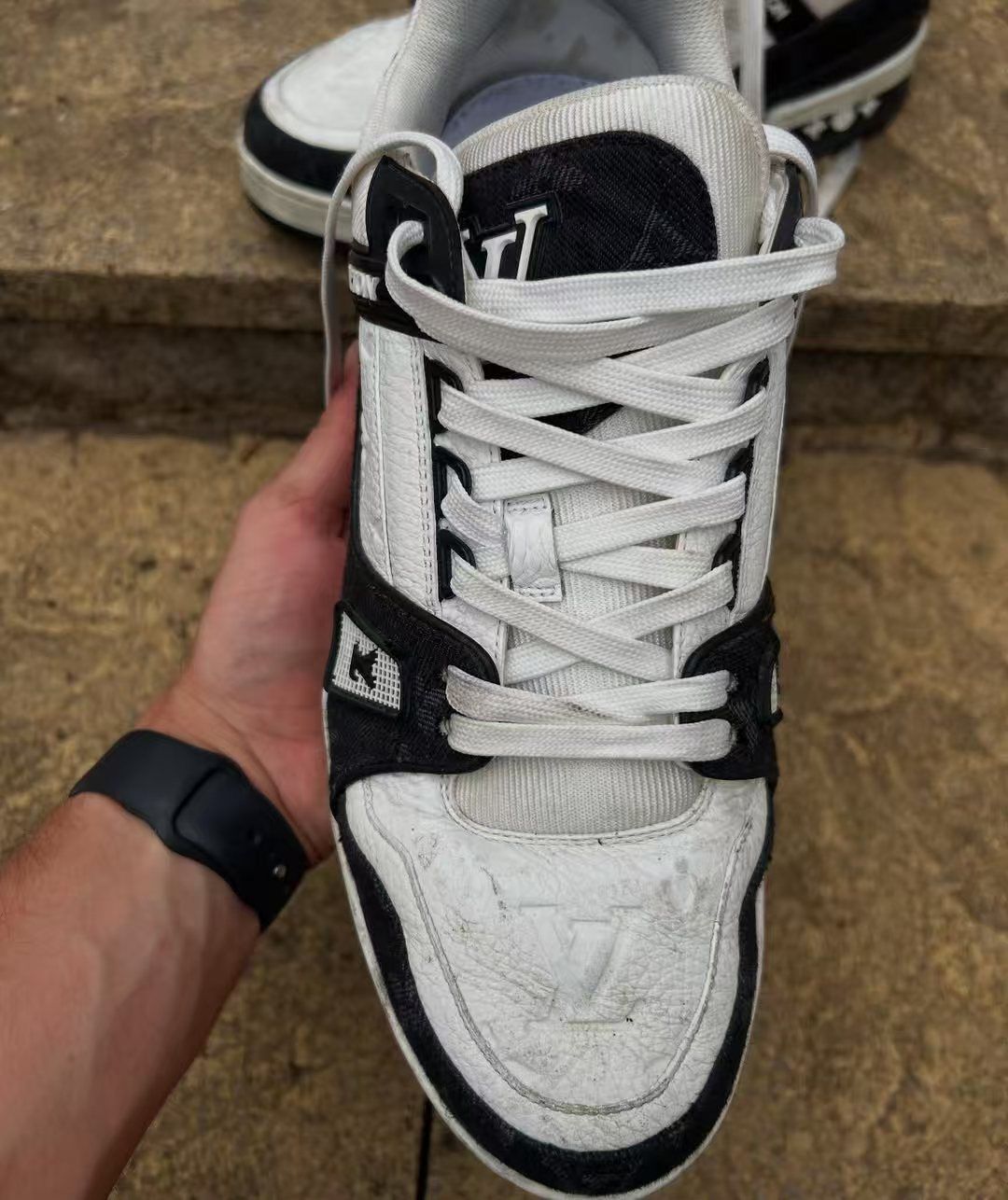 刚入手的LV Trainer熊猫配色,OMG这颜值简直爆炸,黑白配色永远的经典啊! 外观:黑白配色太百搭了,压纹印花质感满满,侧面的LV标志低调又奢华,简直不要太帅气!熊猫既视感真的绝绝子,远看就是焦点啊~ 材质:皮质摸起来超级舒服,但有点点硬,需要一段时间适应。压纹部分做工挺精致的,就是白色部分容易脏,擦了几次已经有点发黄了呜呜。 穿着体验:比想象中重一点点,但是脚感还蛮舒适的,逛街逛了一...