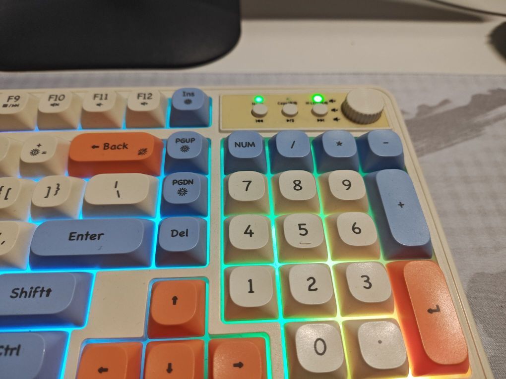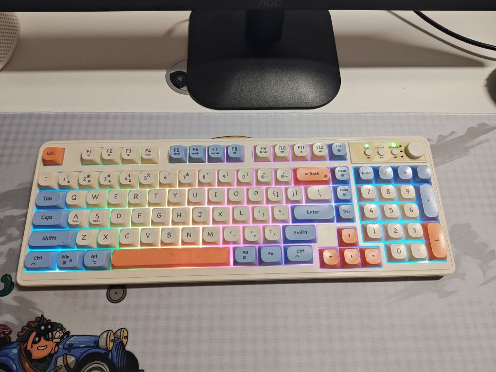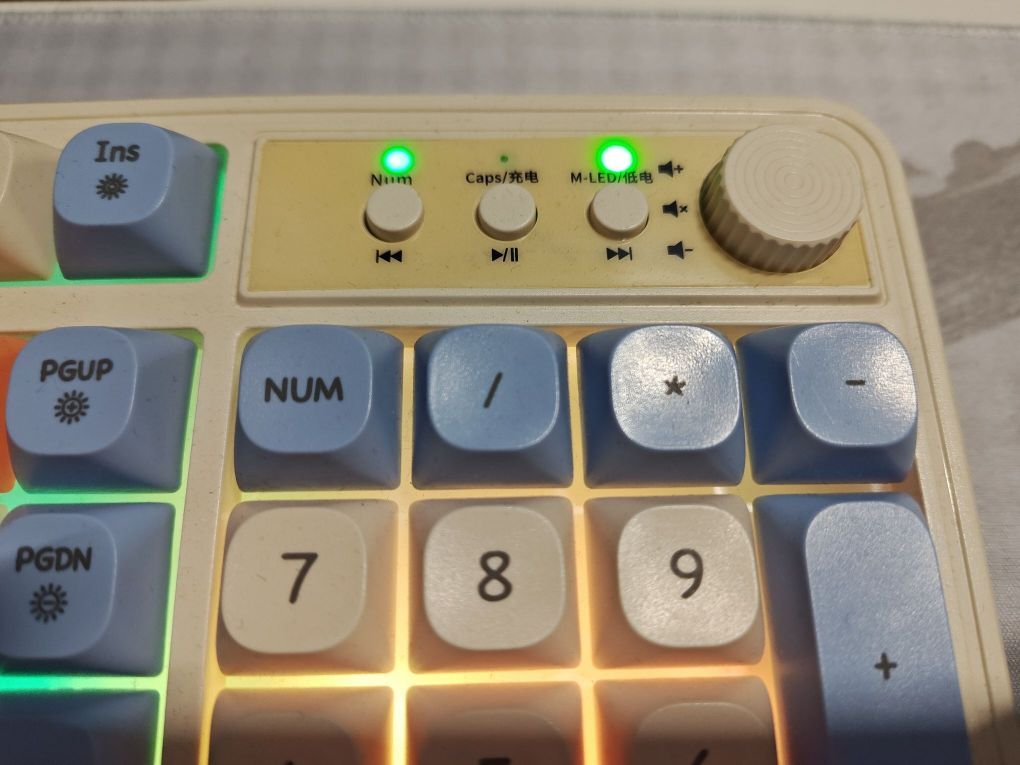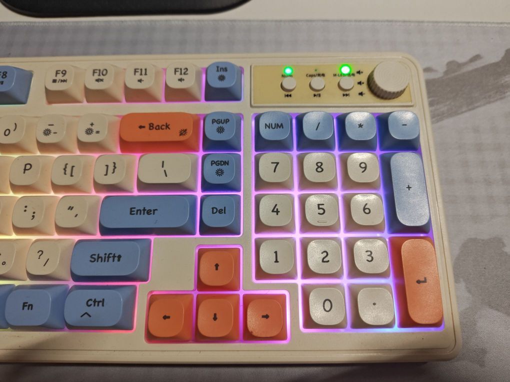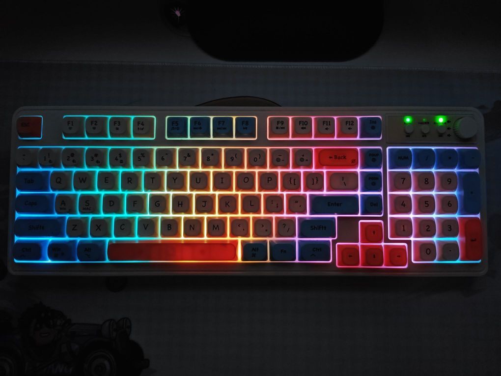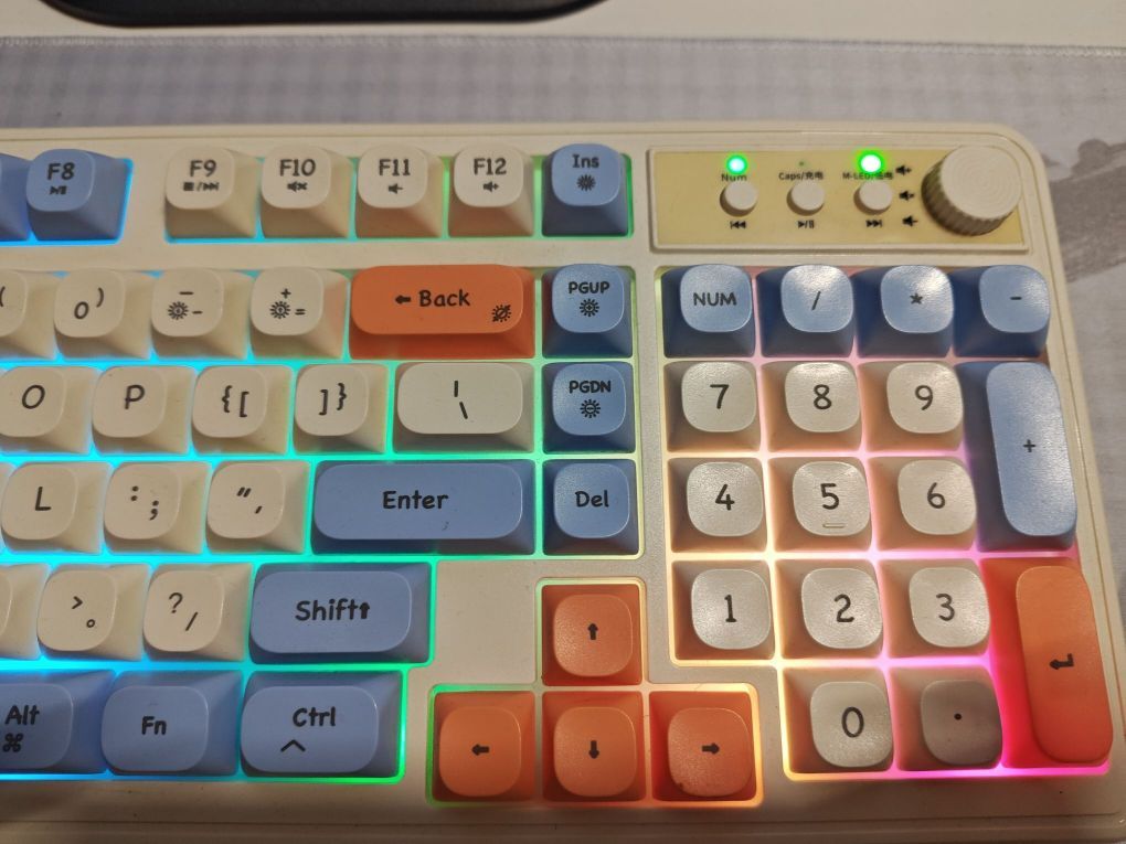 这款前行者V1无线键盘颜值高,7种氛围灯随意调节,亮度🔆可调,支持切换音乐🎶,非常nice☘️☘️ 与电脑匹配速度快,第一次连接上以后,每次使用开机瞬间就可以连接上😼😼 待机时间长,type c口的充电接口,与手机完美匹配,冲完手机就可以冲,非常方便,充一次电可以用两周,满足日常需求😈😈 注意:不是机械键盘,声音不大,很柔和的声音,按键反馈不是很明显[皱眉_blue] 颜值高,实力强,喜...