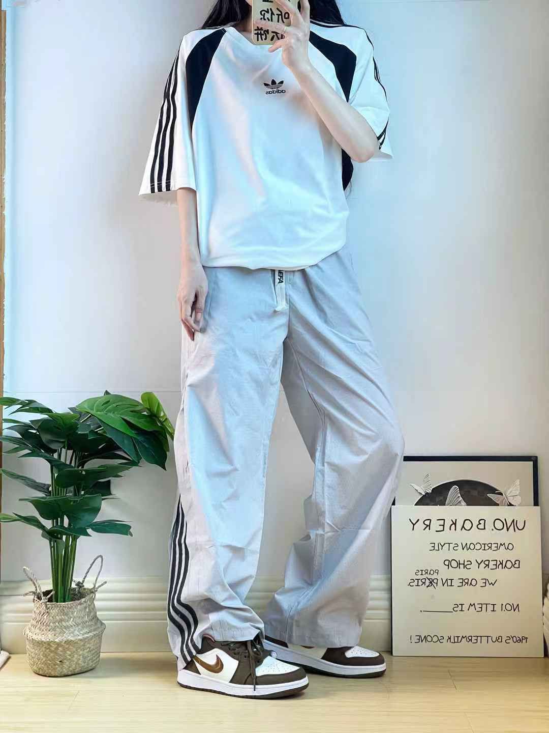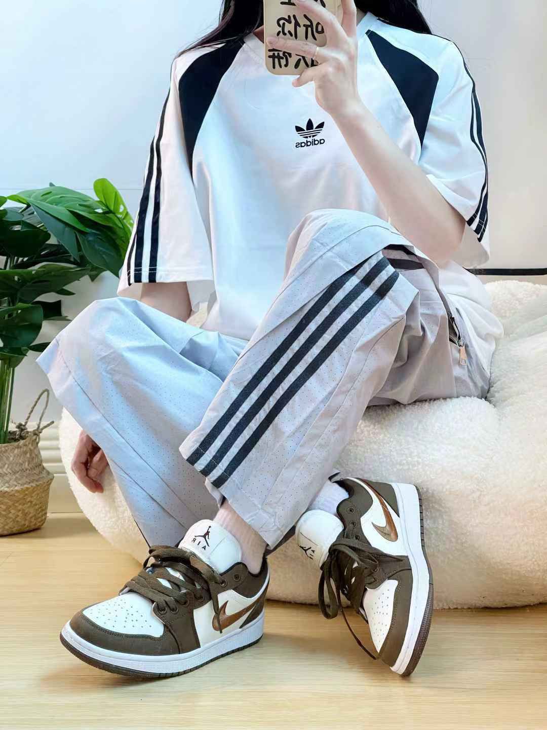 🏖️夏日就要穿运动风呀🤗⛅️黑白拼色圆领阔版T恤➕侧边条纹工装休闲裤 裤子的面料带一点冰感,❄️感觉贴肤很凉爽舒适耶 👋网面透气孔设计,细节做的很贴心 阔版的松紧高腰款的显腿长腿直🧚🏻♂️ 我这样的小个子也能轻松穿出松弛慵懒感~🦄 搭配一双🍫巧克力白棕复古球鞋 假期出游穿这套!🎉