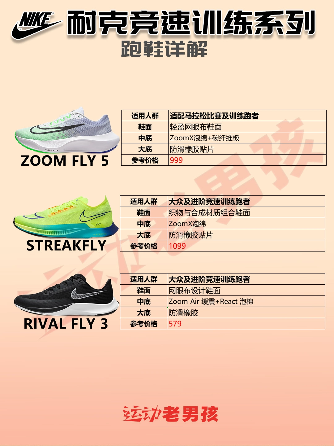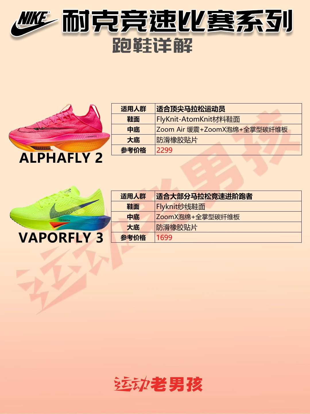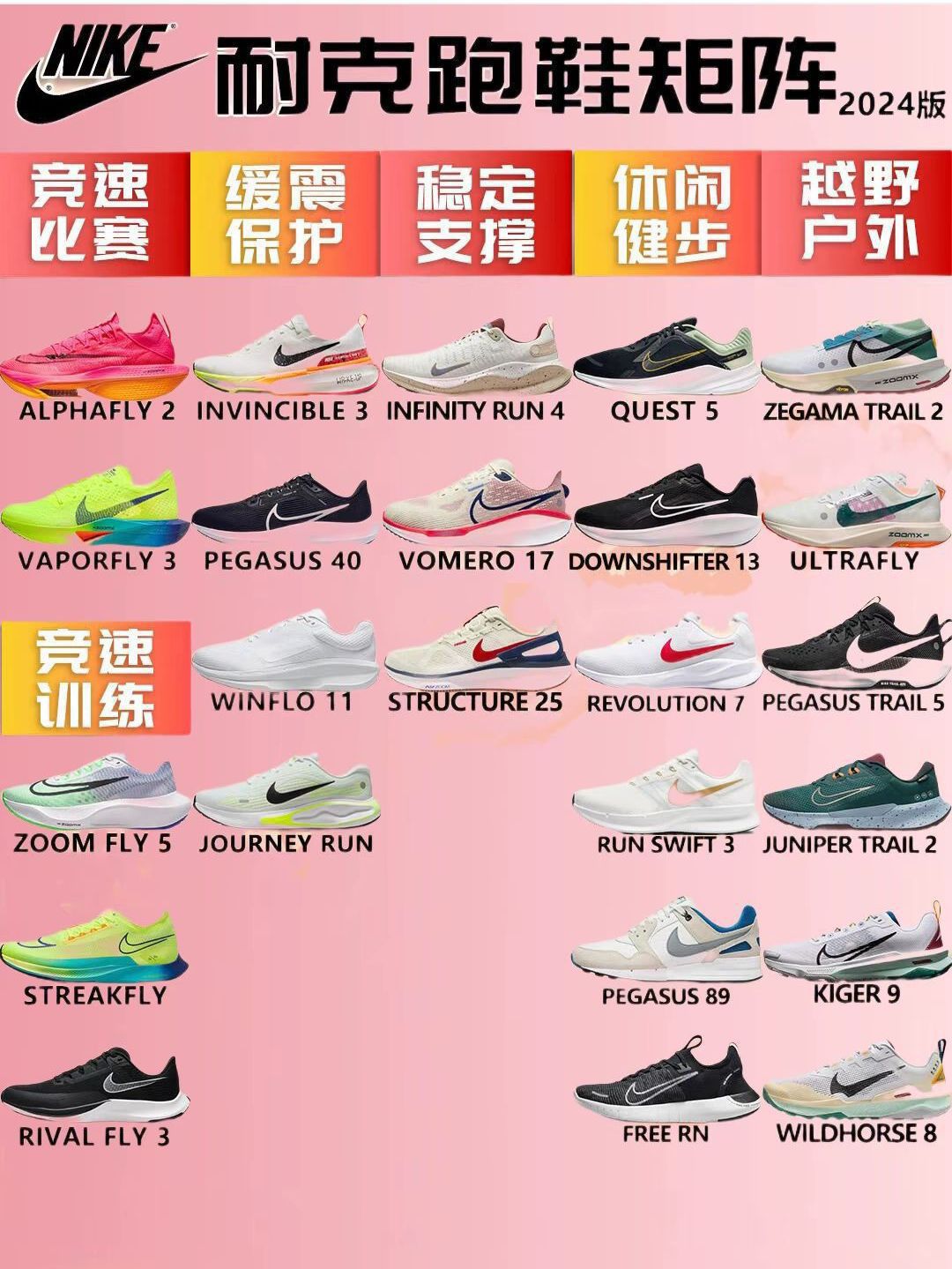 耐克NIKE在运动品牌里的江湖地位,可谓一枝独秀! 引用安踏老总丁世忠说:不做中国的耐克,要做世界的安踏!肯定耐克的江湖地位! 为什么耐克那么受欢迎 ,总结:好看,好穿,有科技! 一、竞速比赛跑鞋 顾名思义就是,可以帮助提速,提速跑步PB,比赛使用的跑鞋(马拉松赛事) 1.ALPHAFLY 2: 适合顶尖马拉松运动员 2.VAPORFLY 3: 适合大部分马拉松竞速进阶跑者 跑者可以根据自己实力,...