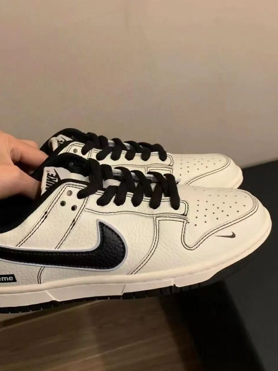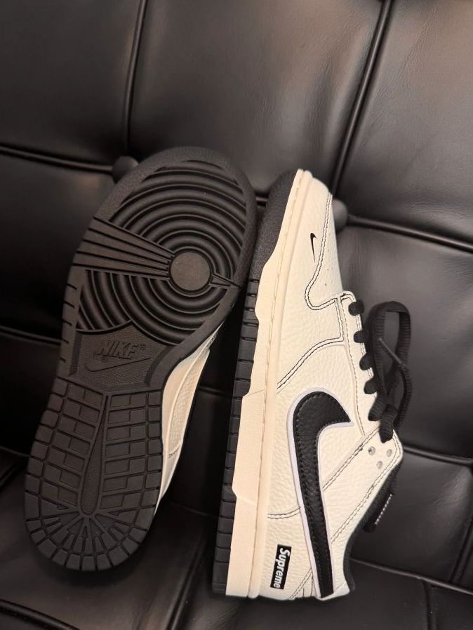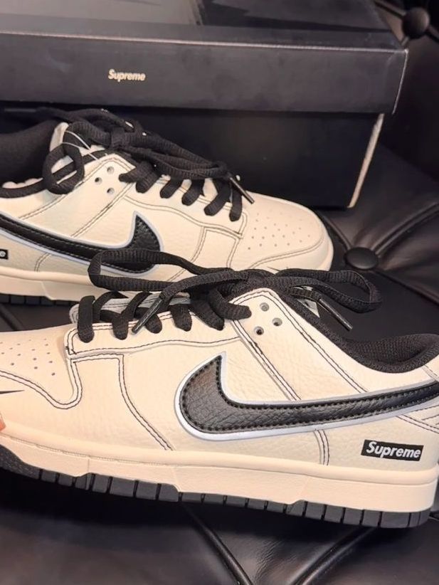 穿起来也是非常的舒服,好看,奶白鞋面配黑钩,简约又带感, Supreme 小标一缀,街头范儿拉满。鞋型设计很绝,上脚包裹感超棒,走路跑跳都稳,不会有晃脚的尴尬。皮质摸着也有质感,打理起来不算费劲(懒人狂喜) 。 搭配方面更是万能,运动裤、牛仔裤随便搭,瞬间让穿搭出彩,出街回头率直线飙升,妥妥穿搭加分神器! 这波入手不亏,喜欢潮流鞋款的铁子,闭眼冲就完事儿,上脚真的香到不行!