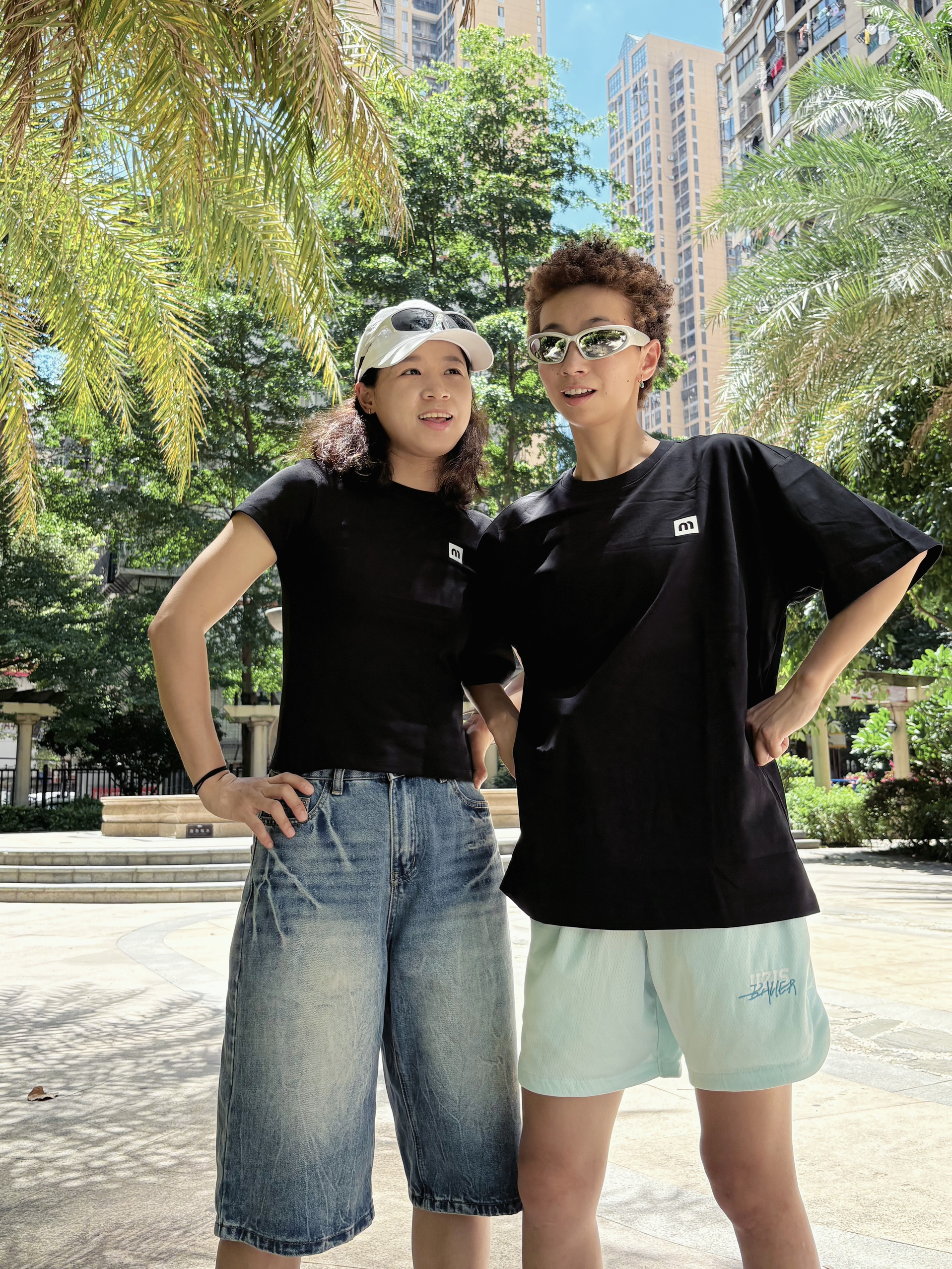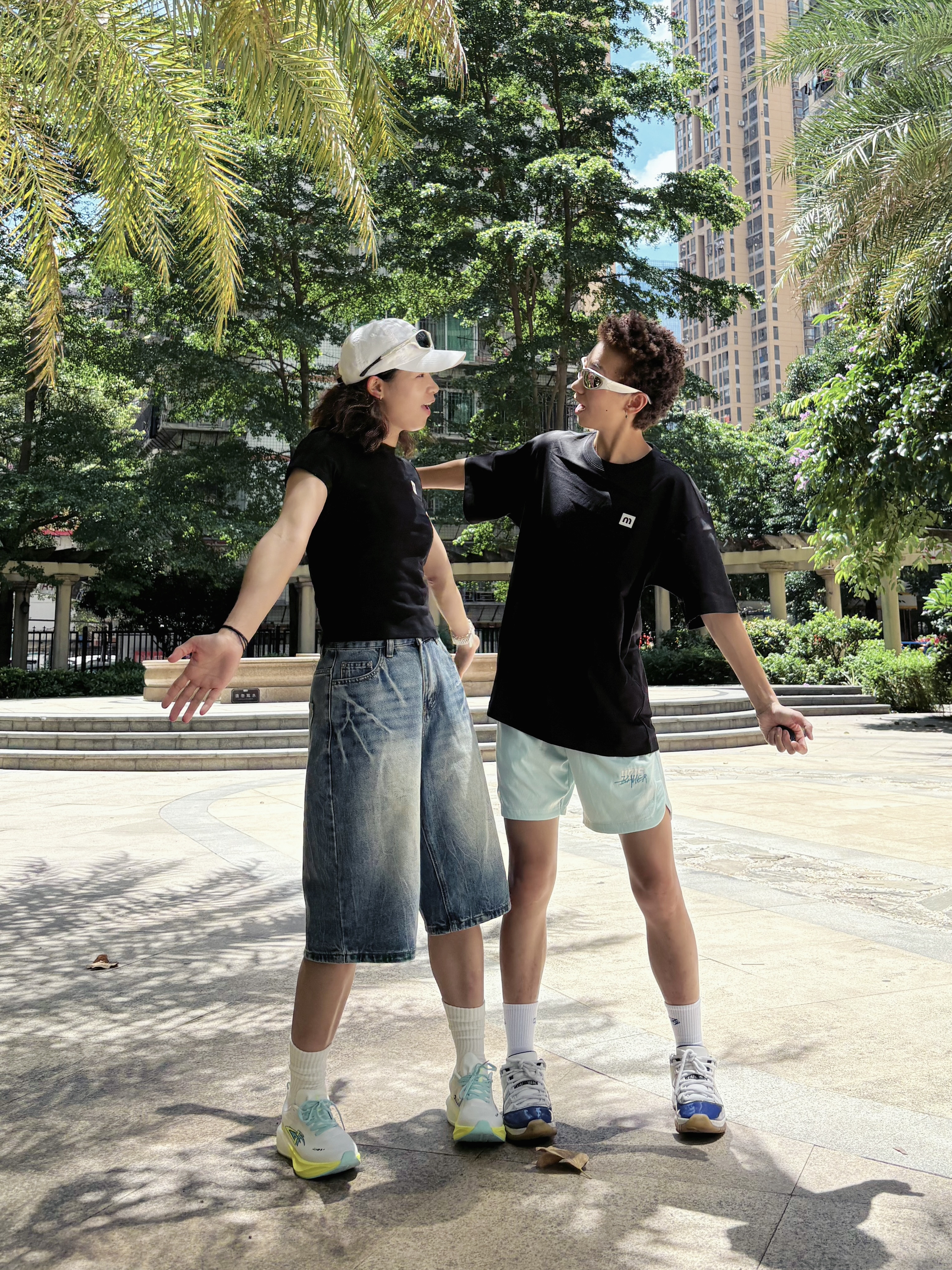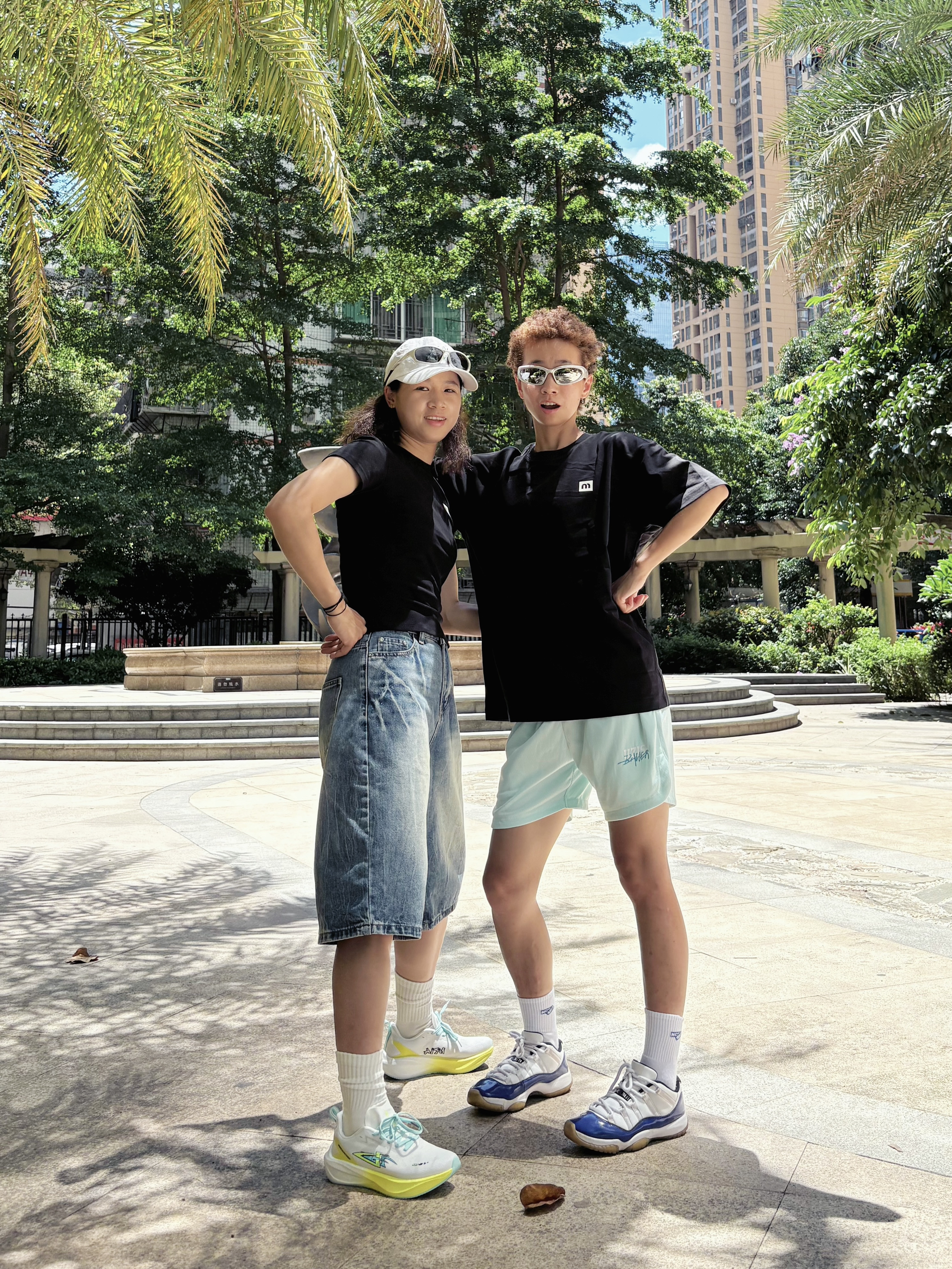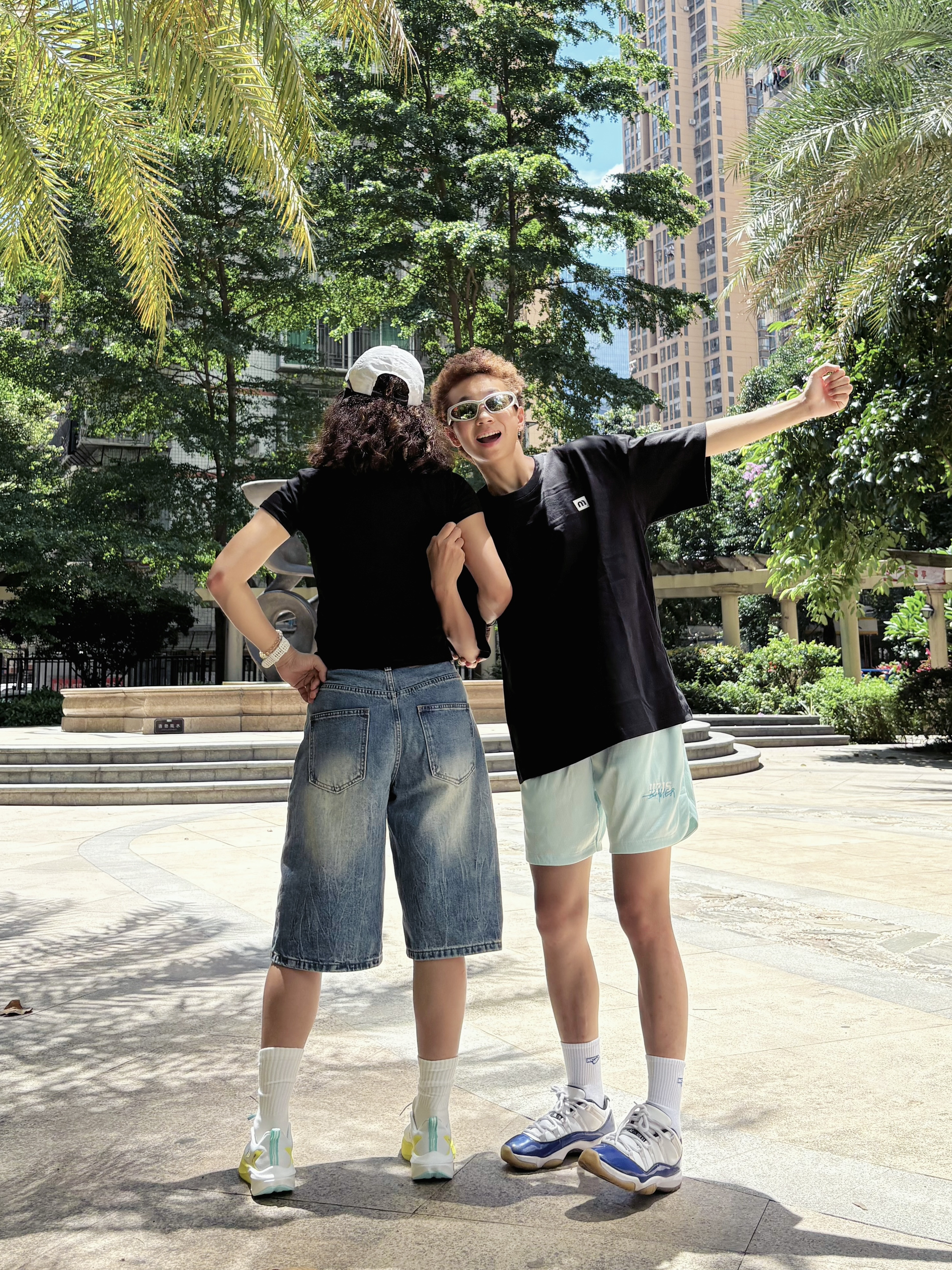小圆:167CM|58KG|👔:M 👖:m|👟:37码 小哇:168CM|46KG |👔:M 👖:m|👟:39码 总是吵架拌嘴翻白眼 但穿上情侣装马上变身黏腻小情侣 黑色T恤简单百搭 一大一小的版型一点也不乏味 各自搭配简单的短裤和运动鞋 哈哈哈哈哈好吧今晚我们约个会吧