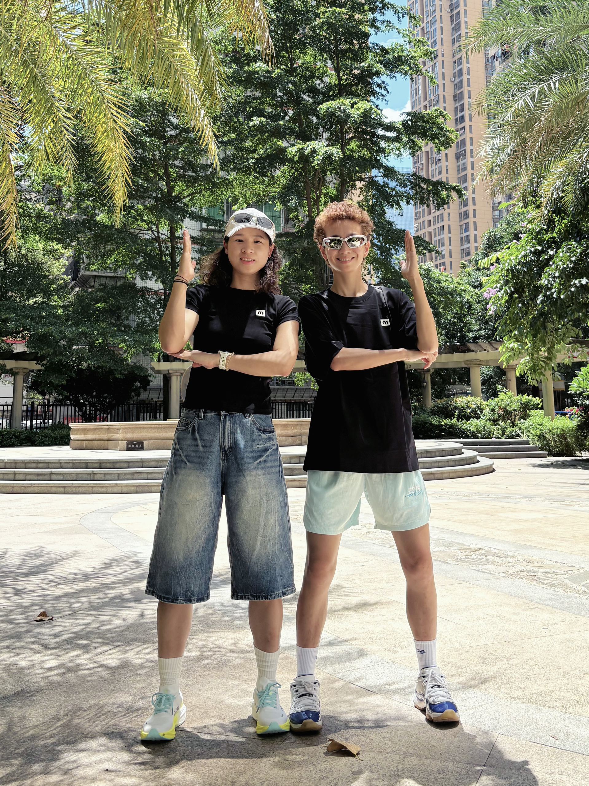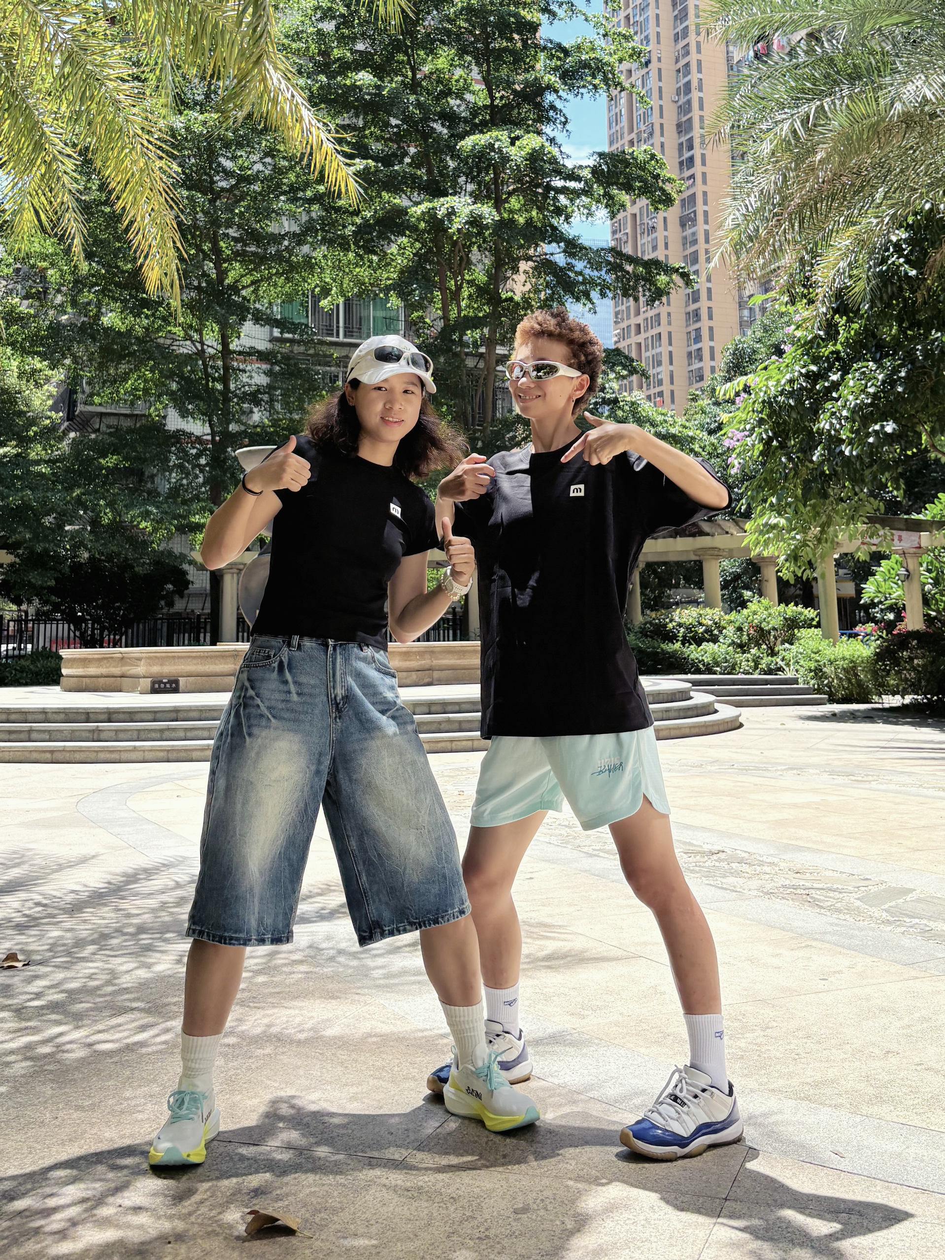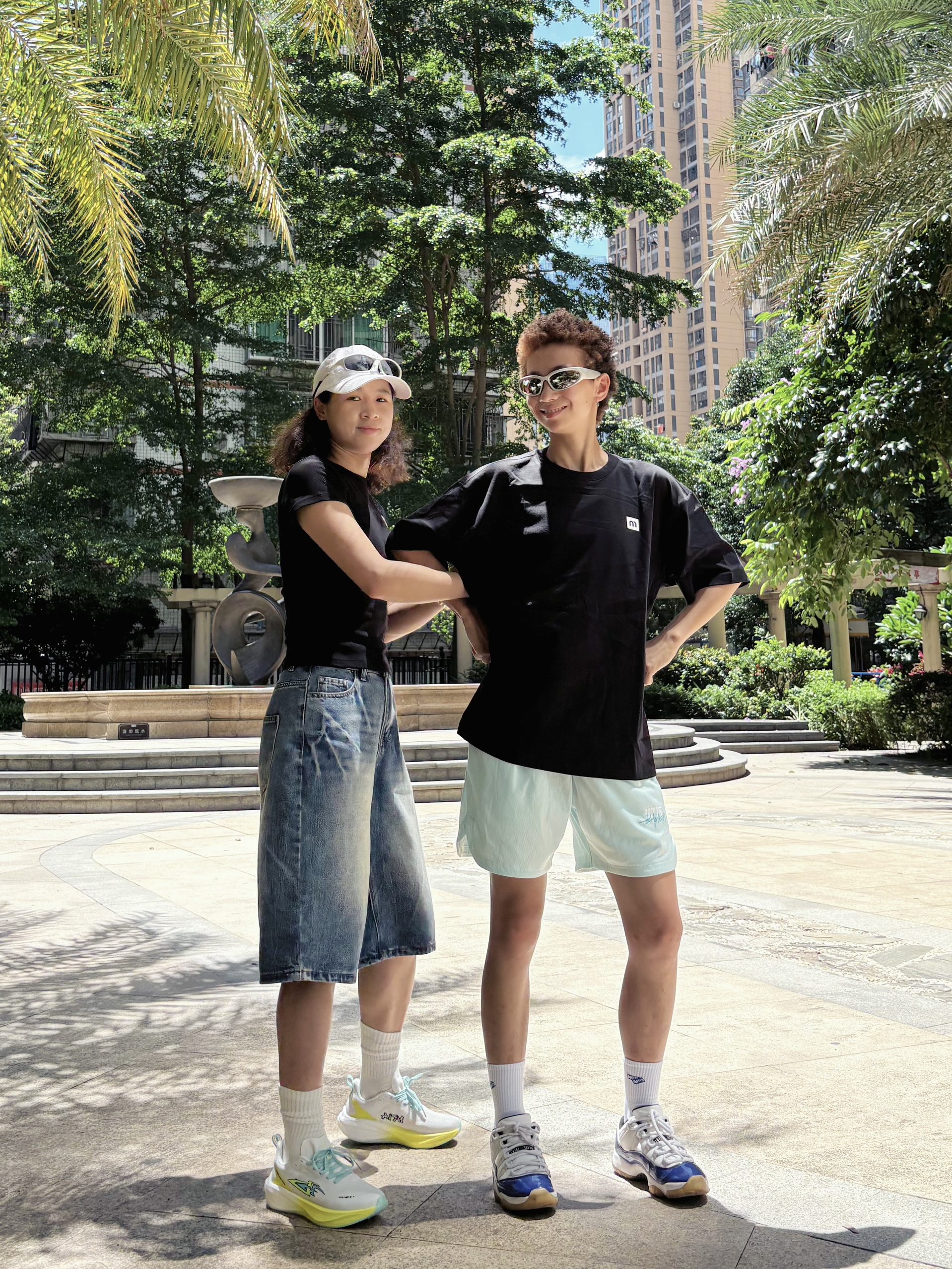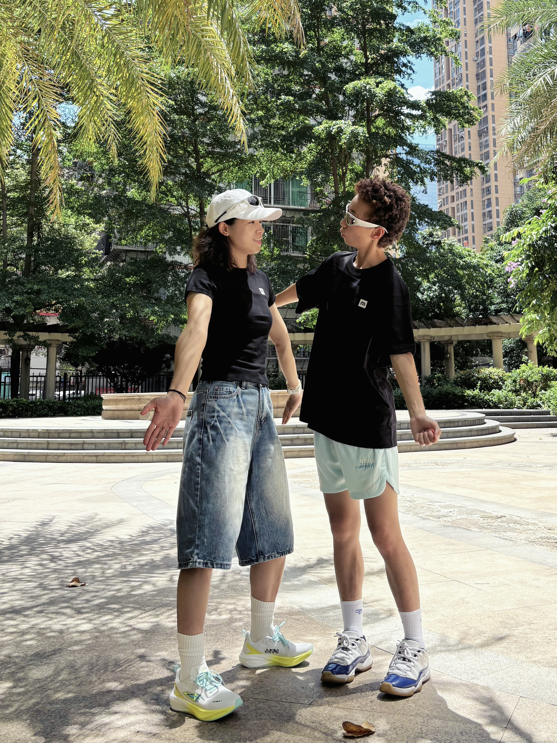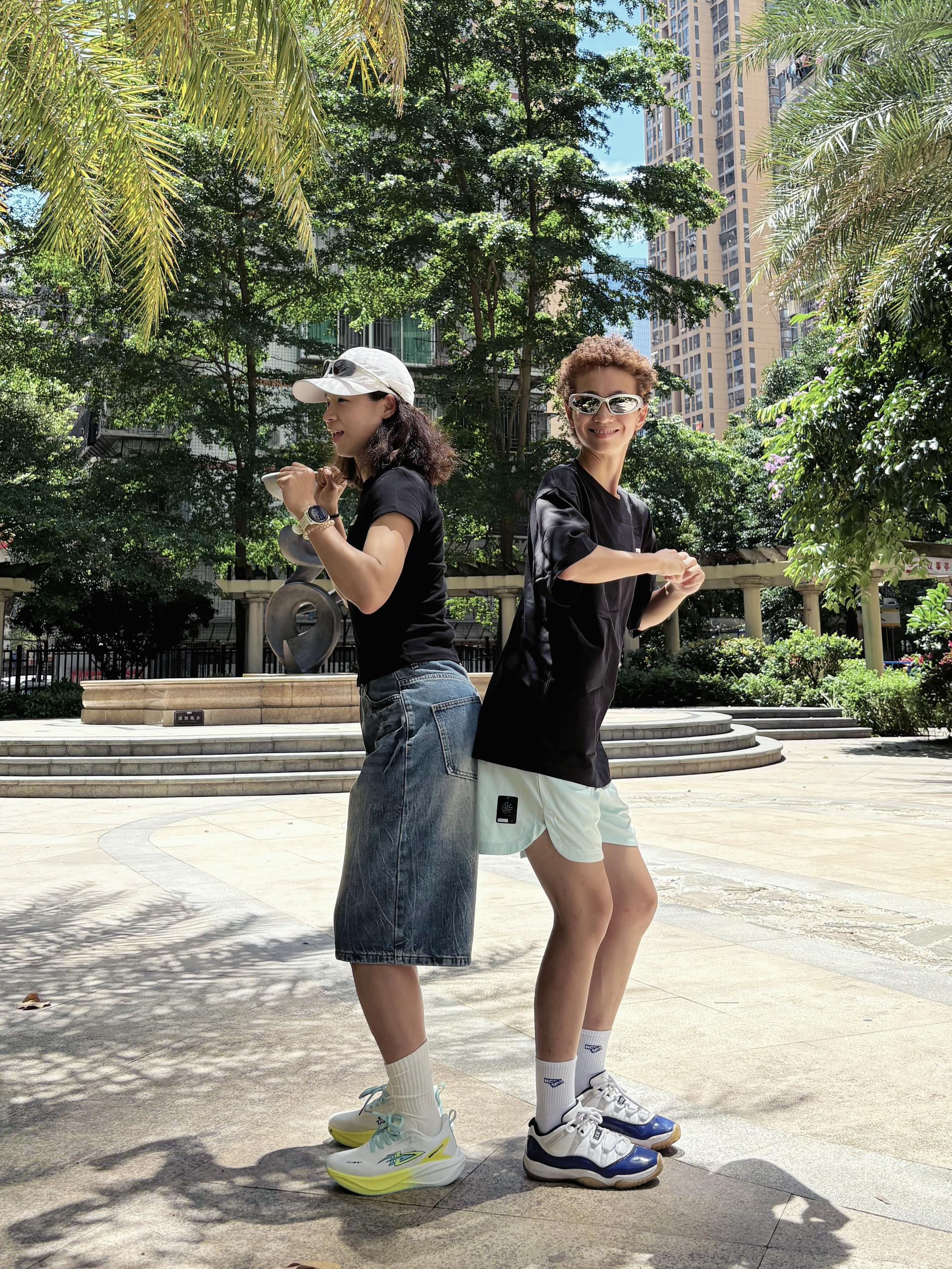 小圆:167CM|58KG|👔:M 👖:m|👟:37码 小哇:168CM|46KG |👔:M 👖:m|👟:39码 总是吵架拌嘴翻白眼 但穿上情侣装马上变身黏腻小情侣 黑色T恤简单百搭 一大一小的版型一点也不乏味 各自搭配简单的短裤和运动鞋 哈哈哈哈哈好吧今晚我们约个会吧