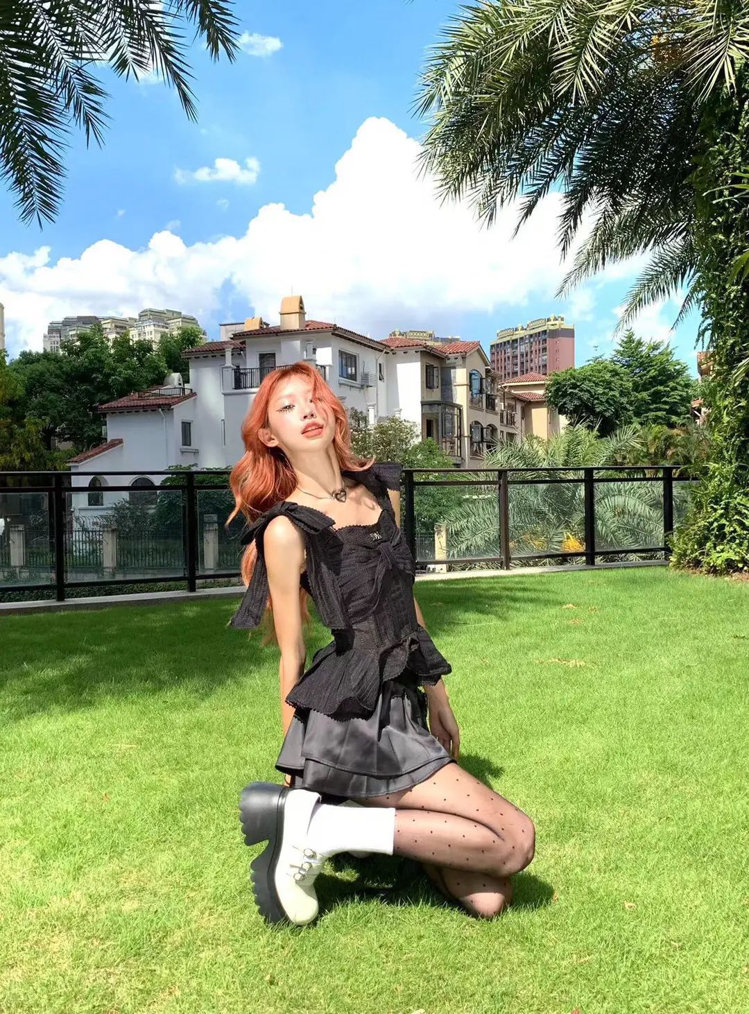 黑裙穿搭 | 把“在逃公主”穿成现实版👸 谁懂啊!在阳光草坪拍穿搭,直接美出电影感🎬 黑色吊带小上衣自带宫廷感,收腰+裙摆设计,把腰臀比狠狠拿捏✨ 搭配缎面半裙,光泽感和层次感拉满,波点黑丝+厚底鞋,甜酷氛围直接锁死~ 蓝天白云当背景,随手一拍都是公主出逃即视感👑 这套黑裙穿搭公式,夏天想当甜酷美女的姐妹,闭眼抄作业! #穿搭分享 #黑裙穿搭 #甜酷风 #夏日穿搭