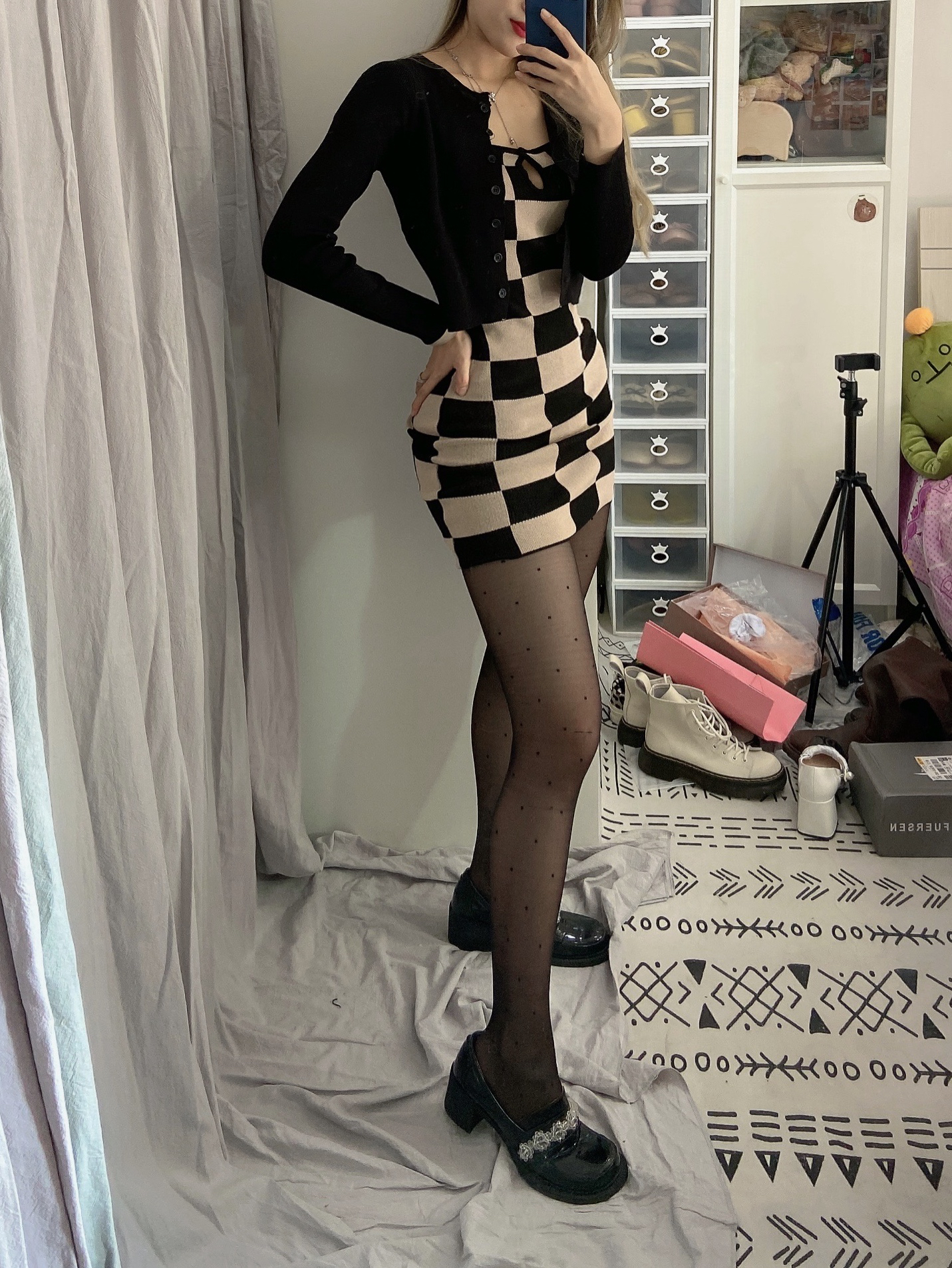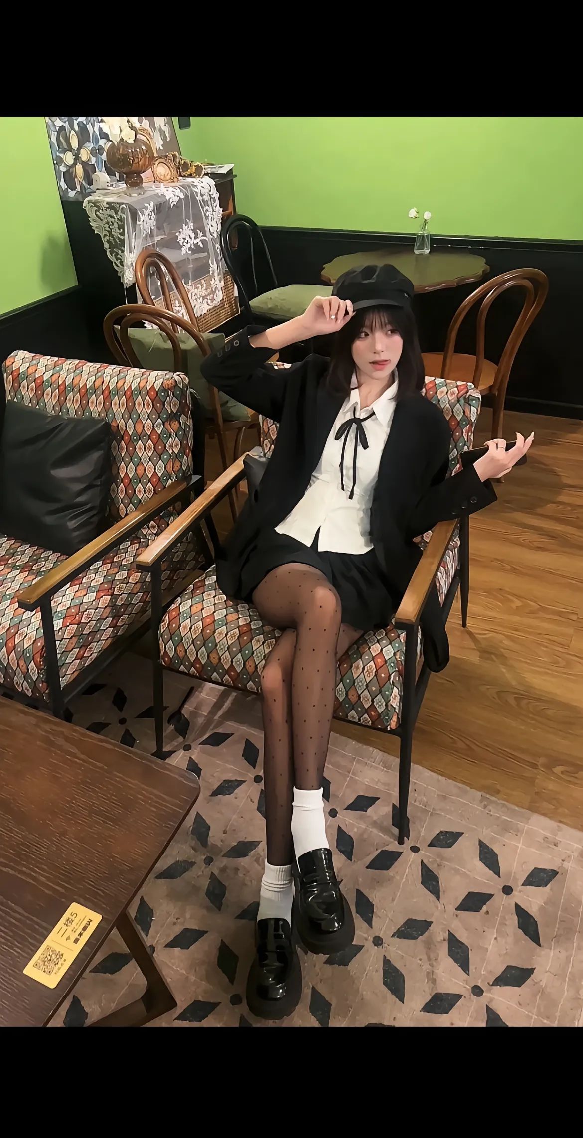 🪑 复古咖啡馆穿搭|把“学院贵气感”穿出来 救命!在复古咖啡馆拍穿搭,直接美成电影截图✨ 黑色V领针织衫+白衬衫领,自带学院贵气感,下搭蓬蓬白裙,甜酷平衡得刚刚好~ 透感黑丝+白袜+厚底乐福鞋,把“精致松弛”焊在身上,踩进复古氛围里,每一步都像在演文艺片🎬 角落小摆件当氛围感彩蛋,绿墙+复古家具当背景,随手拍都自带故事感📷 这套穿搭锁死,下次逛咖啡馆直接复制粘贴! #穿搭分享 ...