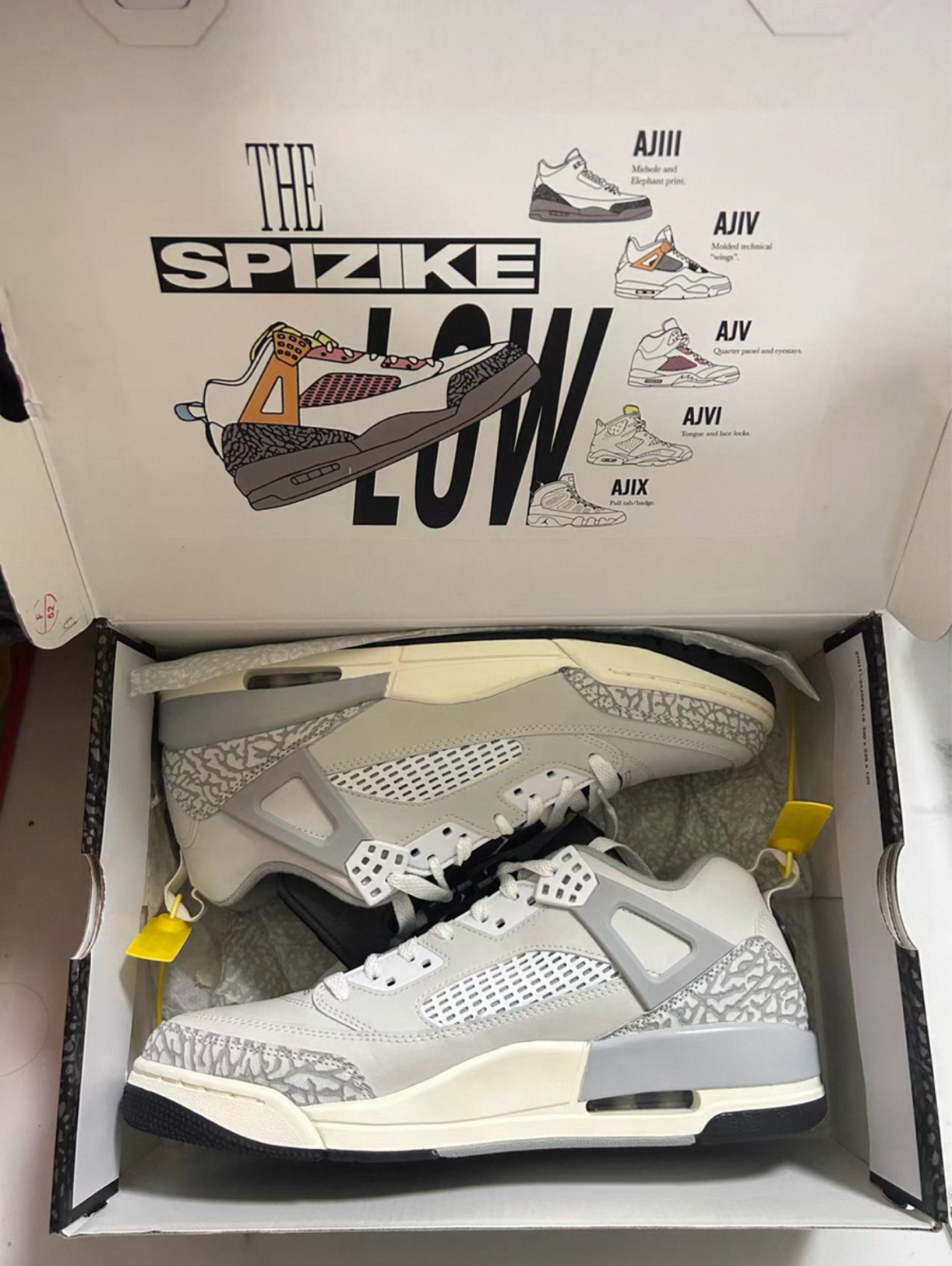 独特设计 融合经典:Air Jordan Spizike巧妙融合了AJ3、AJ4、AJ5、AJ6、AJ9五代经典鞋款的设计元素,像是鞋头和后跟的爆裂纹源自AJ3,侧面开窗借鉴了AJ4、AJ5,鞋舌采用了AJ6的设计,后跟则有AJ9的标志性logo,一鞋集齐多款经典元素。 细节丰富:白色的鞋身搭配浅灰色、淡银色元素,温柔清新又极具时尚感。鞋带和鞋舌上的灰色装饰形成对比,增添视觉层次。后标签上独特...