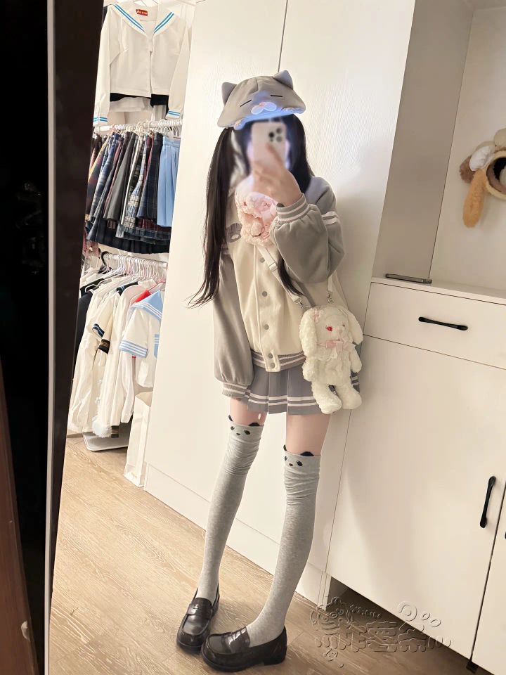 🐾灰系甜酷狙击|衣帽间里的“猫系学妹”穿搭公式 谁懂啊!在JK制服墙前随手咔一张,直接穿出「日系学院×甜酷反差」的猫系少女感✨ 灰棕拼色棒球服藏着小刺绣,像把“慵懒校队风”焊在身上~ 格裙漾开雾灰格纹,过膝袜上的小爪印暗戳戳卖萌,厚底乐福鞋一脚踩碎“乖乖牌”标签!猫耳帽和毛绒兔包疯狂发射可爱电波,背后制服墙直接拉满“我是JK控”的氛围buff📚 这套把「甜」藏在爪印里、「酷」焊在鞋跟处...