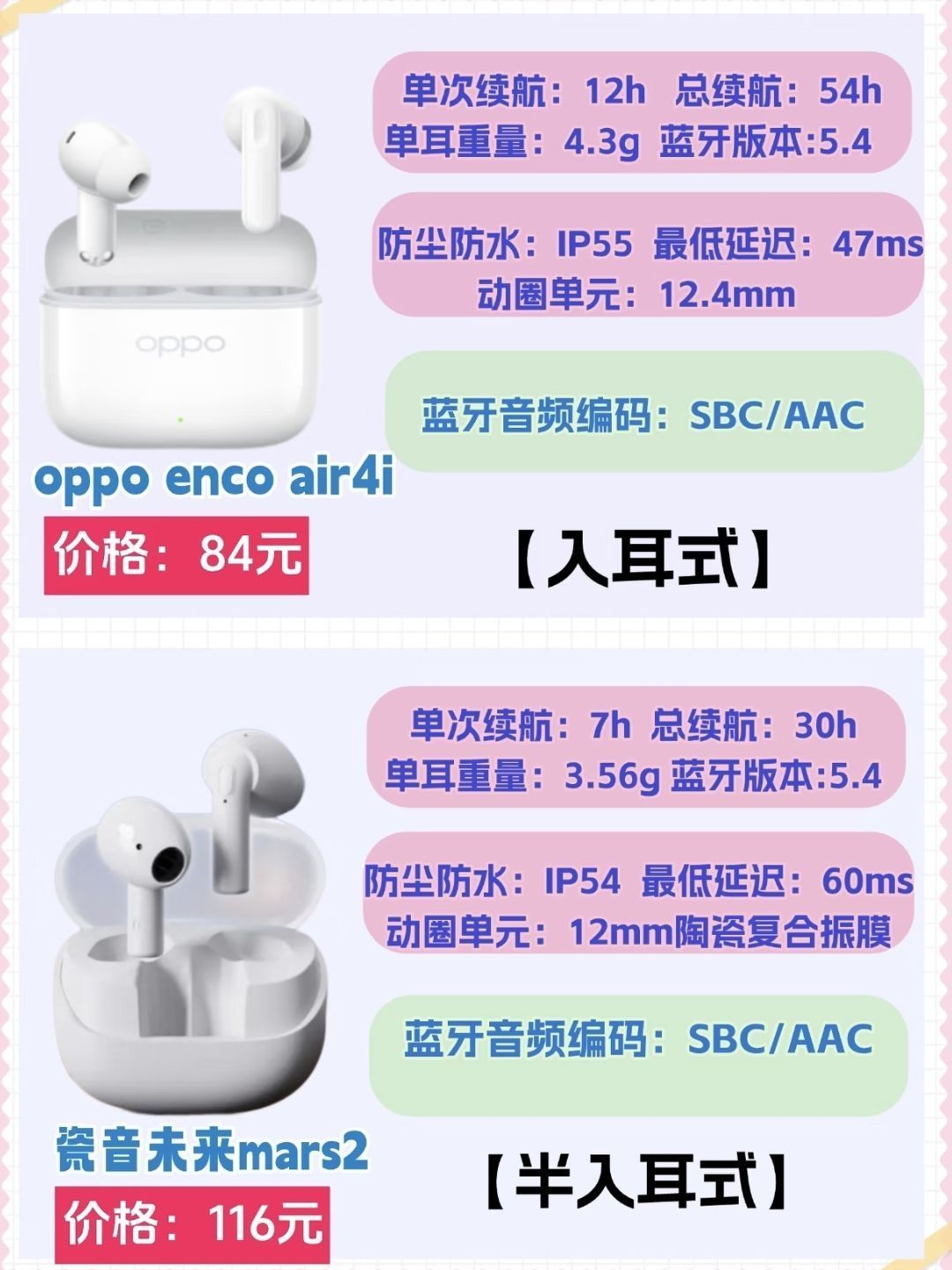 谁说平价=妥协?双麦降噪、游戏低延迟、Hi-Res音质...这些曾经的千元配置,在这次推荐里全被「打骨折」。半入耳式的轻盈与入耳式的沉浸,一次满足所有场景需求 博主今天来推荐八款高颜值高性价比百元价位的耳机 1⃣️oppo enco air4i 2⃣️瓷音未来mars2 3⃣️兴戈空岚fld200 4⃣️漫步者fit buds pro 5⃣️vivo tws4 ...