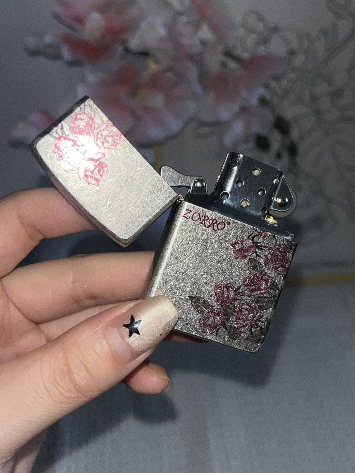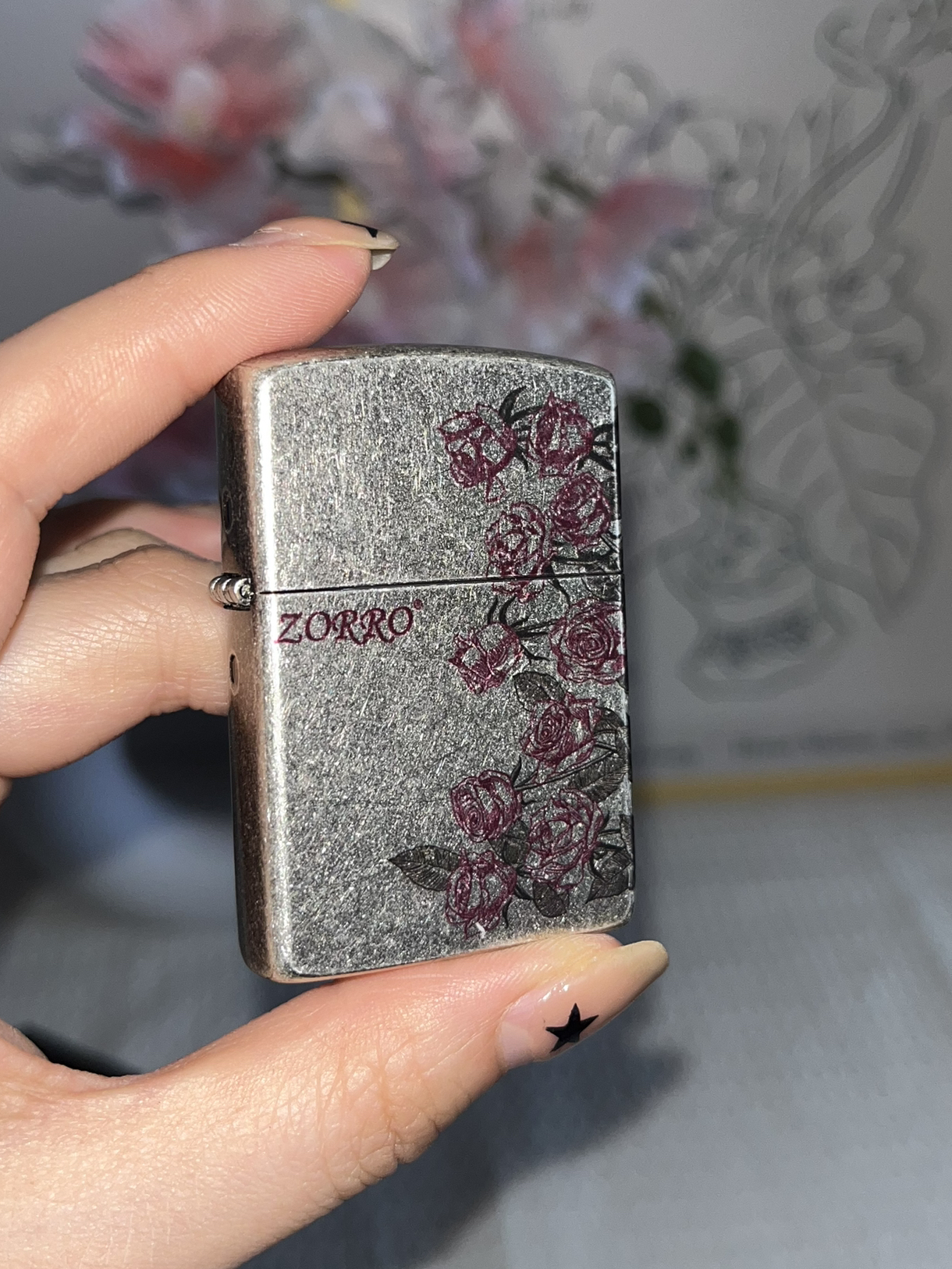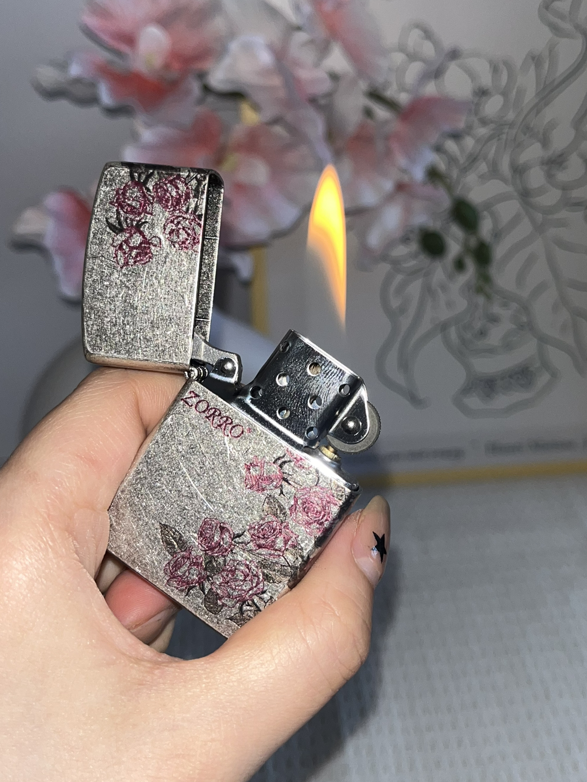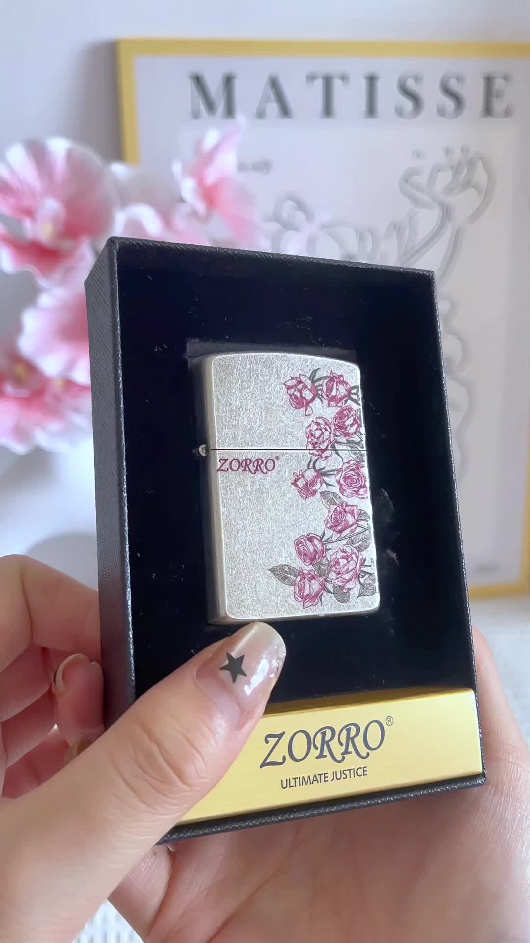 谁能拒绝在打火机上藏浪漫啊~ZORRO 这款金属磨砂外壳,自带复古颗粒感,粉色玫瑰印花蔓延一侧, 点火瞬间,仿佛连火苗都沾了浪漫气息,酷飒又温柔,揣进兜像藏了朵永不凋谢的花,用它点烟的仪式感,谁懂啊!