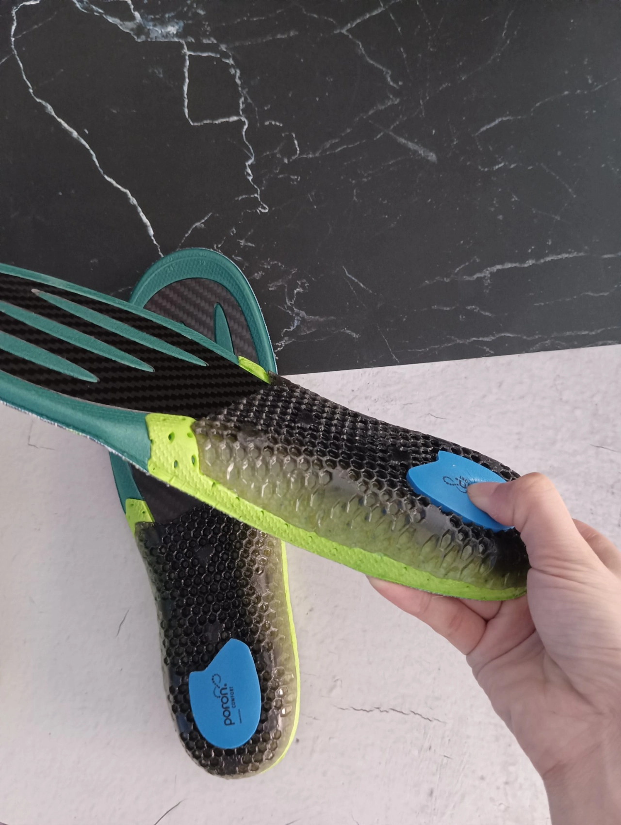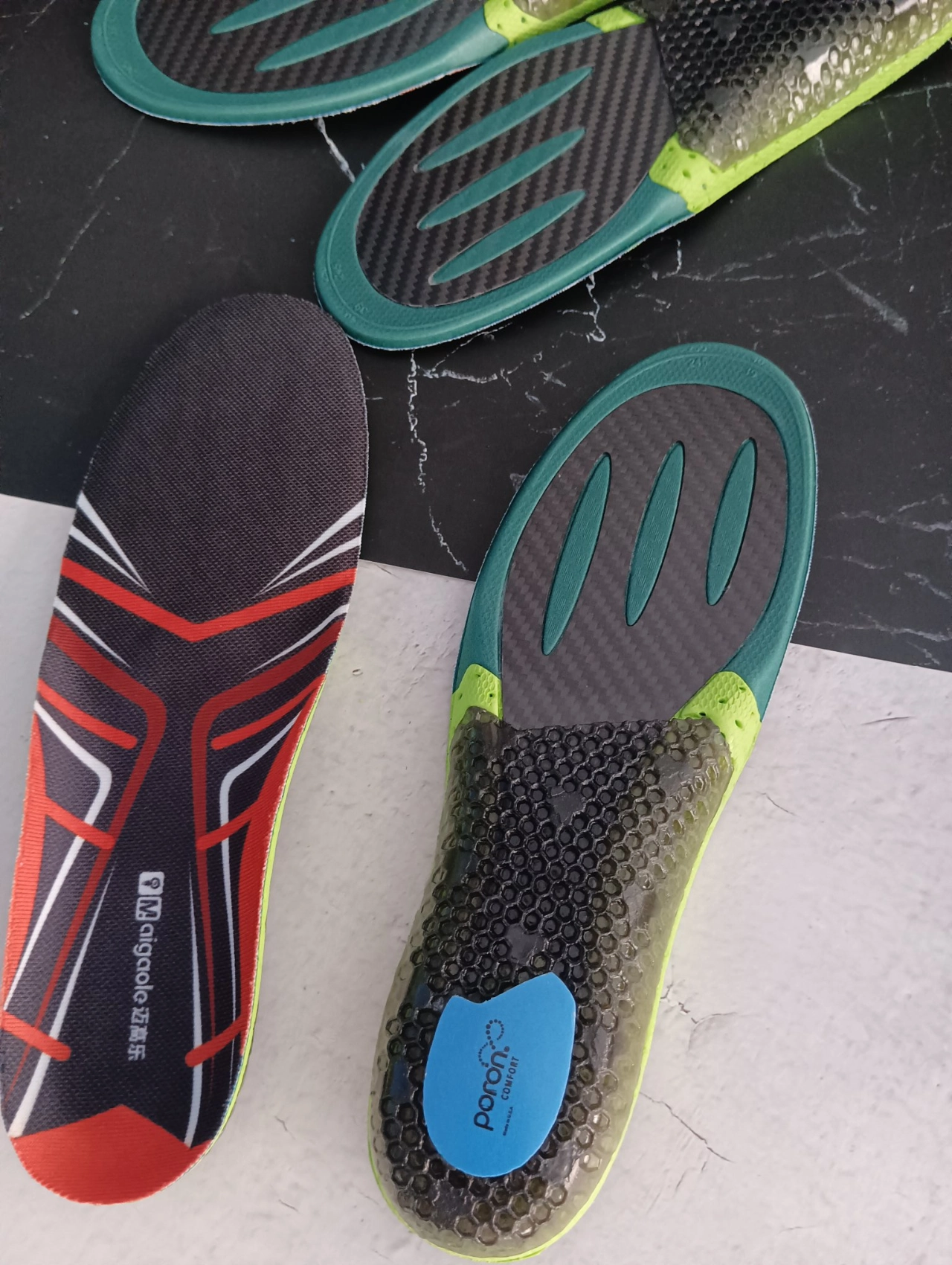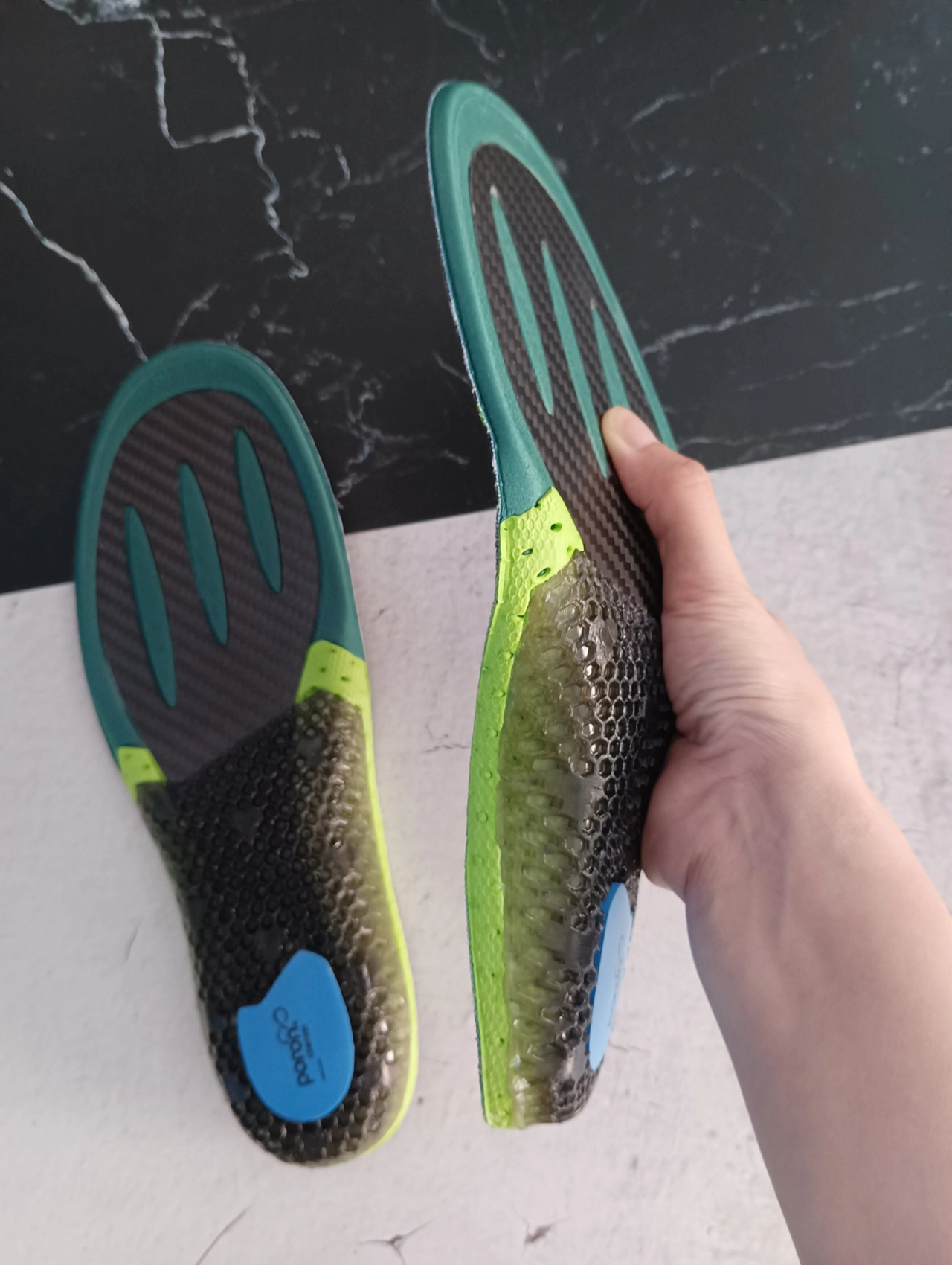 全掌碳板制成 以碳制碳 助力奔跑 组成:碳板+GEL+Poron+PU 12点矩阵稳固后跟 两种厚度选择 红色0.4mm更适合五分钟配速以上 绿色0.6mm更适合专业马拉松