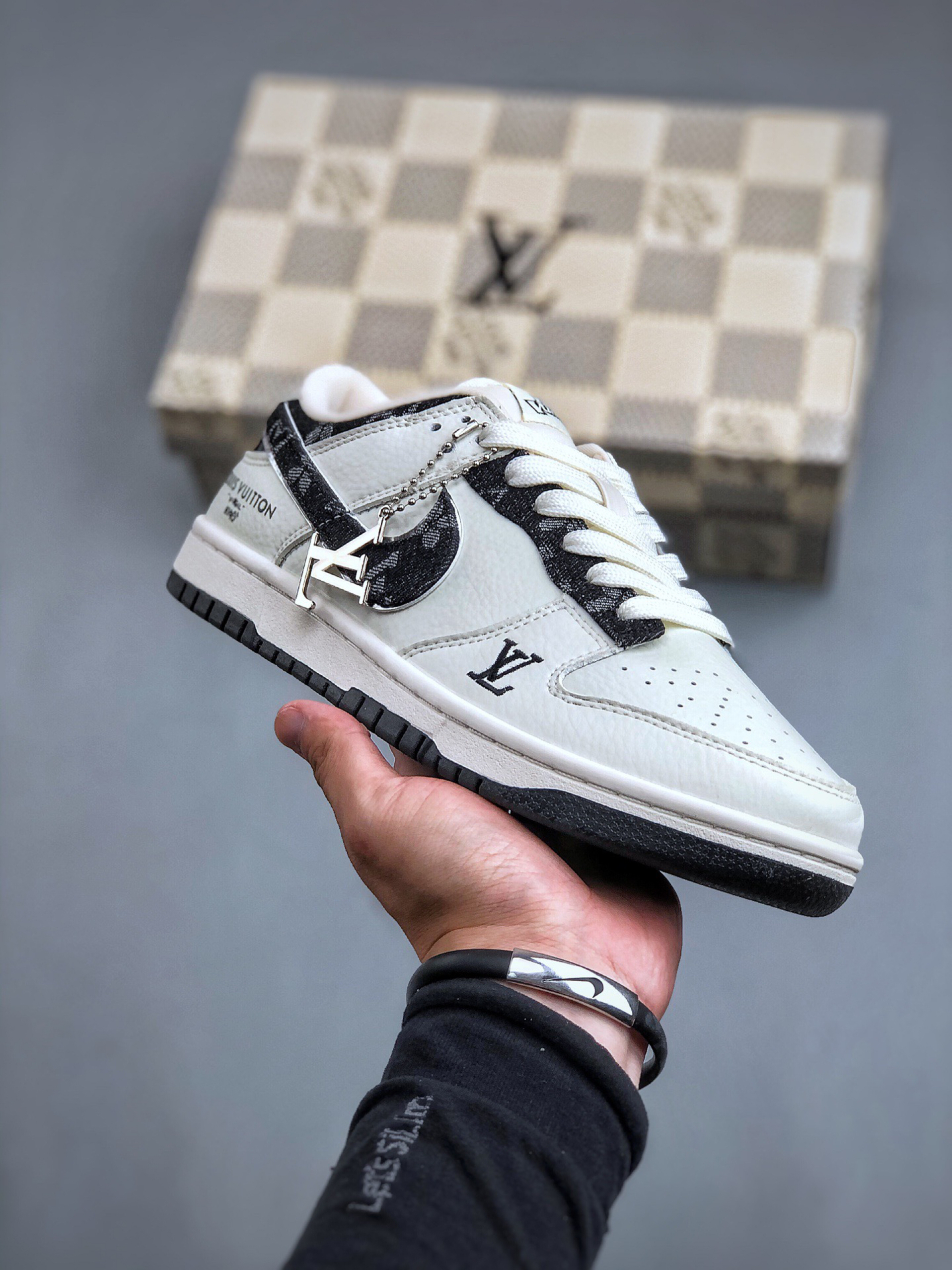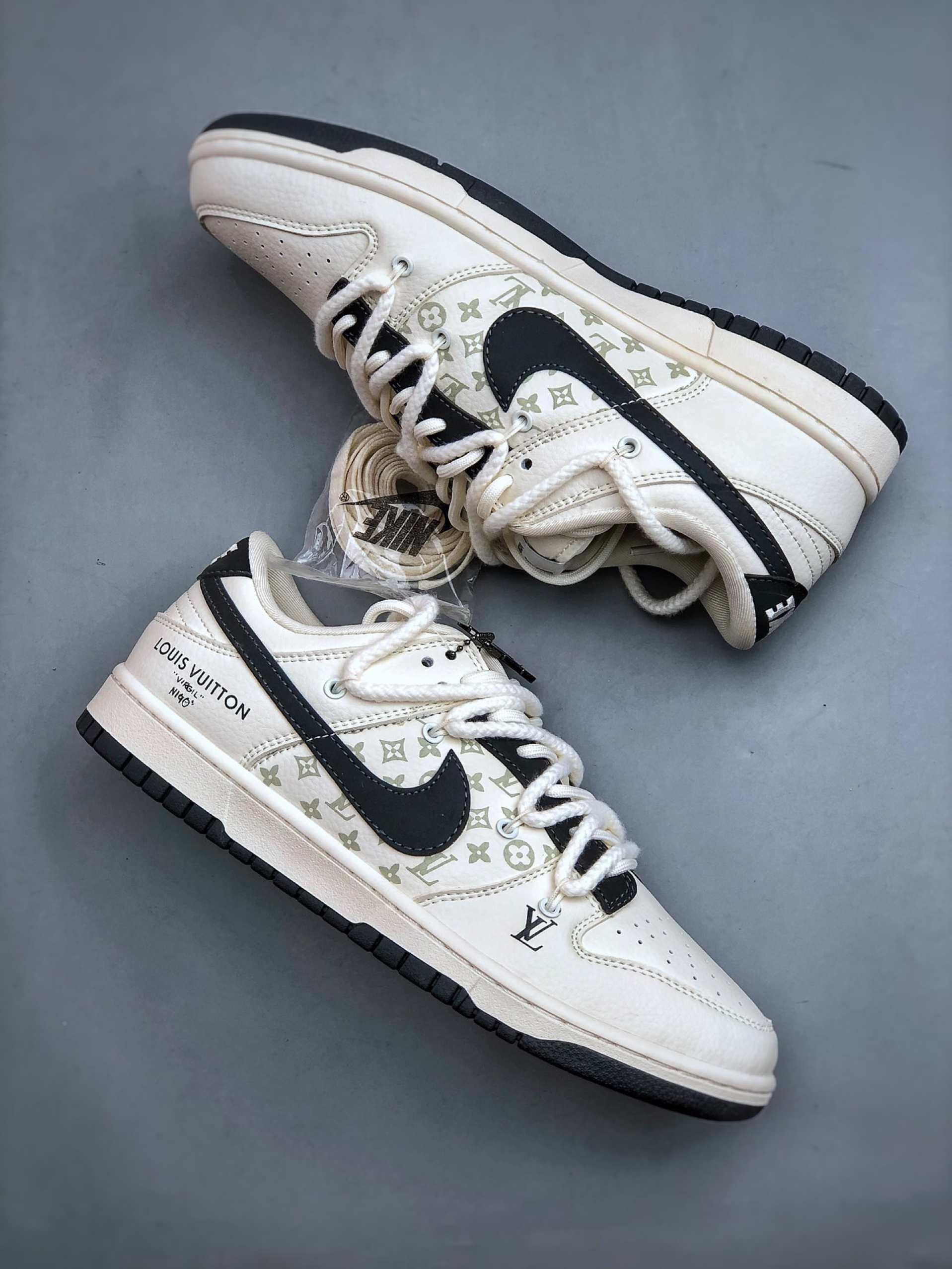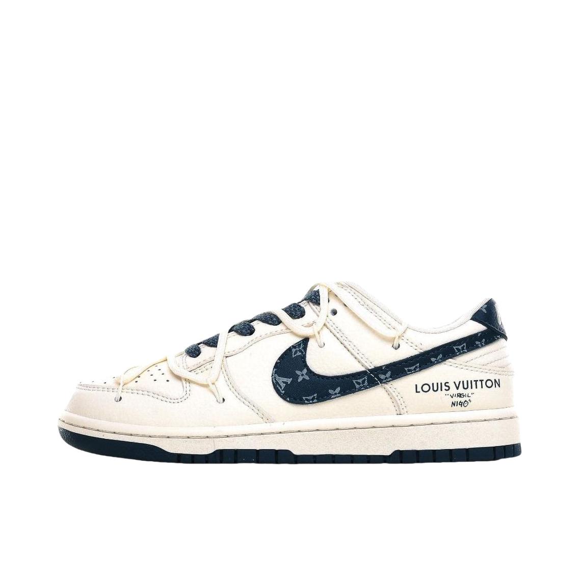 这是路易威登(Louis Vuitton)与耐克 Dunk Low 联名的定制款球鞋👇 外观✨ 四双都融合 LV 经典元素与 Dunk 鞋型,风格超独特~左上黑白老花拼接,LV 标志性 Monogram 图案+金属饰件,高级又街头;右上灰绿撞色,翻毛皮+植绒 Swoosh,复古质感拉满;左下满印老花+做旧细节,潮流玩家一眼爱;右下白蓝清新配色,搭配 LV 挂饰,清爽又有辨识度,夏日不管配短裤、...
