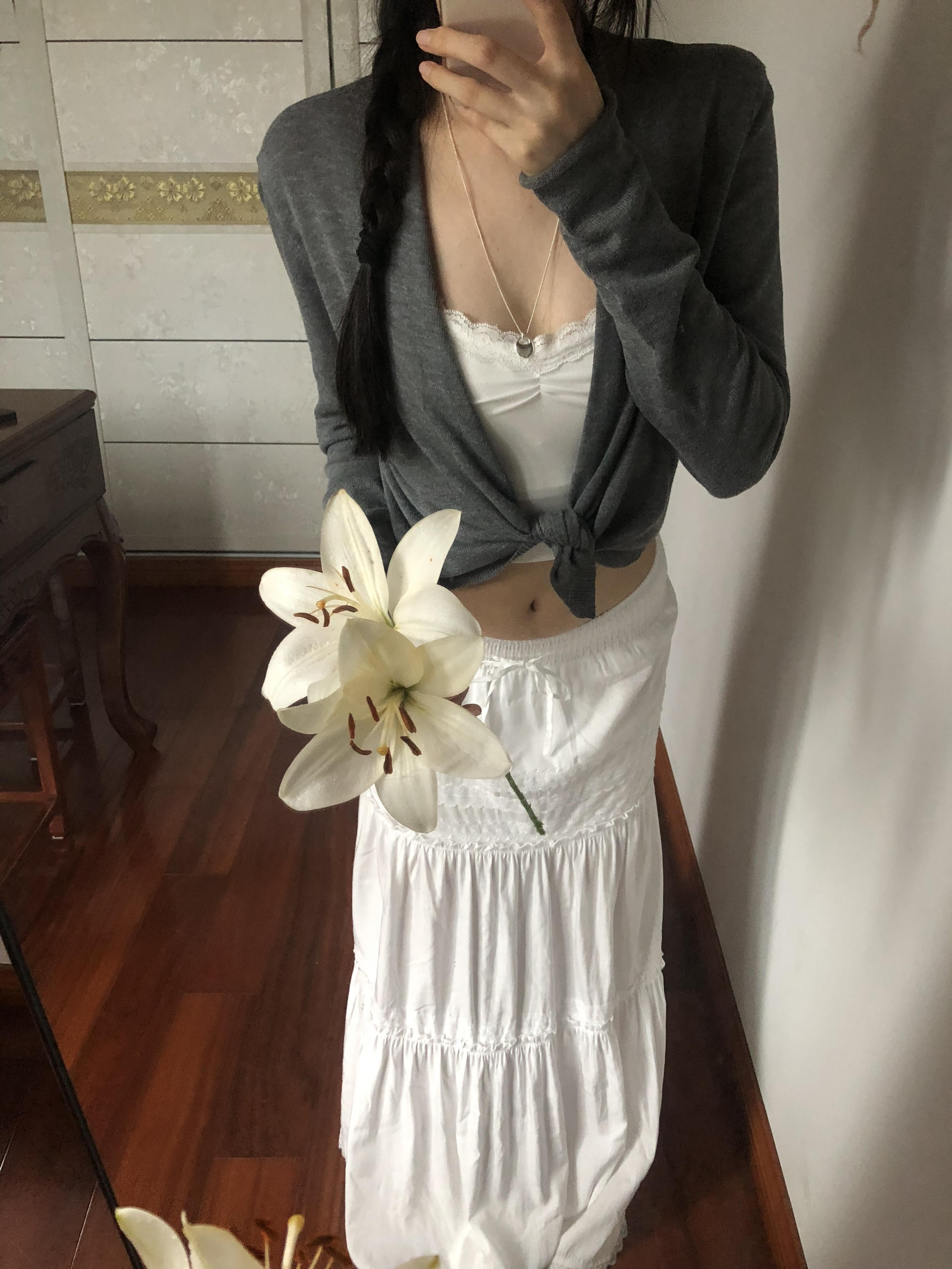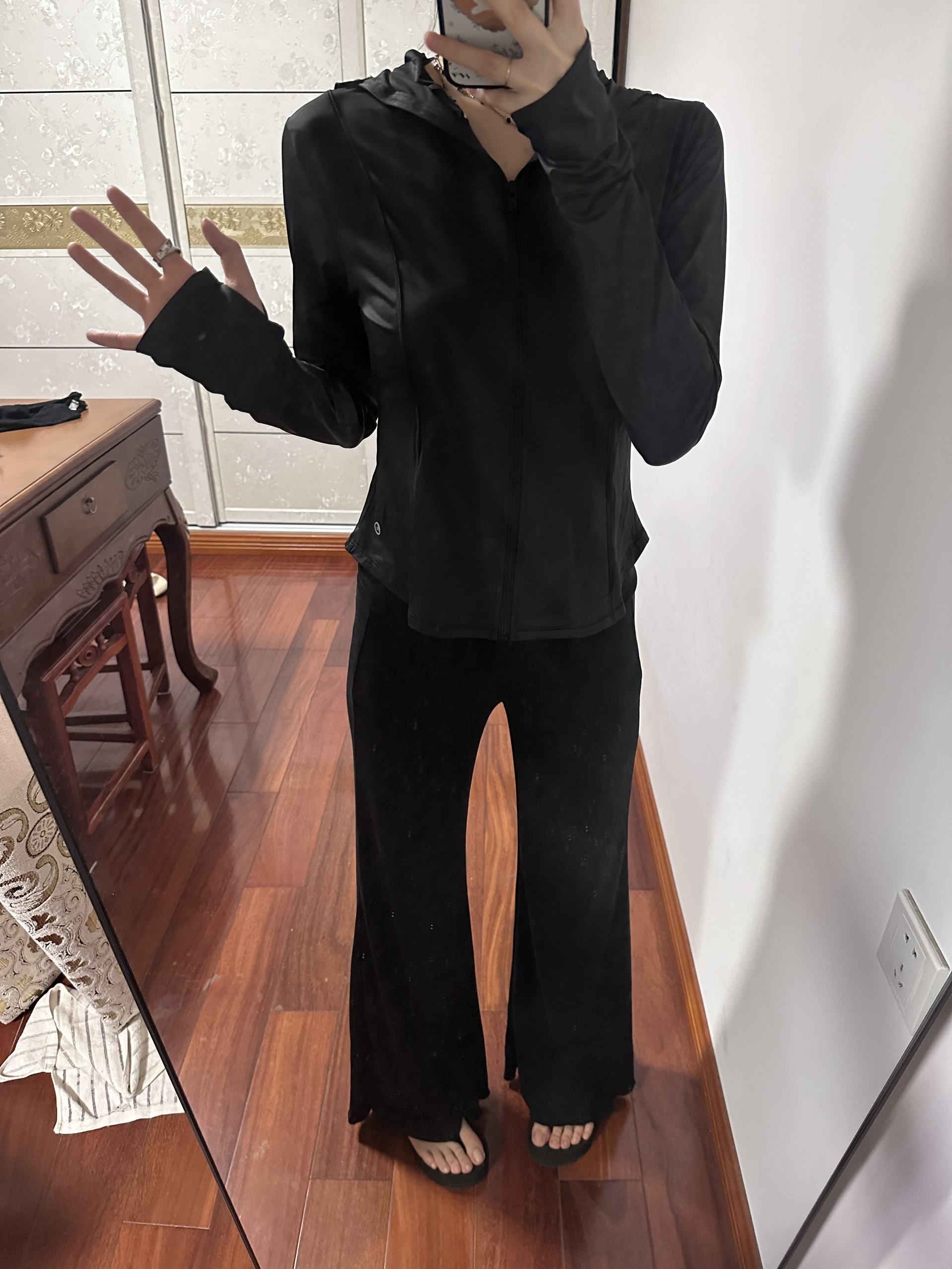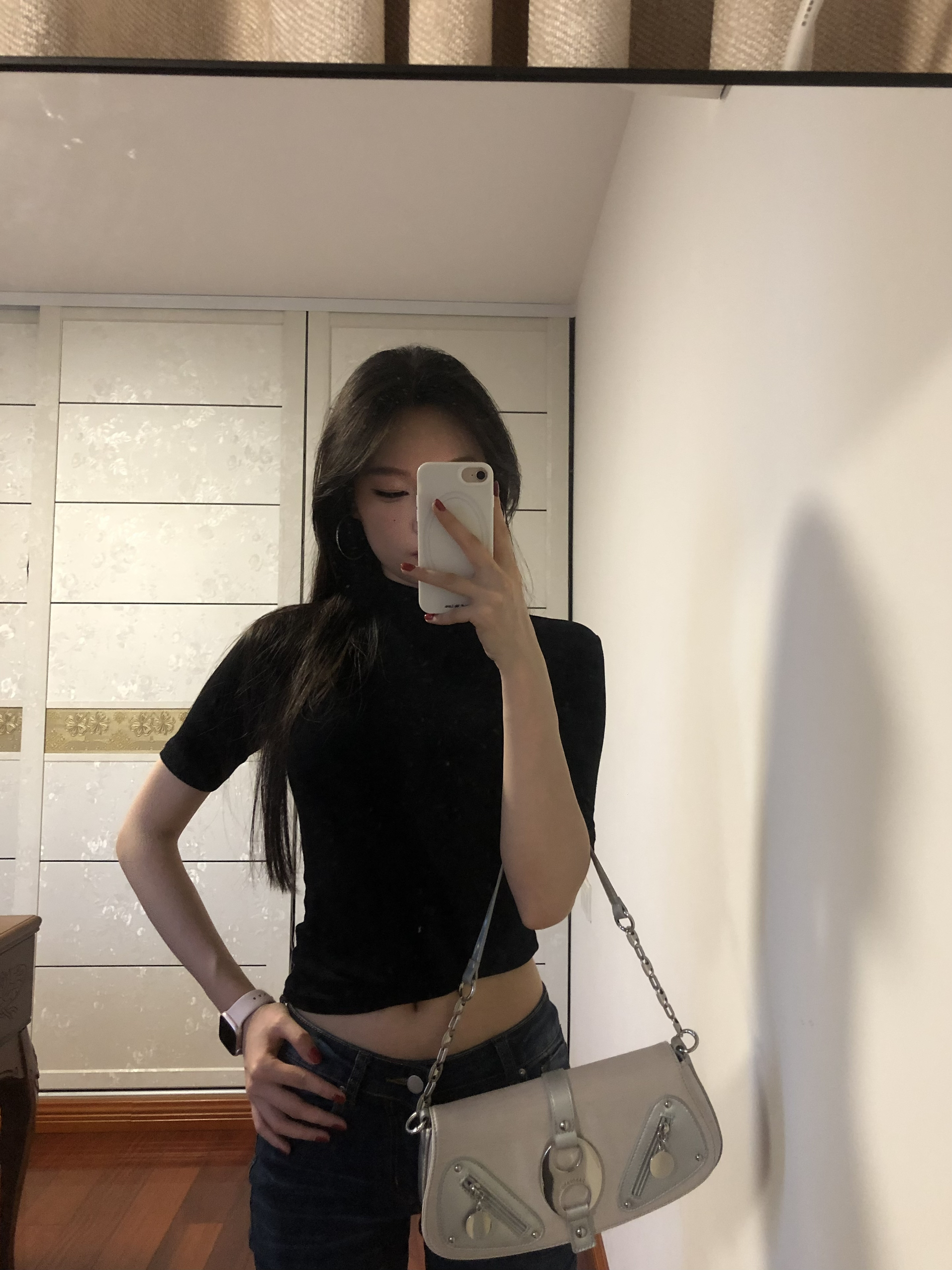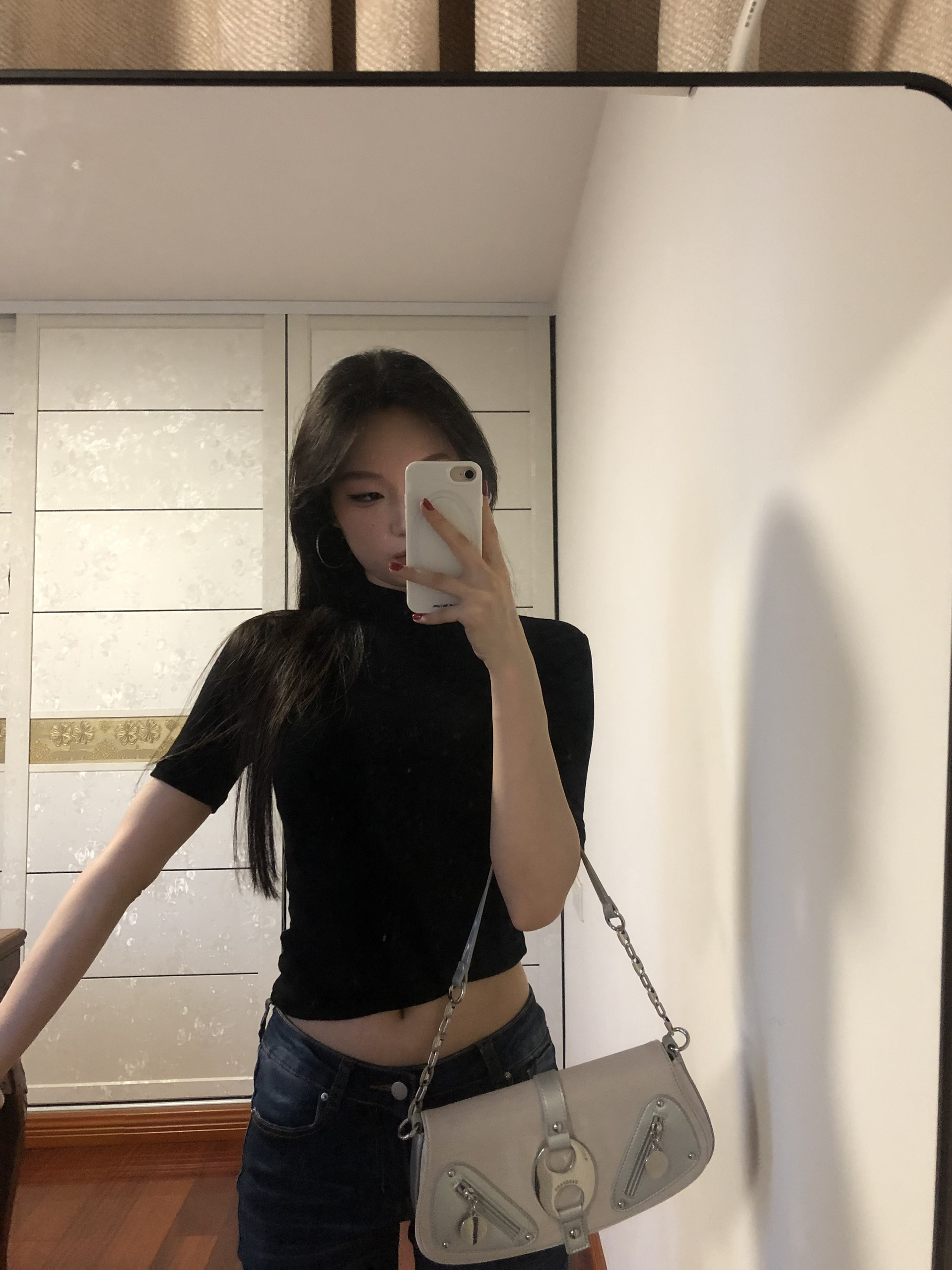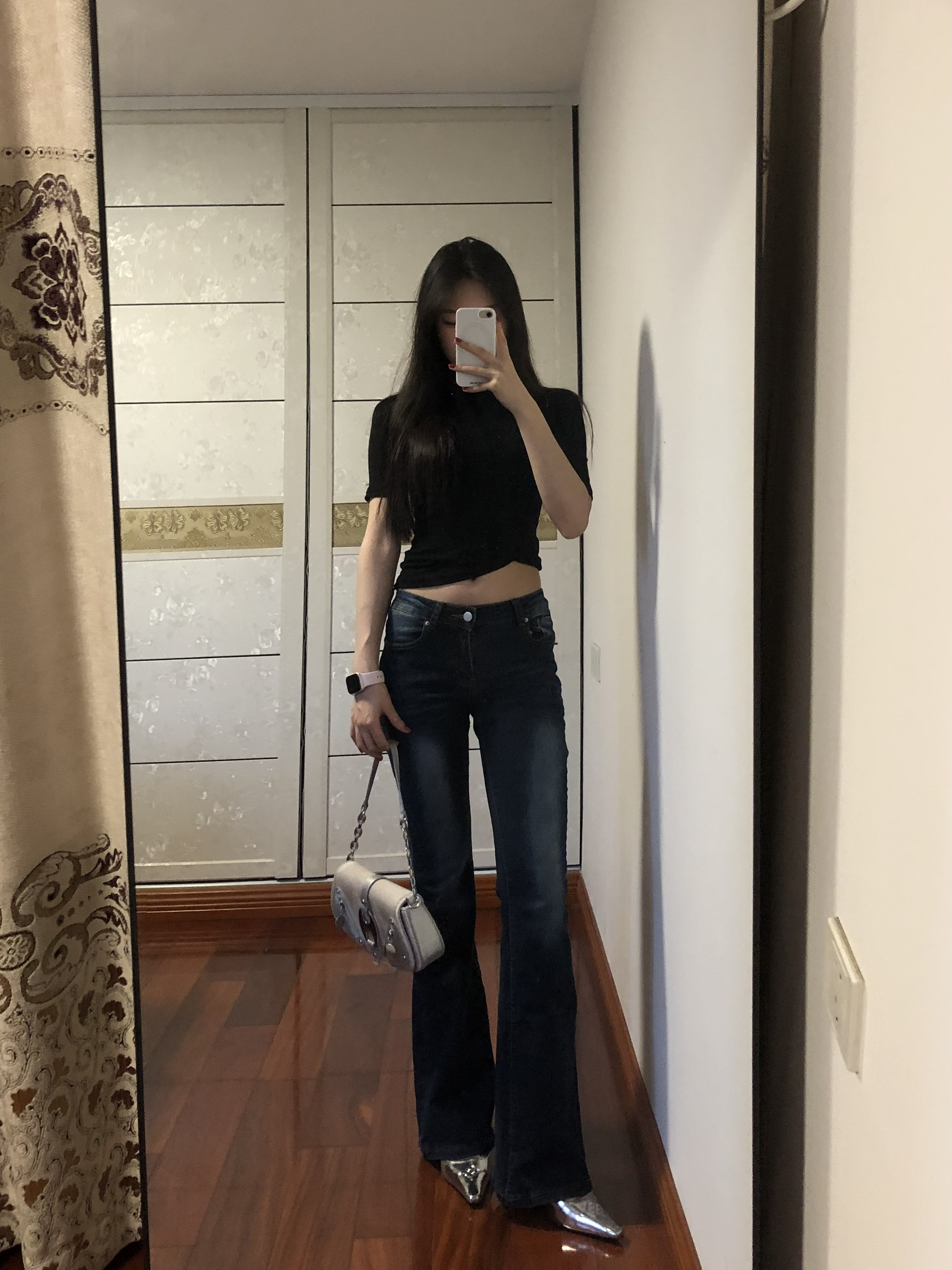 黑短上衣露腰藏肉💅 微喇裤拉直腿型绝了! 银色包包+尖头鞋呼应,日常又带辣,懒人直接抄~