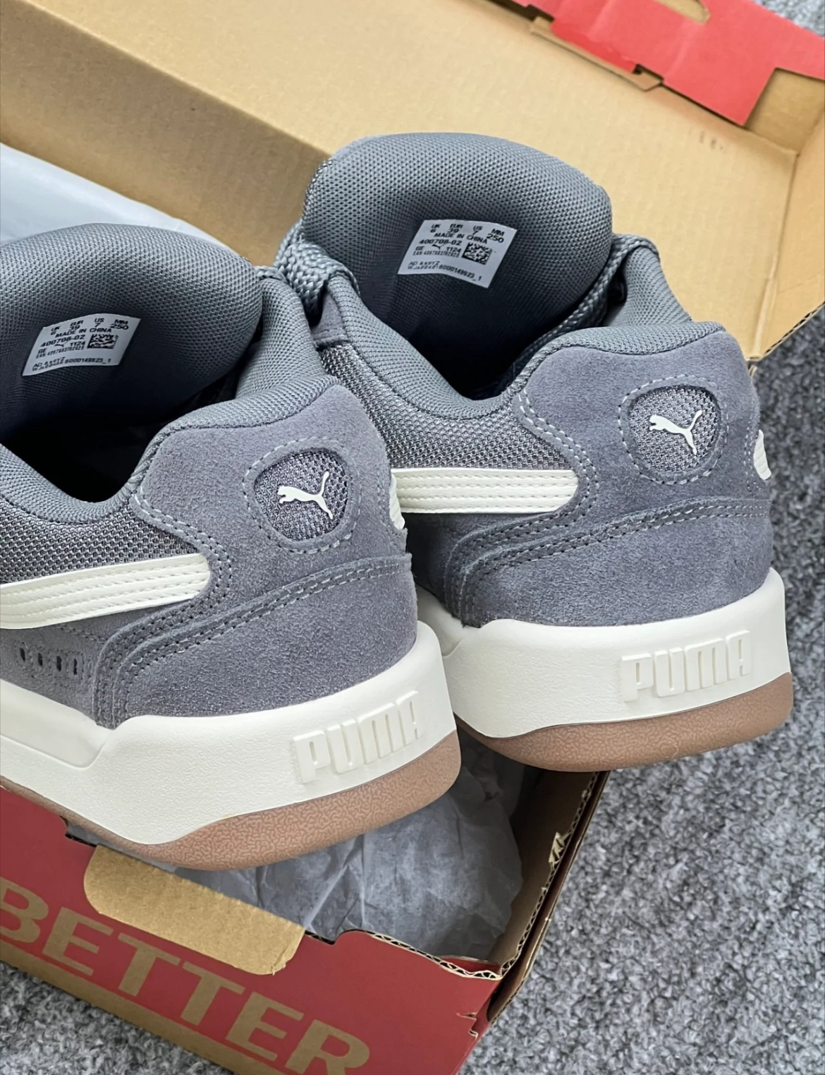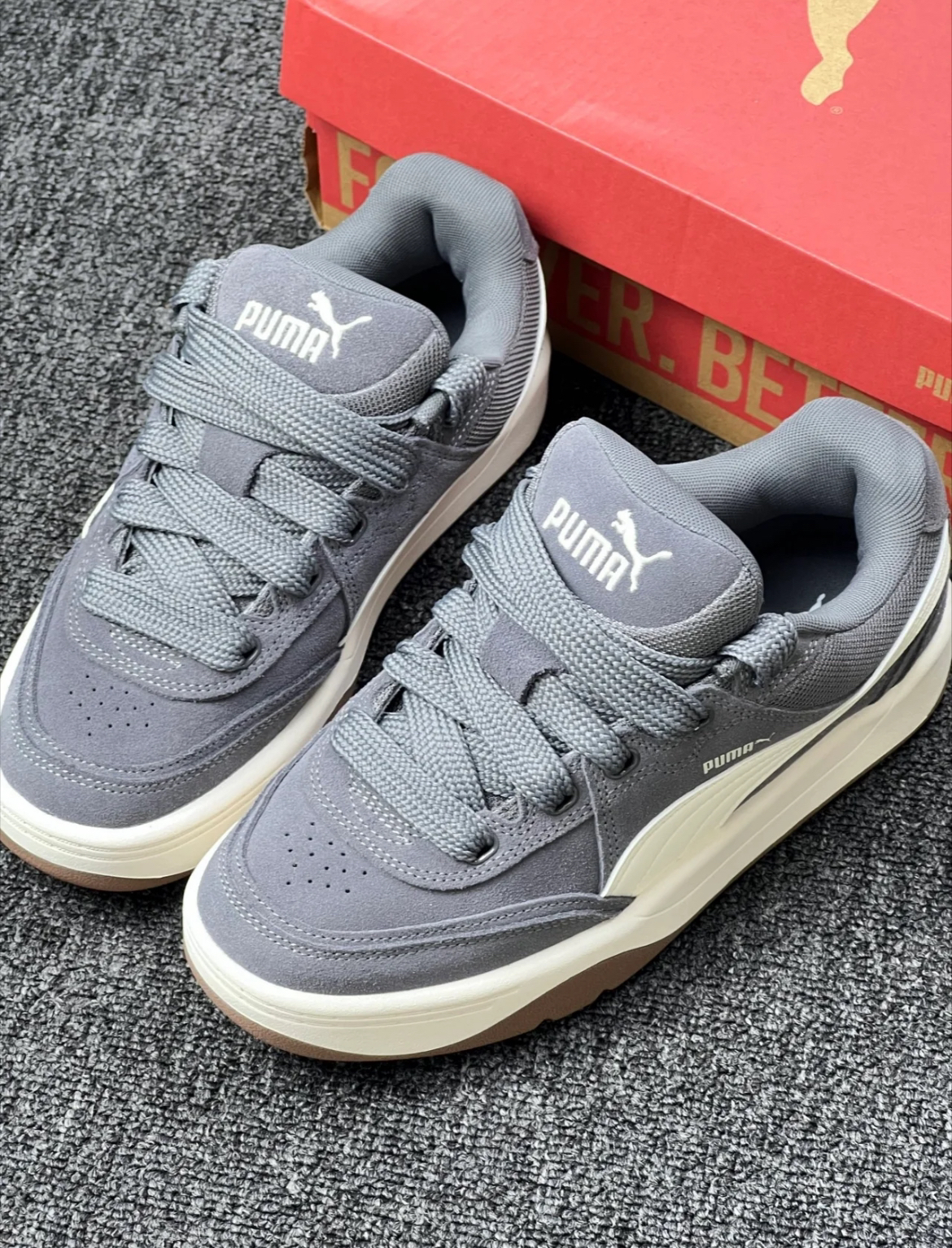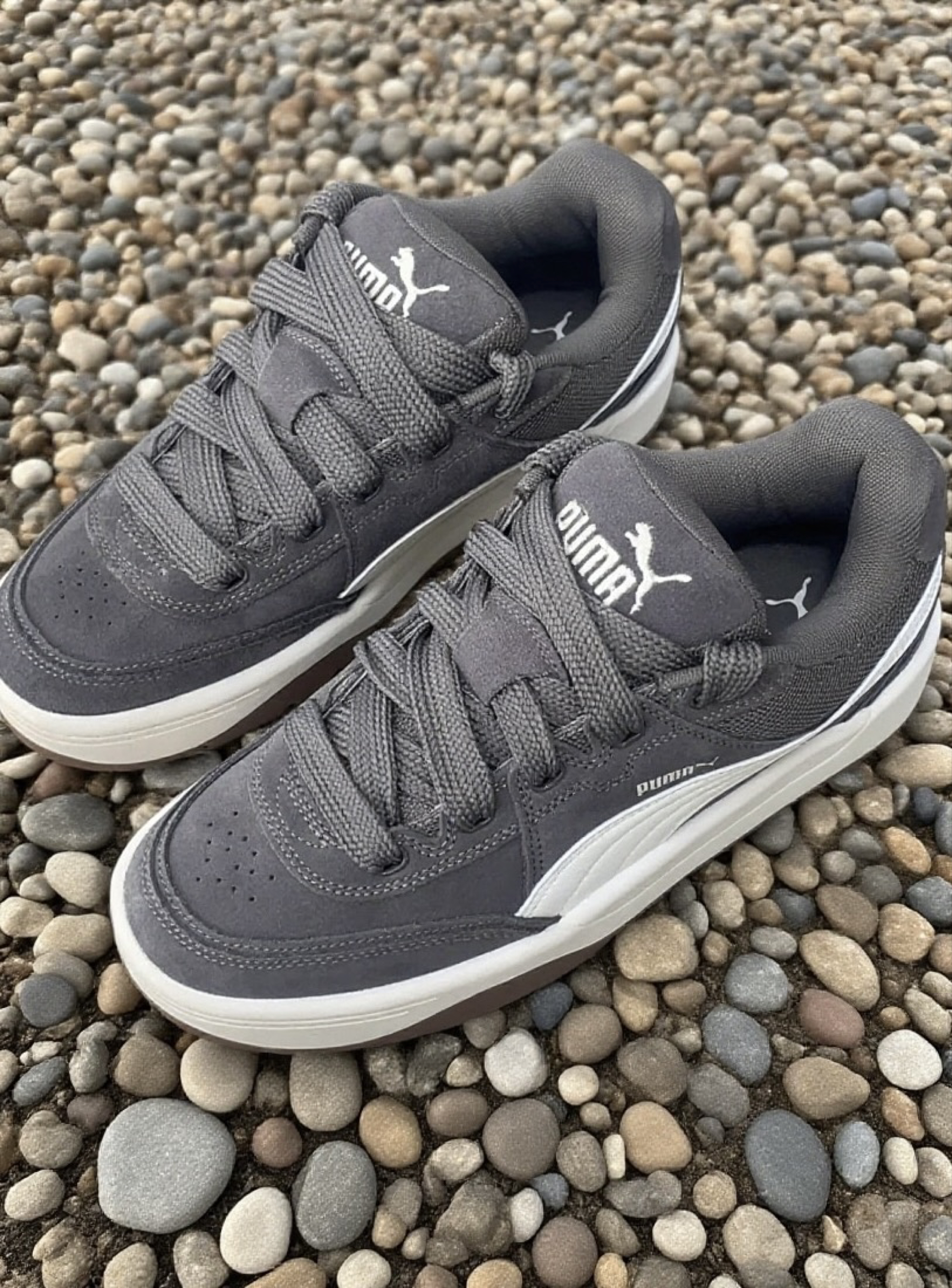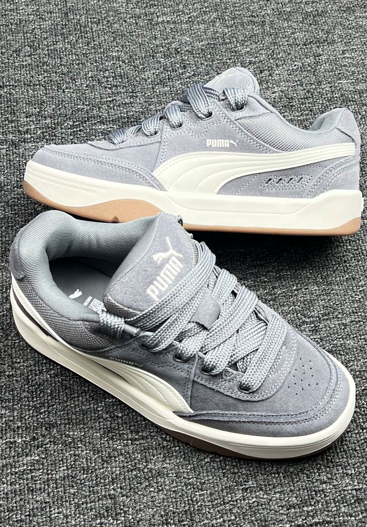 这双男女同款的灰色板鞋真的绝了!经典低帮设计怎么搭都不出错,浅灰配色自带高级感滤镜,像我日常穿牛仔裤、运动裤甚至小裙子都能无缝适配,随手一踩就能出门,妥妥的「穿搭万能钥匙」!鞋面是超有质感的帆布材质,柔软透气不闷脚,暴走两万步都不会磨脚踝,舒适度直接拉满! 别看它是薄底设计,抓地力和耐磨性一点不含糊!橡胶大底轻盈又防滑,不管是压马路、逛街还是运动都超稳当,轻便到像踩在云朵上!侧边经典的PUMA跑...