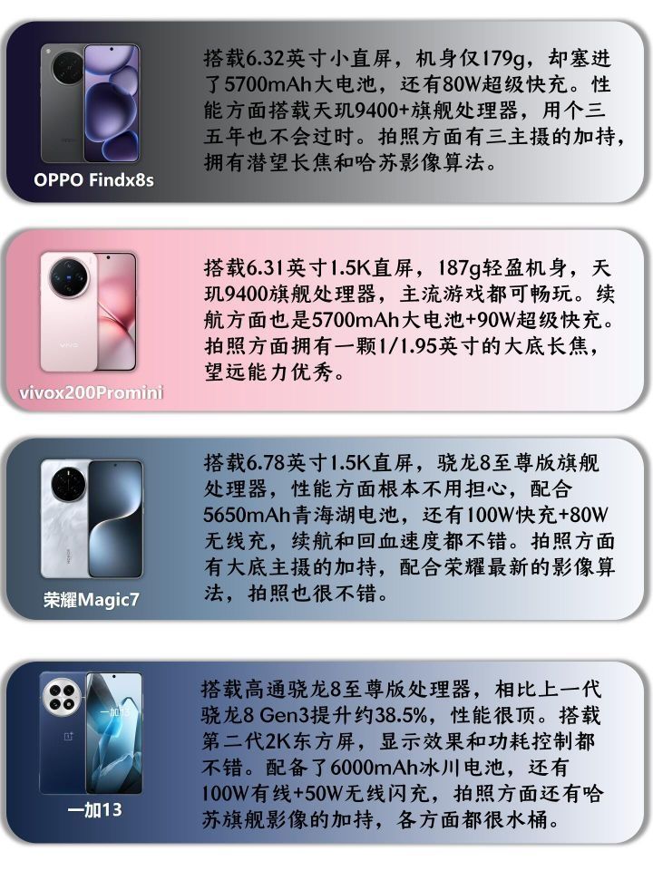 数码党看过来!OPPOFindX8s、vivox200Promini、荣耀Magic7、一加13 ,四款新机参数大起底,购机不纠结👇 性能上,OPPO和vivo搭载天玑9400系列,荣耀、一加则是骁龙8至尊版,都配LPDDR5X + UFS4.0 ,运行流畅没在怕💪 屏幕各有特色,OPPO 6.32英寸1.5K直屏、vivo 6.31英寸1.5K直屏、荣耀6.78英寸1.5K直屏,一加2K曲屏...