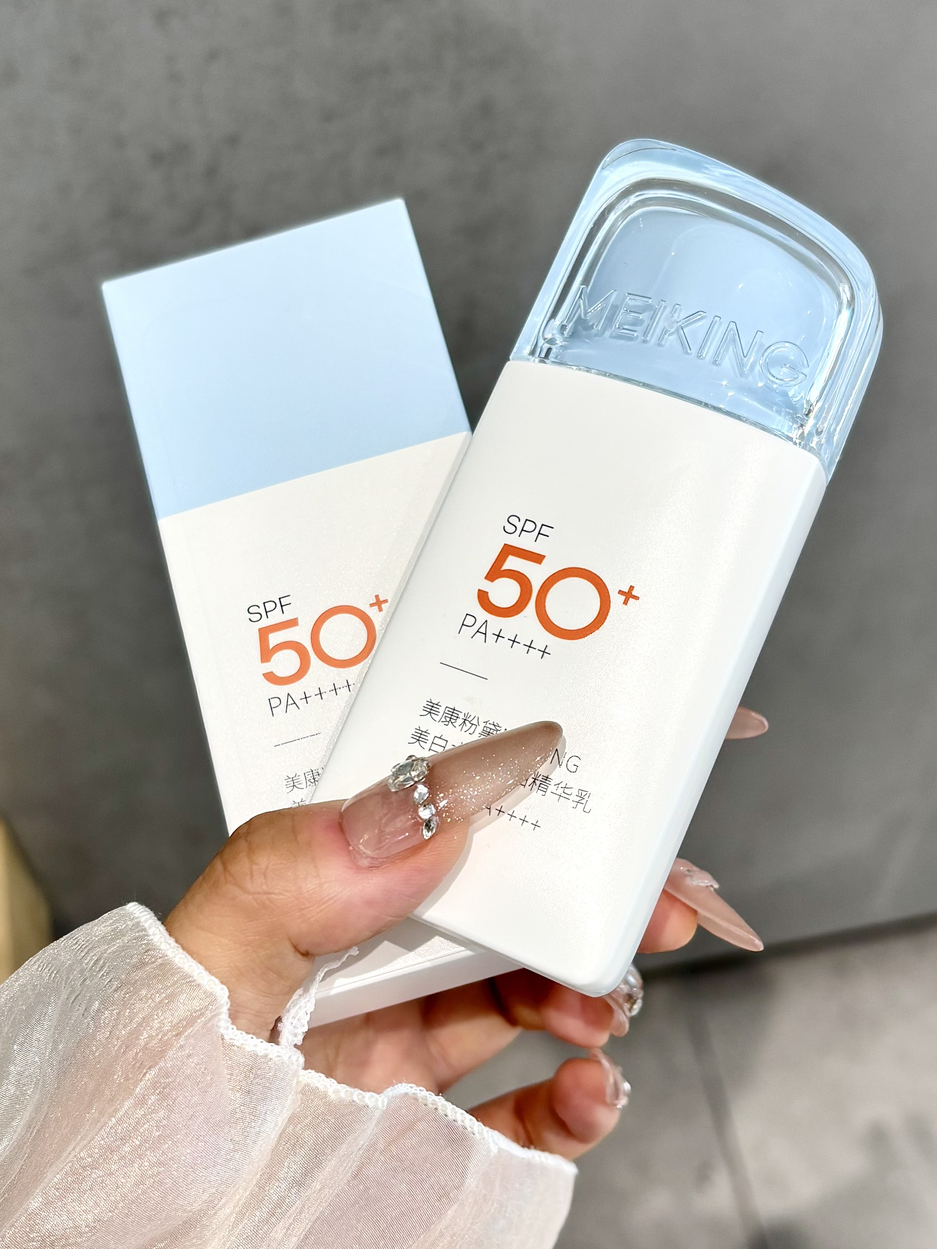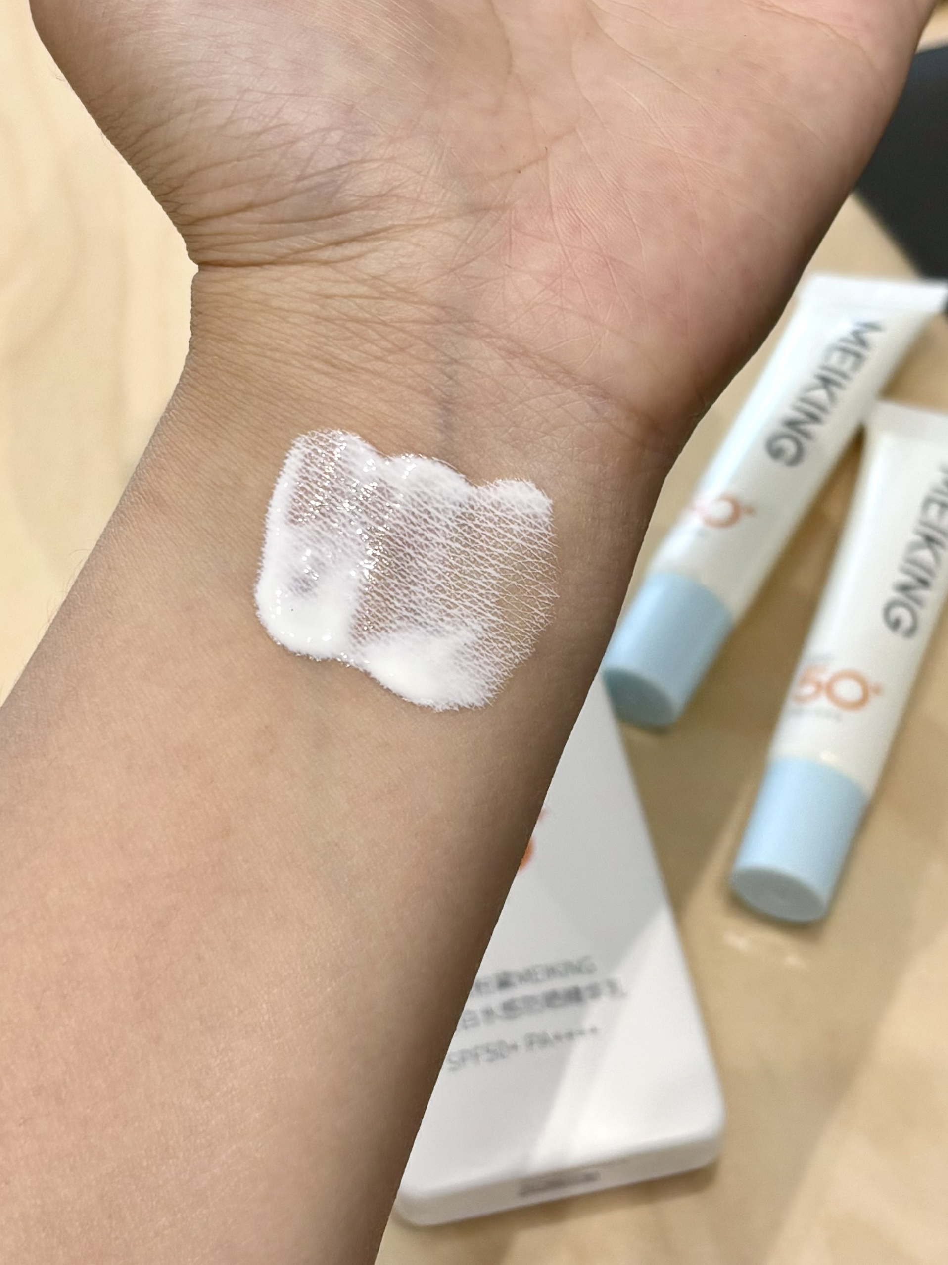 最近发现的介个美康粉黛的美白防晒精华乳,感觉还不错哎 我试了一下蛮轻薄好推开的,也不会粘腻 抹开没多久就成膜了 SPF 50+ PA++++的高倍防晒 有了它这个夏天可不怕晒黑啦~