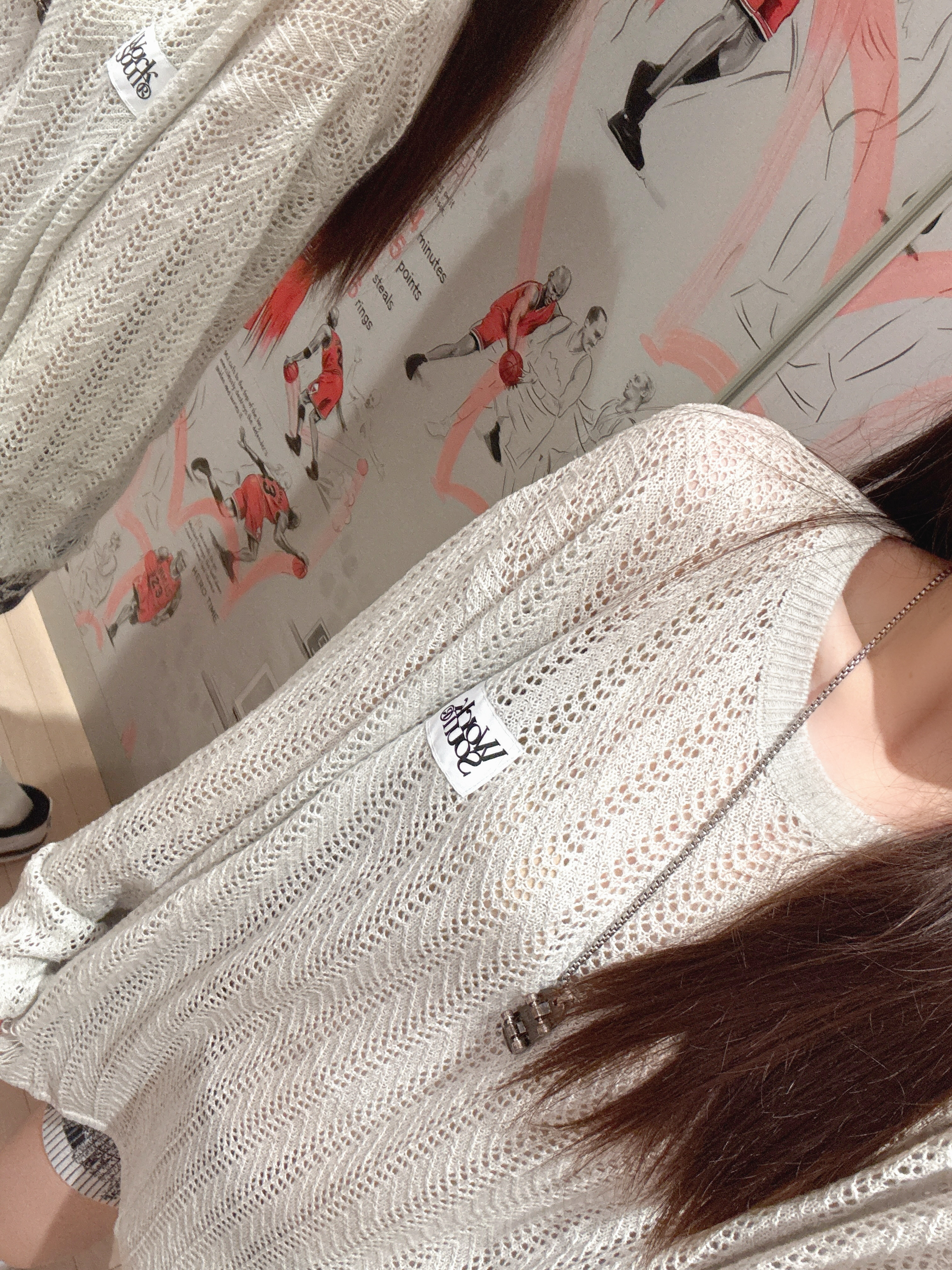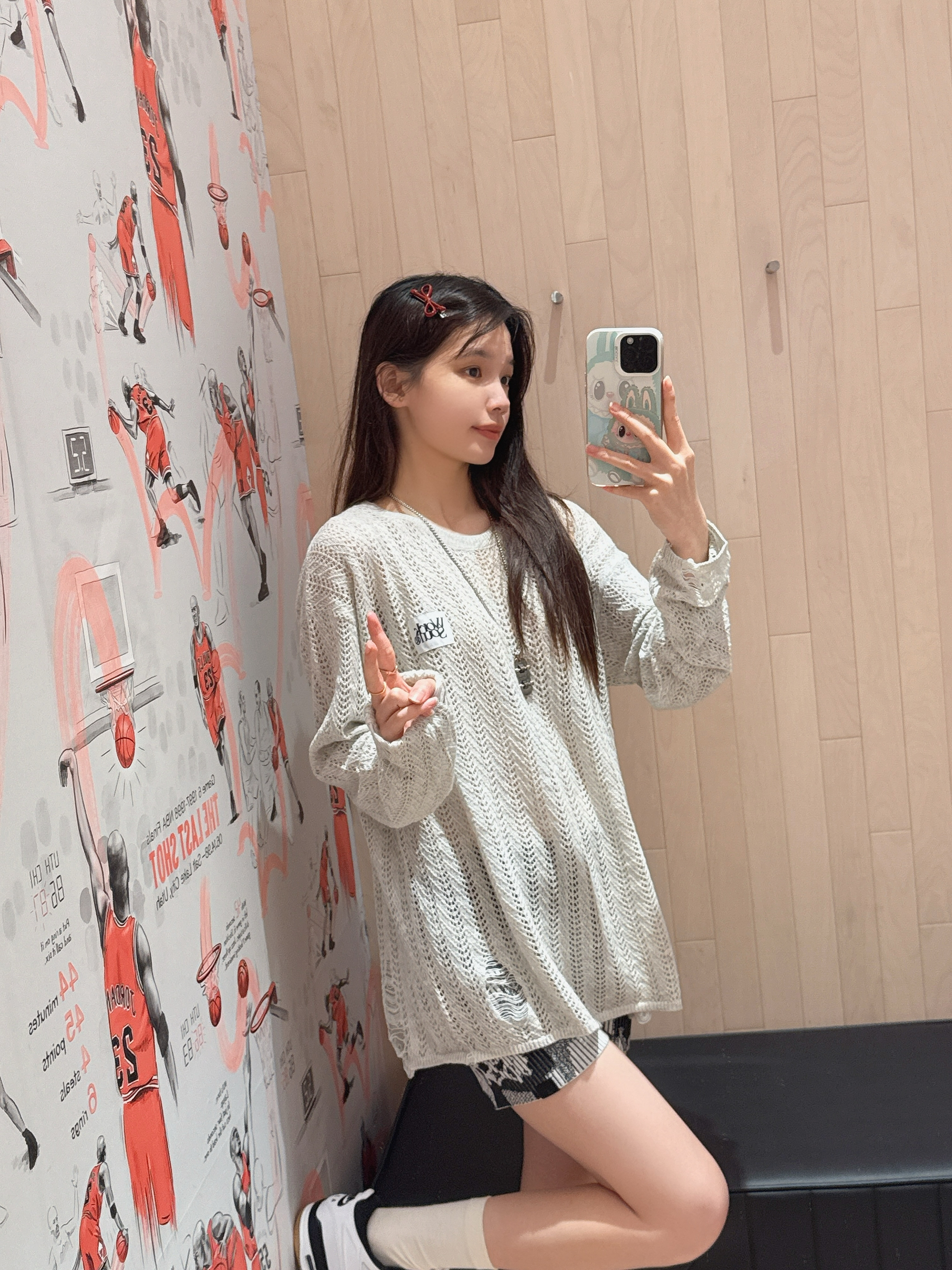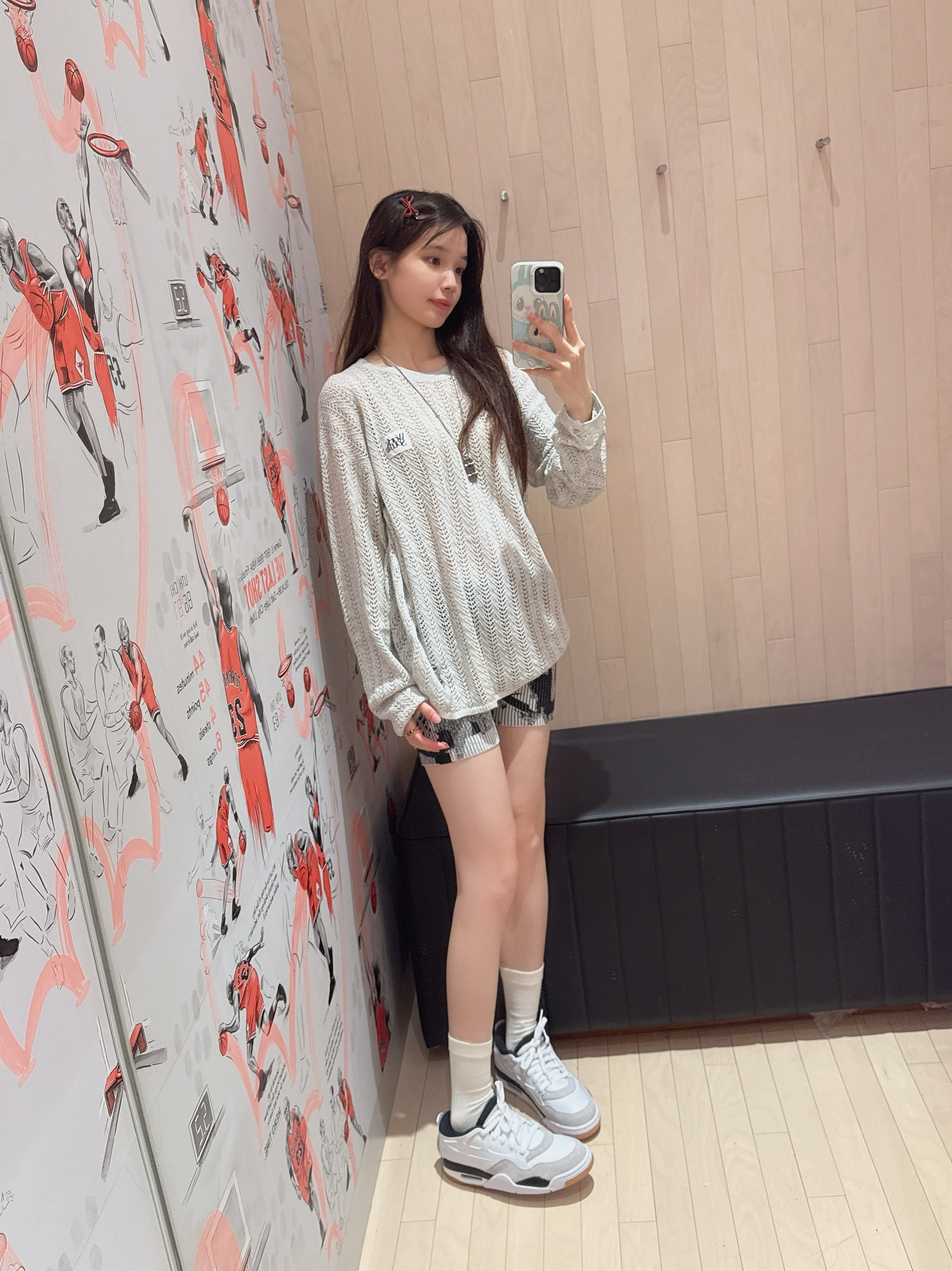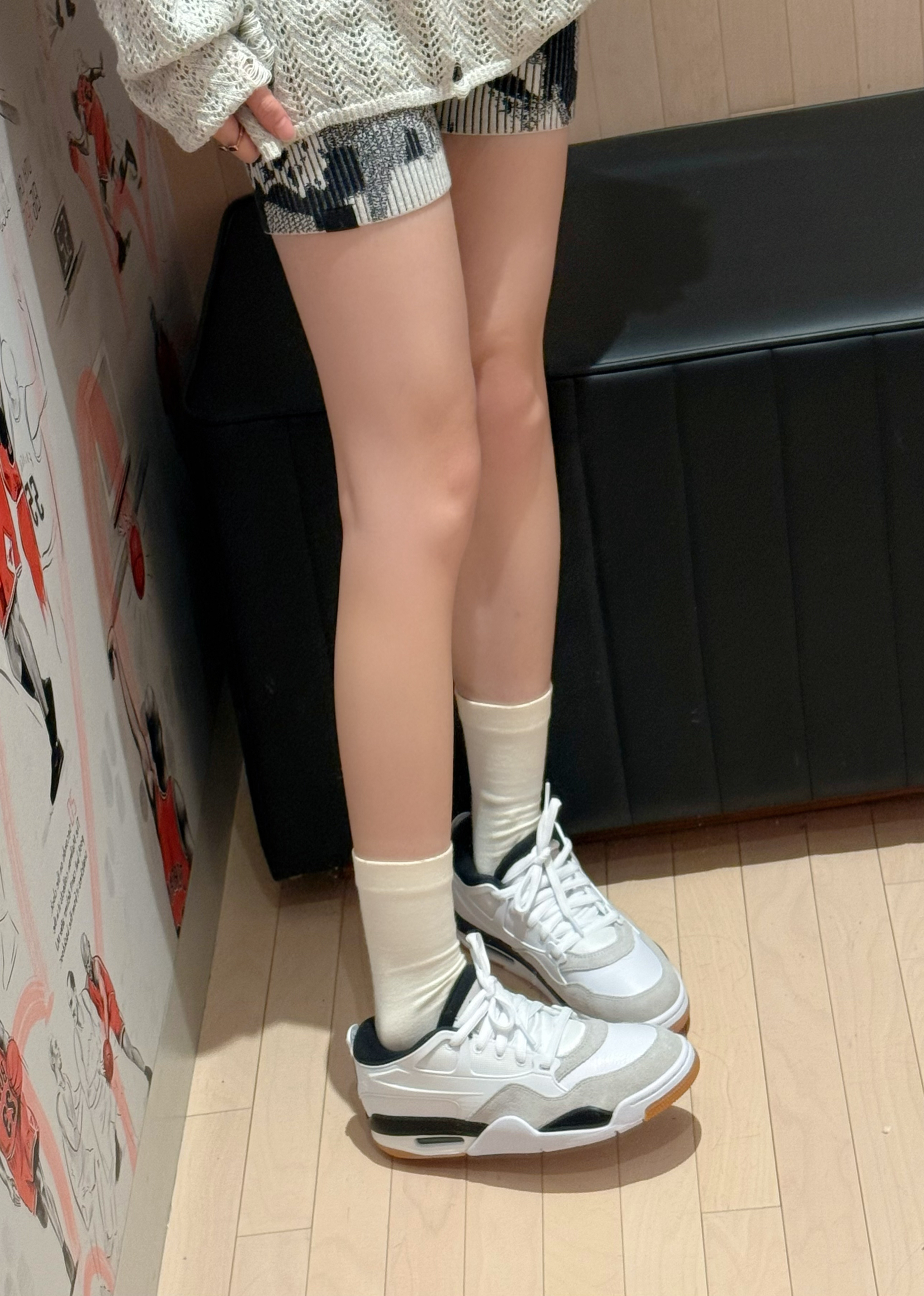 今日穿搭米灰色上衣➕短裤 👚是 WORKSOUT 🏠滴! 做了镂空🧶针织衫上身很舒适 日常当防晒衣也很不错😌 搭配裙子或者休闲裤都👌呢! 👧166/43kg M码 👟是AJ4RM的新配色黑白配 日常百搭神器!