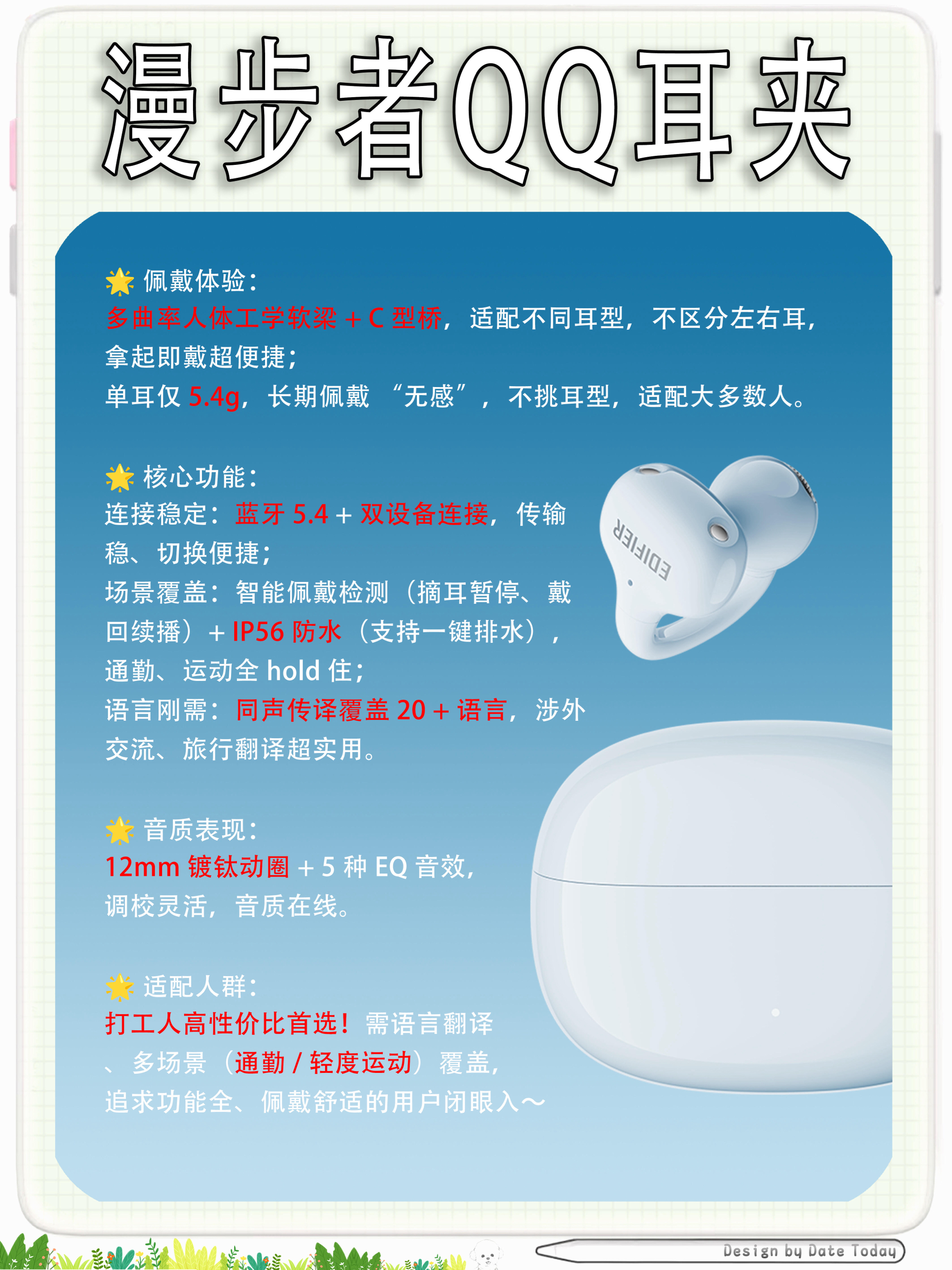 🎯 漫步者QQ耳夹 ✅ 不区分左右耳,拿起即戴,自动校正声道!直接对标华为千元款功能,200 + 价位杀疯了! ✅ C 型桥可调节,镍钛合金丝裹软胶,捏一捏适配耳型,“QQ 耳夹” 名不虚传,久戴不痛! ✅ 双向随声译,20 + 语言实时翻译,APP 支持肩对肩 / 面对面交互,出差、学外语秒变翻译官! 参数硬实力:12mm 发声单元 + 蓝牙 5.4,单耳 5.4g 轻若无物,8h 单耳 + 3...