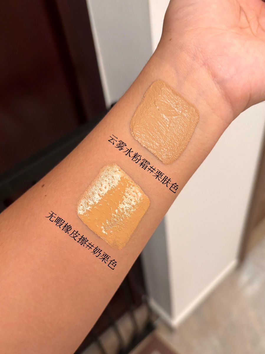 本人黄五白,混油皮容易出汗🥵 图1️⃣用的是修可芙橡皮擦奶栗色 适合黄3.5-4白的姐妹,比较正的黄调 刚上脸是微微提亮的妆感 傍晚就有点氧化暗沉但很贴肤 鼻翼两侧会轻微脱妆,还好看不太出 持妆效果也不错,不用二次补妆 性价比🉑,整体还是很推荐混油皮入手 - 干皮推荐修可芙的云雾水粉霜04 栗肤色要比奶栗色深一个色号 ⚠️不是黄黑皮真的不要买!!! 色号属于黄调里带点粉的那种 橄榄皮不推荐,会有点...