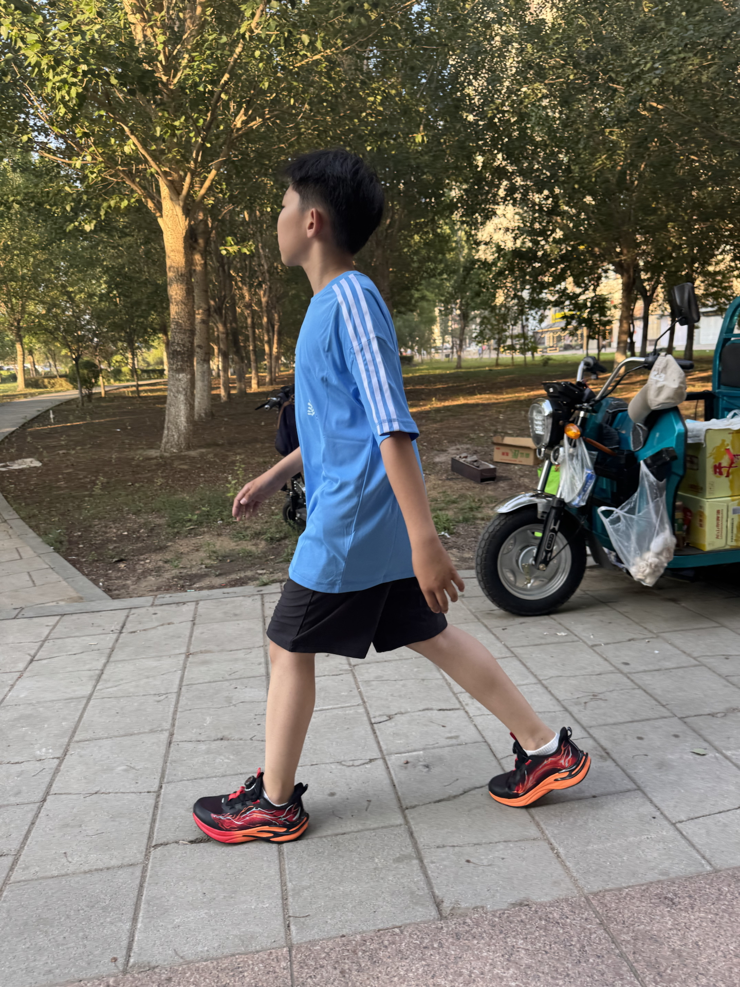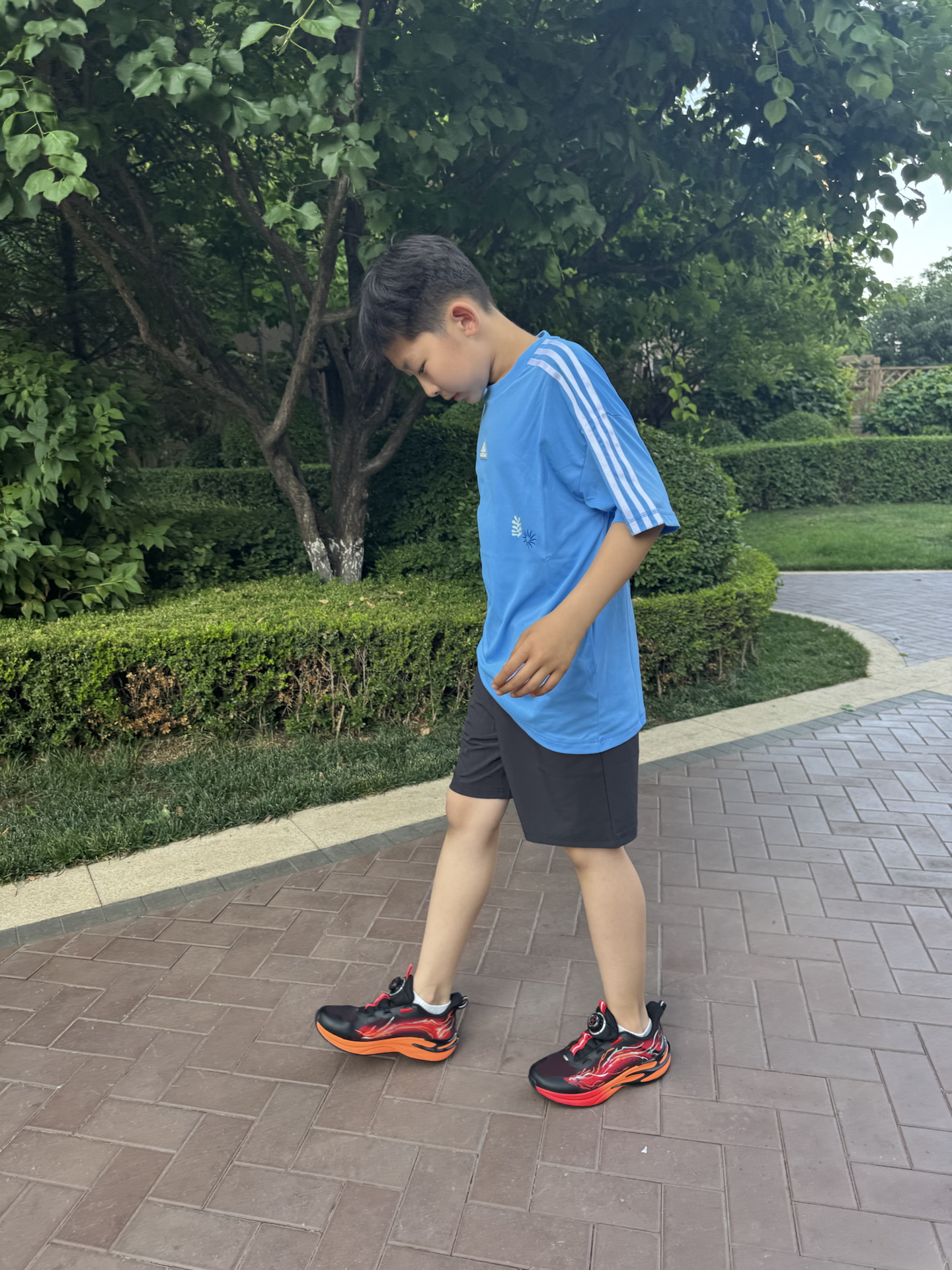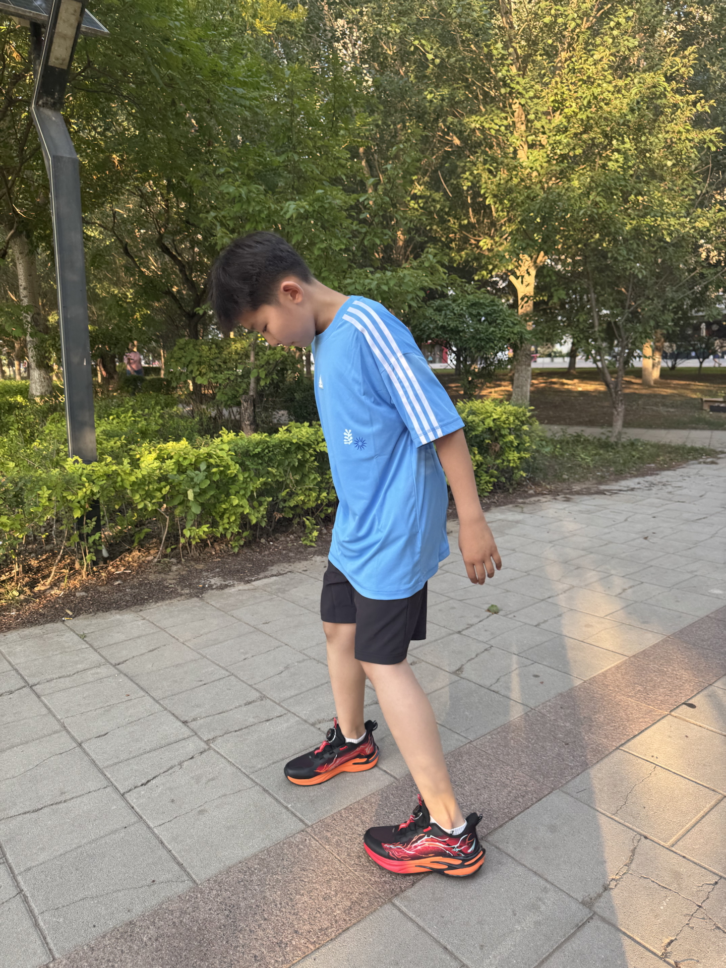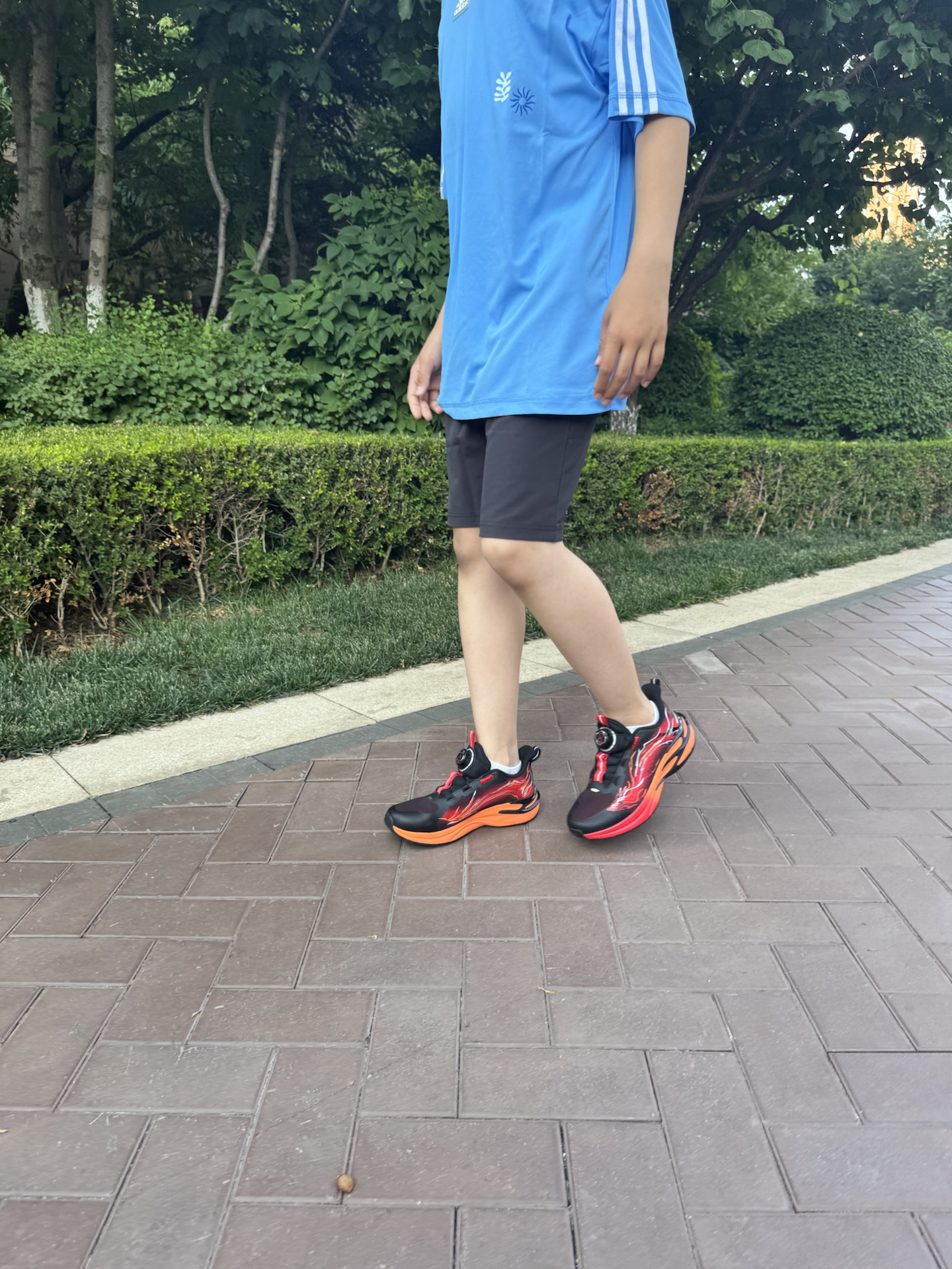 买了新鞋的快乐😃,可能只有小孩子才有,10岁正是疯跑淘气的年龄,踢球⚽️、跳墙、骑车、轮滑🛼、打篮球⛹️,没有他不干的。 今天新买的鞋,马上下楼要试试,自己欢快的不得了,看起来真的很轻盈,肥脚丫子也能穿,还不用系鞋带,一拧即穿,很适合现在的淘气包,颜色真的烈焰燃烧,面料不厚,薄薄一层,一年四季能穿到初秋没问题👌,看他开心样子,不只是好看喜欢,是穿着舒服了,孩子不装假,开心🥳快乐就是好。 #宝藏跑...