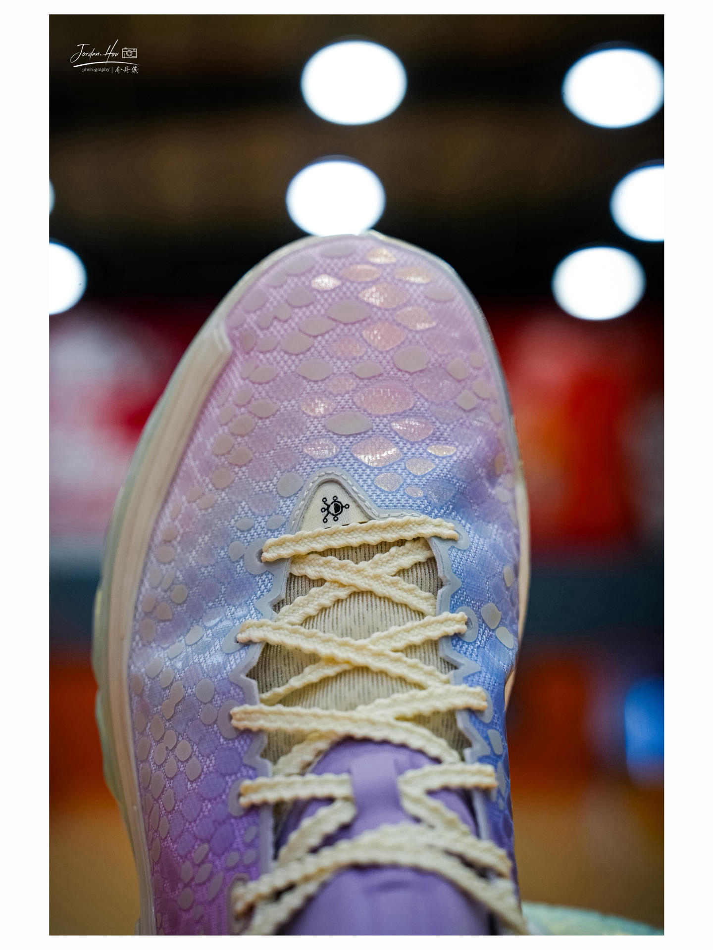 “七彩蟒”鞋面采用MONO纱线与热压工艺打造立体蟒纹结构,在不同光线下呈现青、紫、金三色渐变效果,犹如流动的液态金属。鞋身两侧的动态绑带系统与外侧延伸至后跟的软性TPU形成“肌肉线条”,既强化侧向支撑又赋予攻击性外观。鞋舌与后跟的荧光绿点缀,在夜场中形成视觉焦点,实现实战性能与潮流属性的平衡。