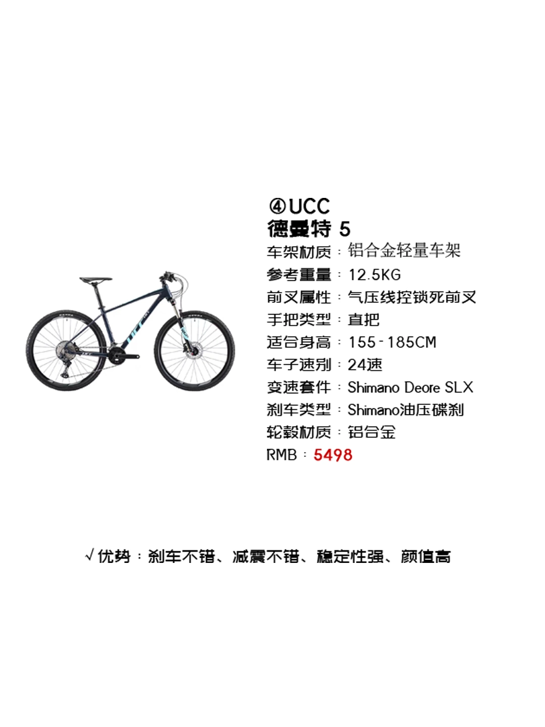 本篇笔记关联了UCC/悠诗诗 德曼特5 变速 轻便 气压 城市自行车 蓝色、TREK/崔克 MARLIN 7 铝合金 硬尾 内走线 轻量化 缓震 越野 山地车 青色海军蓝色渐变、GIANT/捷安特 XTC SLR 3 避震 碟刹 油压 越野 铝合金 山地车 月球岩等商品,为用户提供真实的使用体验和购买参考。