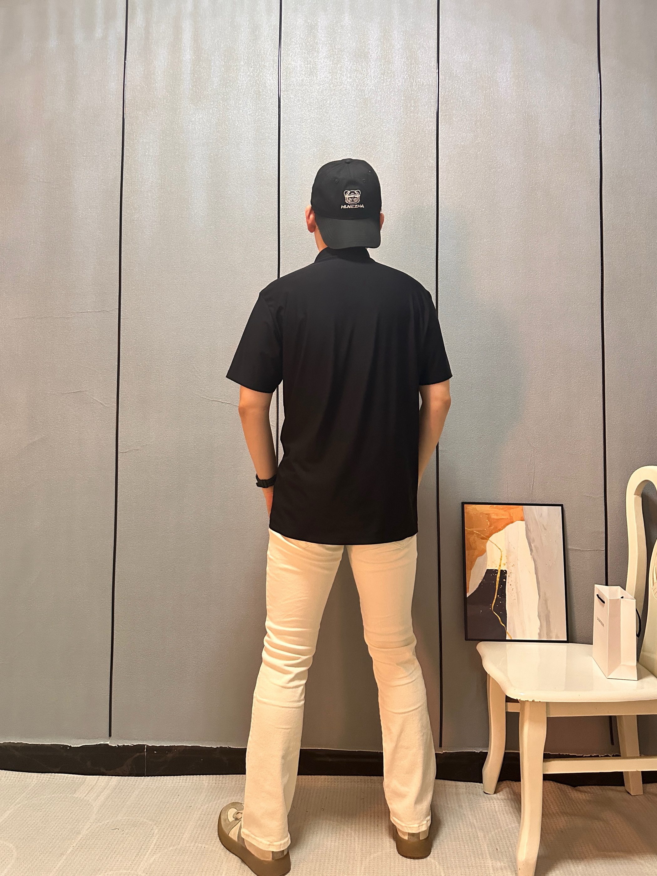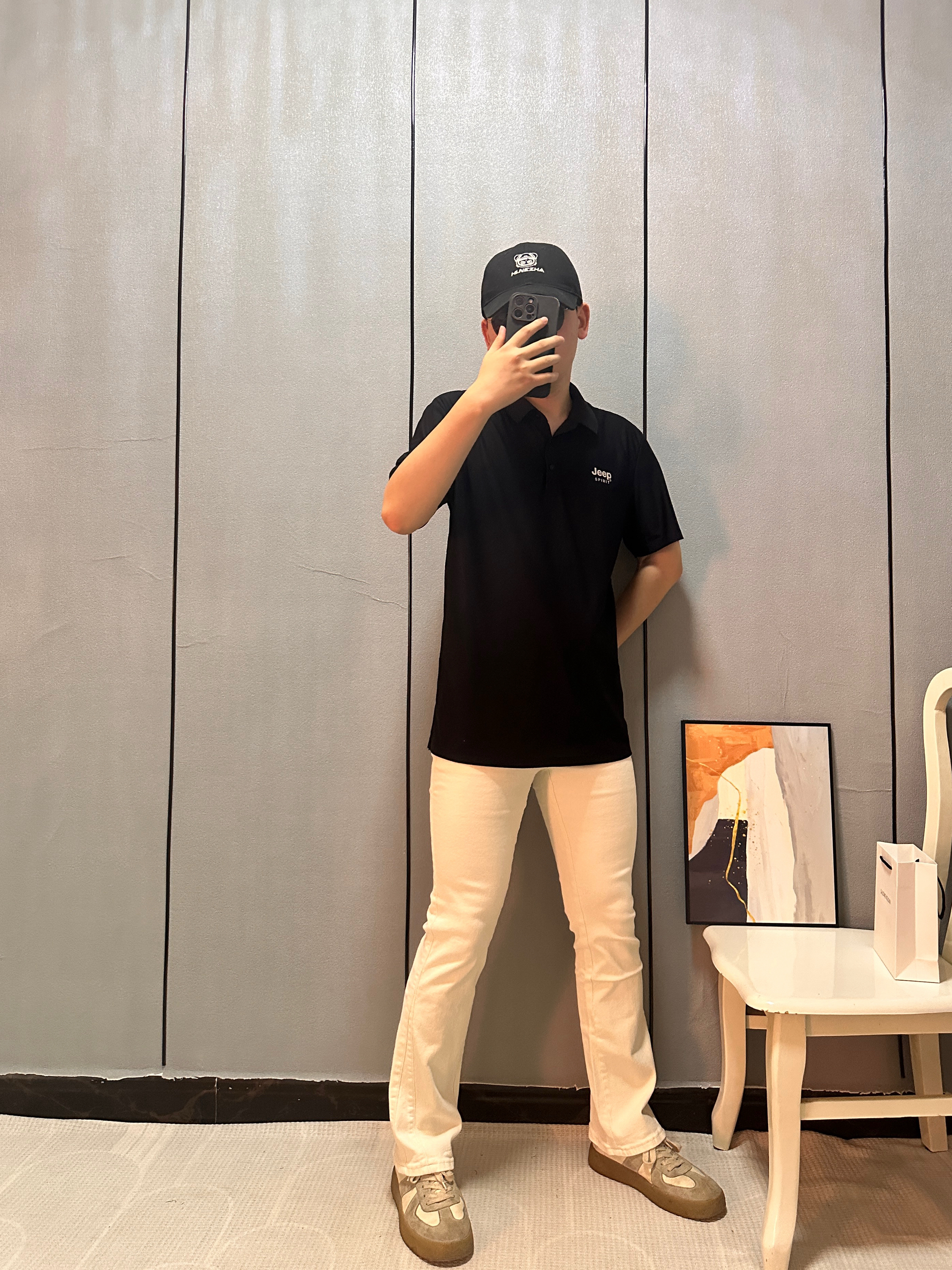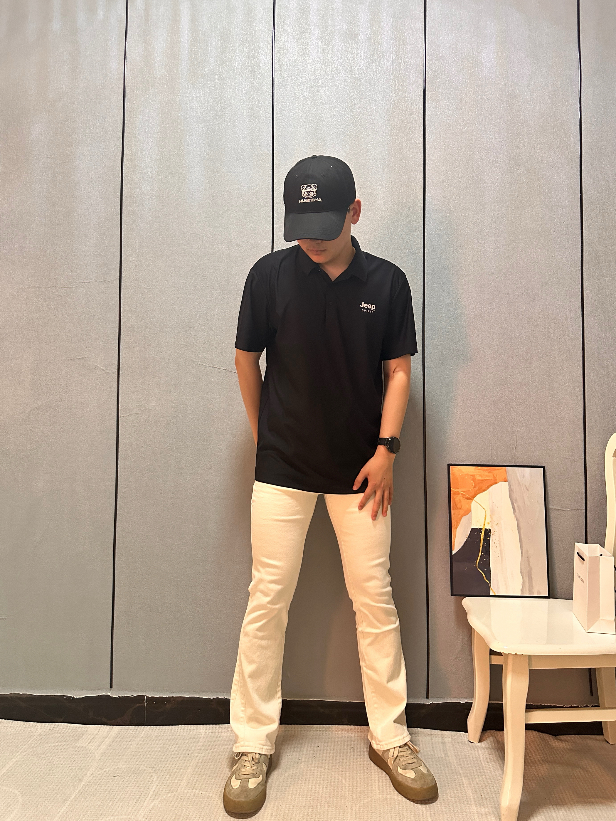 最近发现的宝藏组合! 黑POLO+白喇叭裤 这对CP我锁住了💫 立领Polo领解开一个纽扣 不会太板正又带点小优雅 我比较喜欢这个短袖的螺纹收边 搭配白色牛仔比想象中显瘦! 日常出街自带松弛 周末配棒球帽直接切换模式