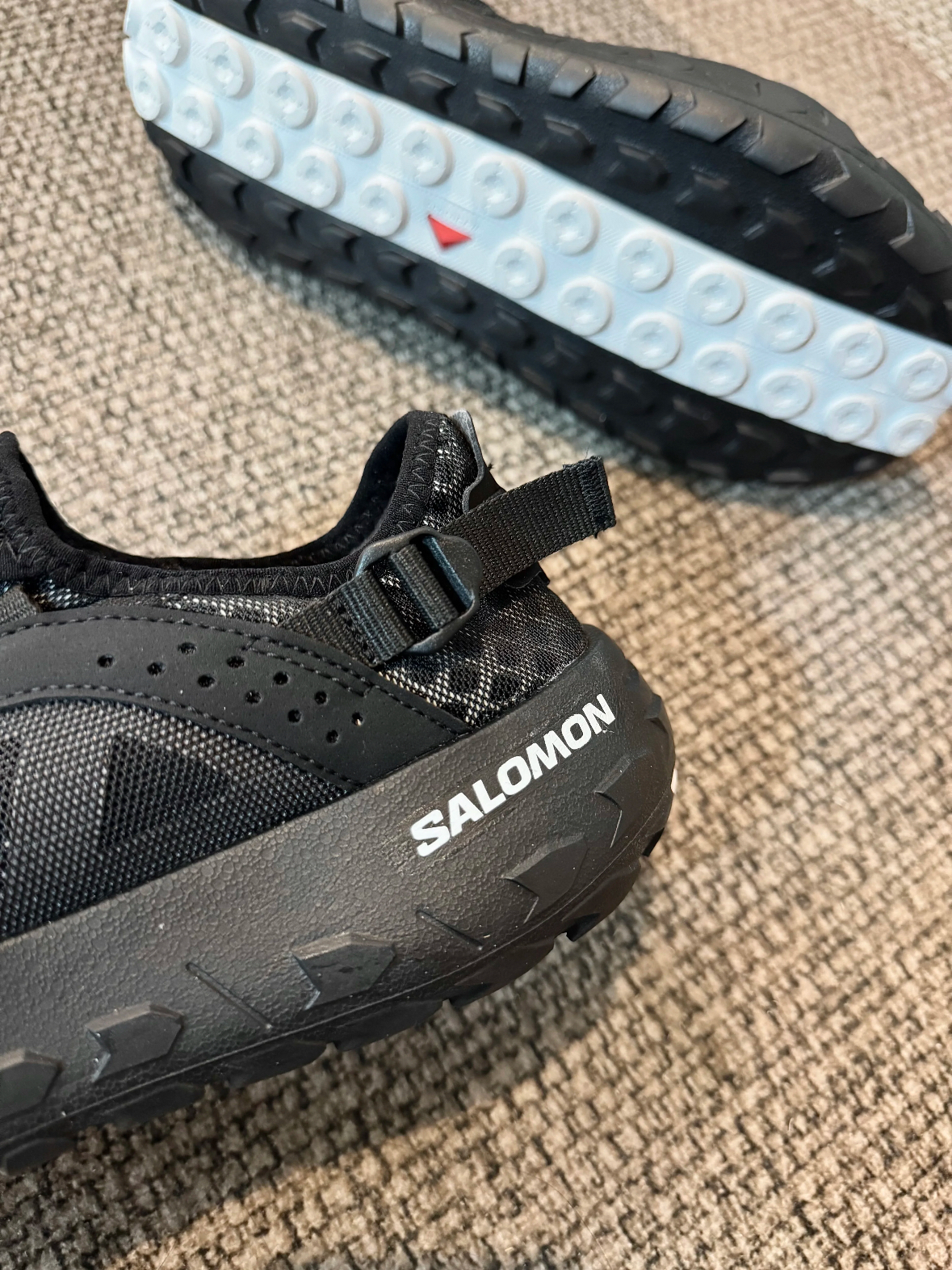 一开始觉得既然叫轮胎鞋估计会很重,但是拿到手了才发现这双鞋是真的一点都不重。 能涉水的鞋面+轮胎底也是第一次出现在溯溪鞋上,其实轮胎底可以更好的涉水,起码踩在礁石上脚不会疼。 脚后跟还有调节带,可以随意调节跟脚程度,功能性算是非常强了