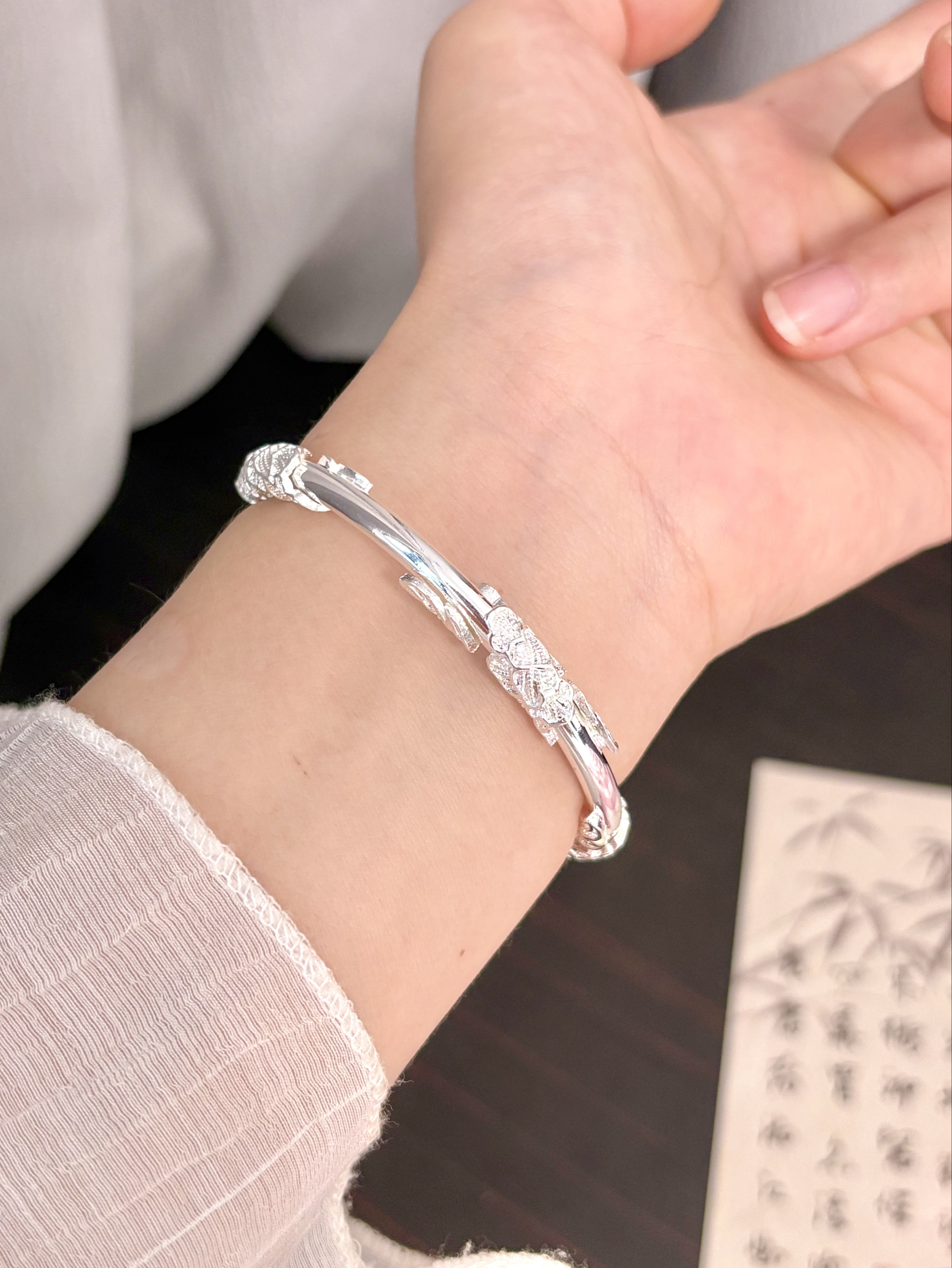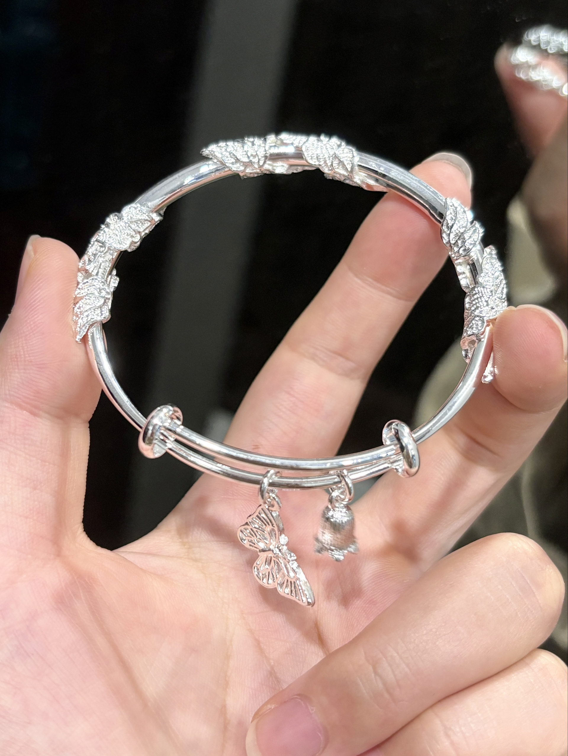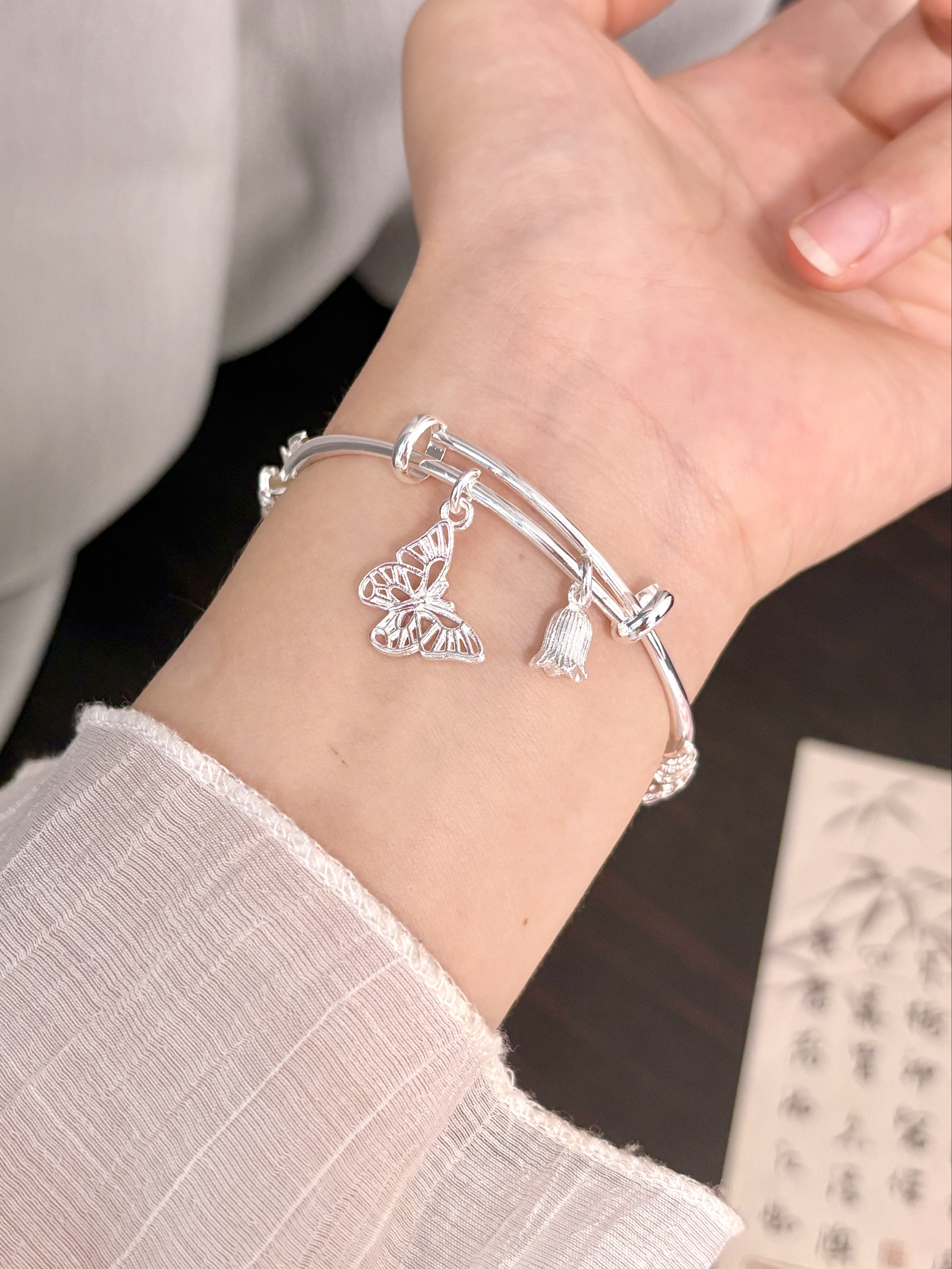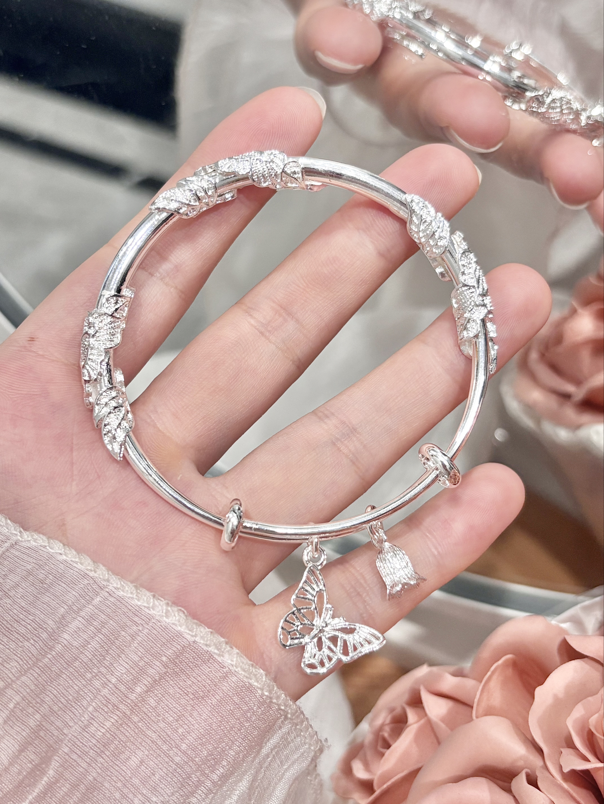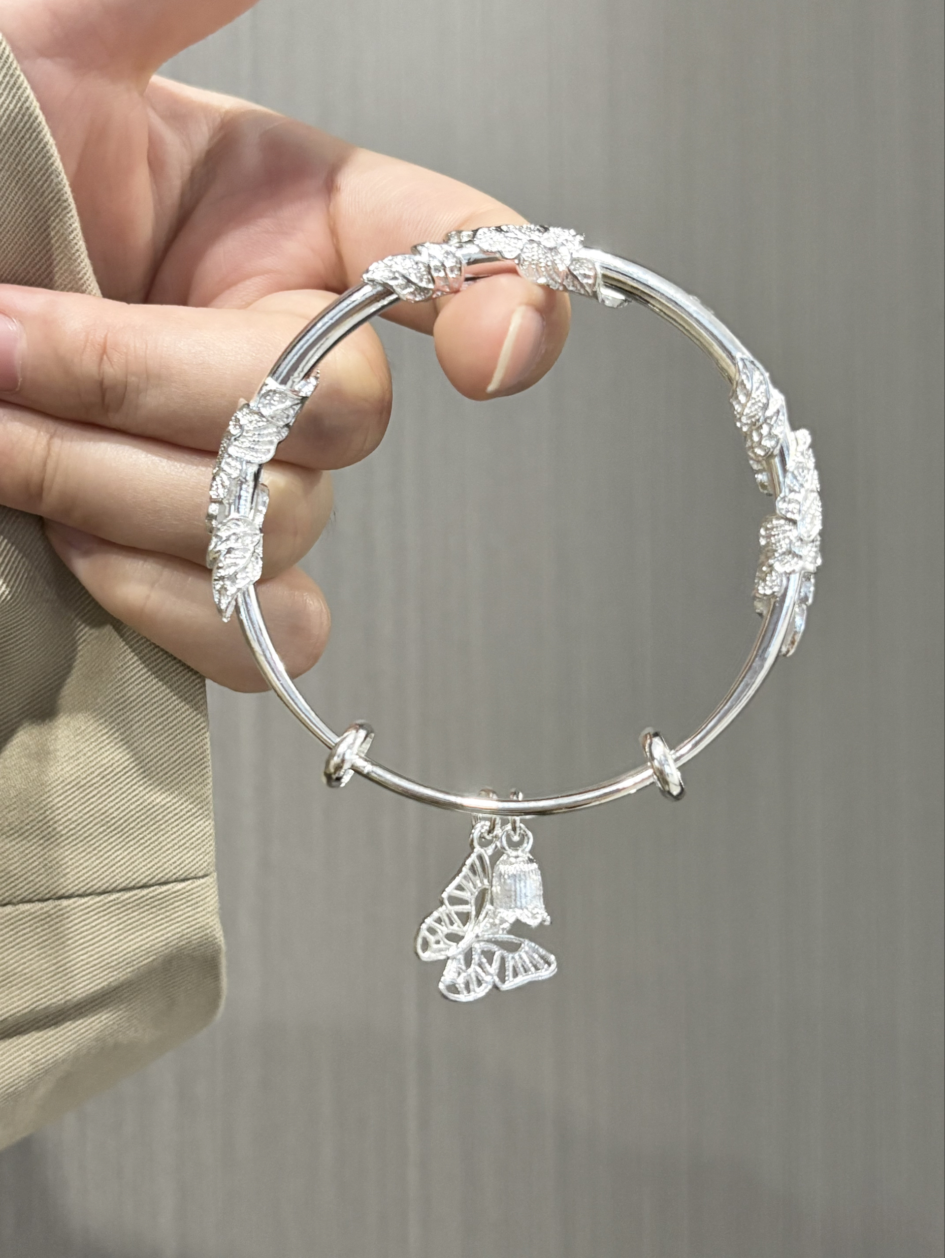 介个银手镯我尊滴戴不腻啊 感觉我一年四季的衣服都能搭 手镯的花纹也做的泰有立体感啦 还有蝴蝶和铃兰花哎 我觉得戴手上温柔又有少女感 寓意也好好 打算和闺蜜一起戴咯~