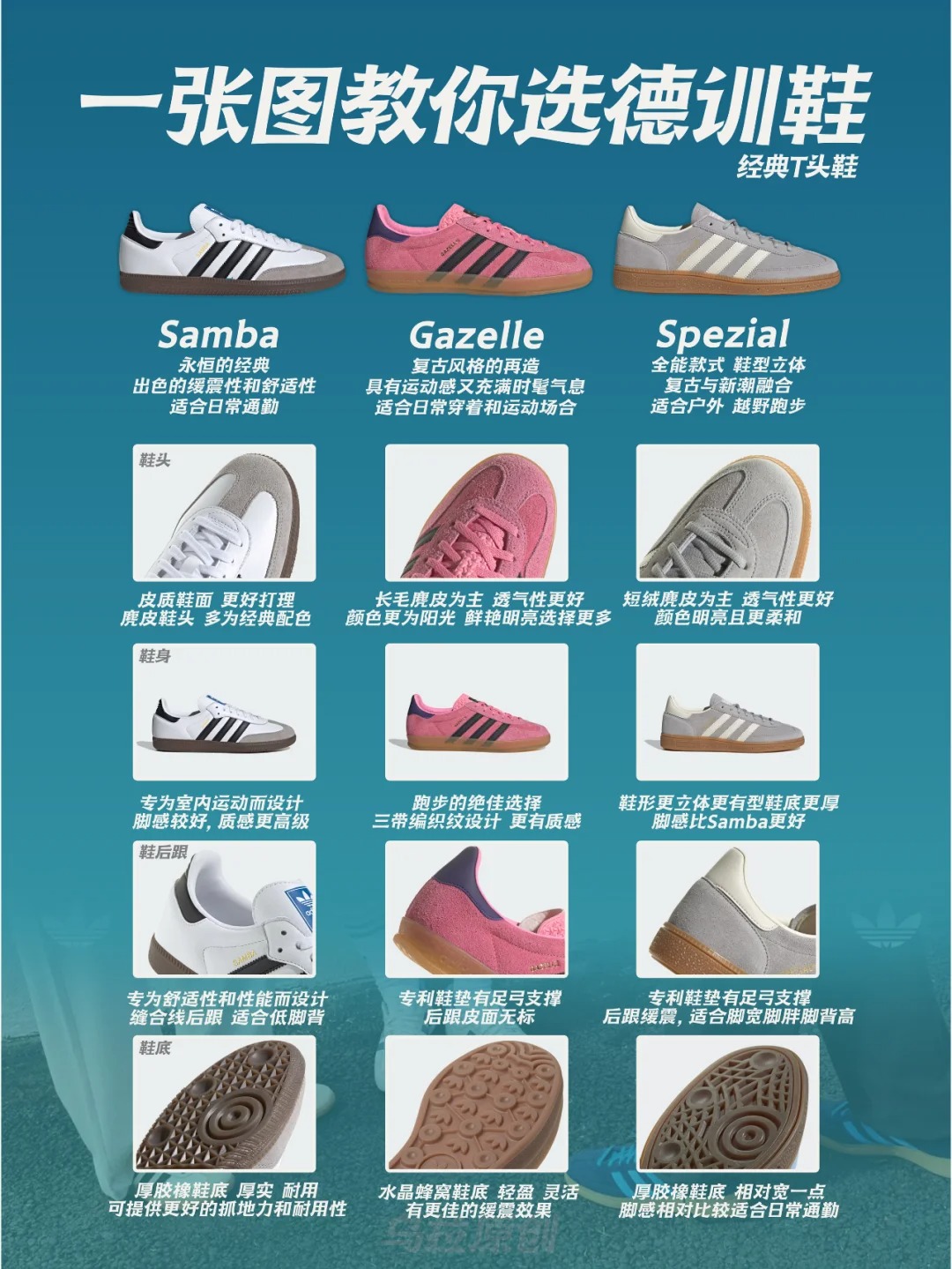 最近一股复古时尚风潮又再次席卷归来! 我将从Gazelle、Samba、Spezial这三大经典德训进行介绍,同时对比这三大类的特点供大家选择时参考。 1️⃣Samba Samba有出色的缓震性和舒适性,鞋面是柔软的皮革&绒面覆层,鞋型会更贴合我们的脚部,鞋头为麂皮材质,确保了鞋子的耐用性和舒适度。采用了耐磨的橡胶材料,为鞋子提供了出色的防滑和耐磨性能。此外,鞋底的厚度和硬度也经过精心调试,既...