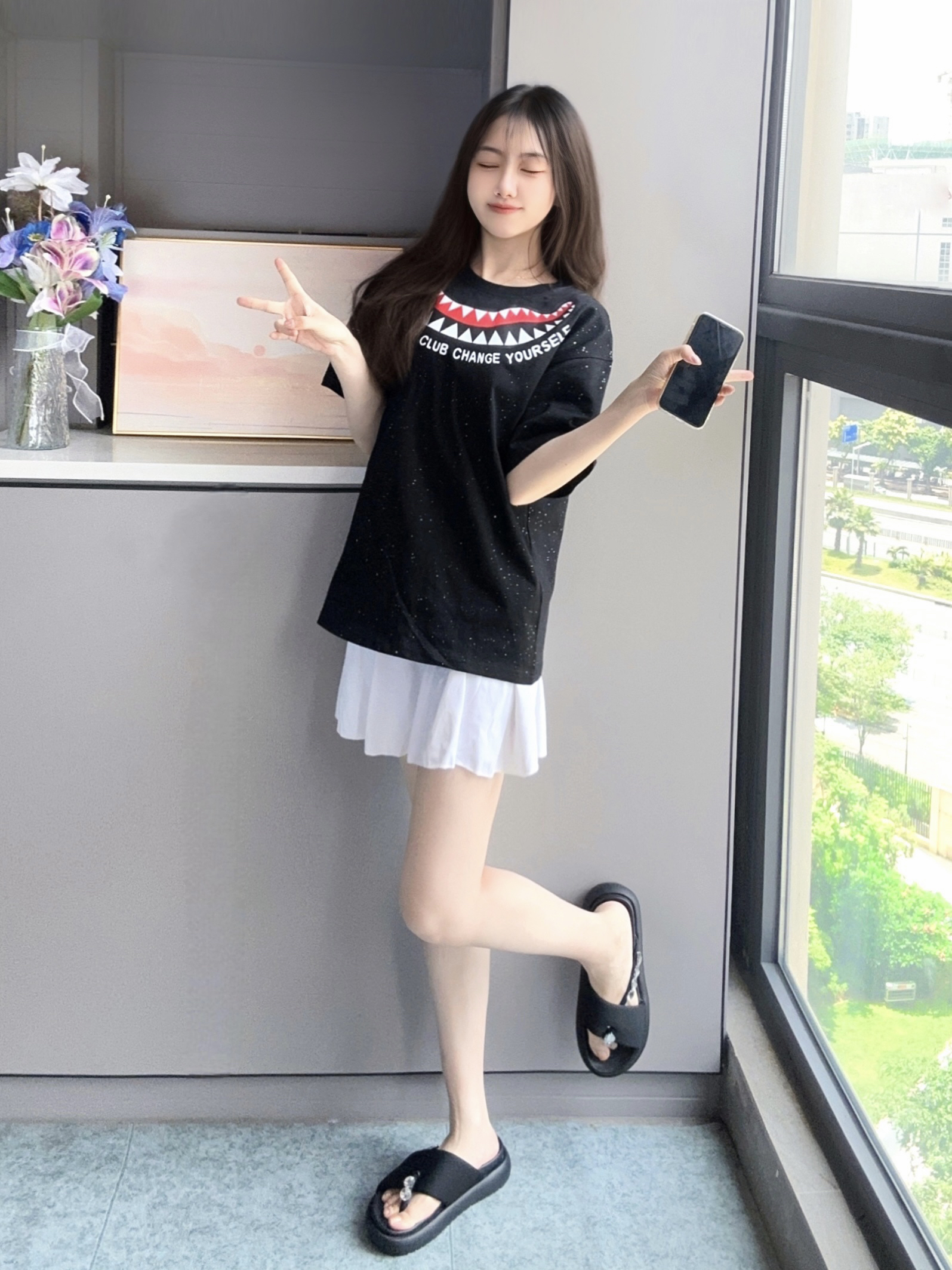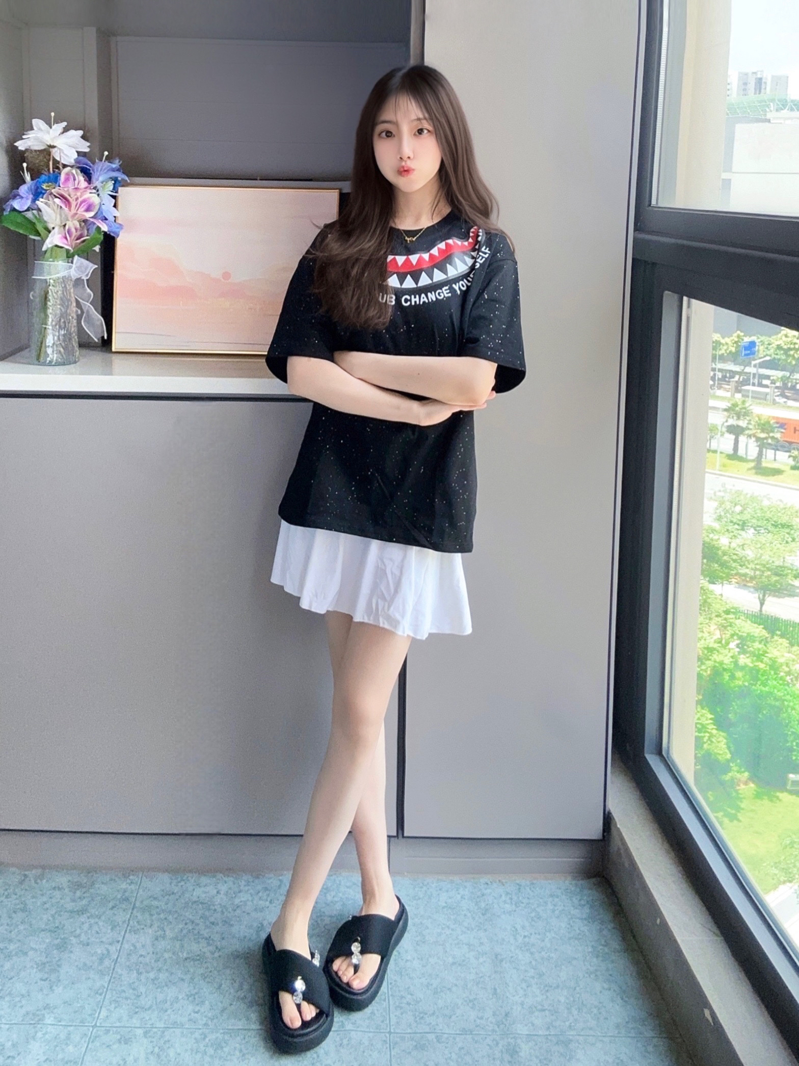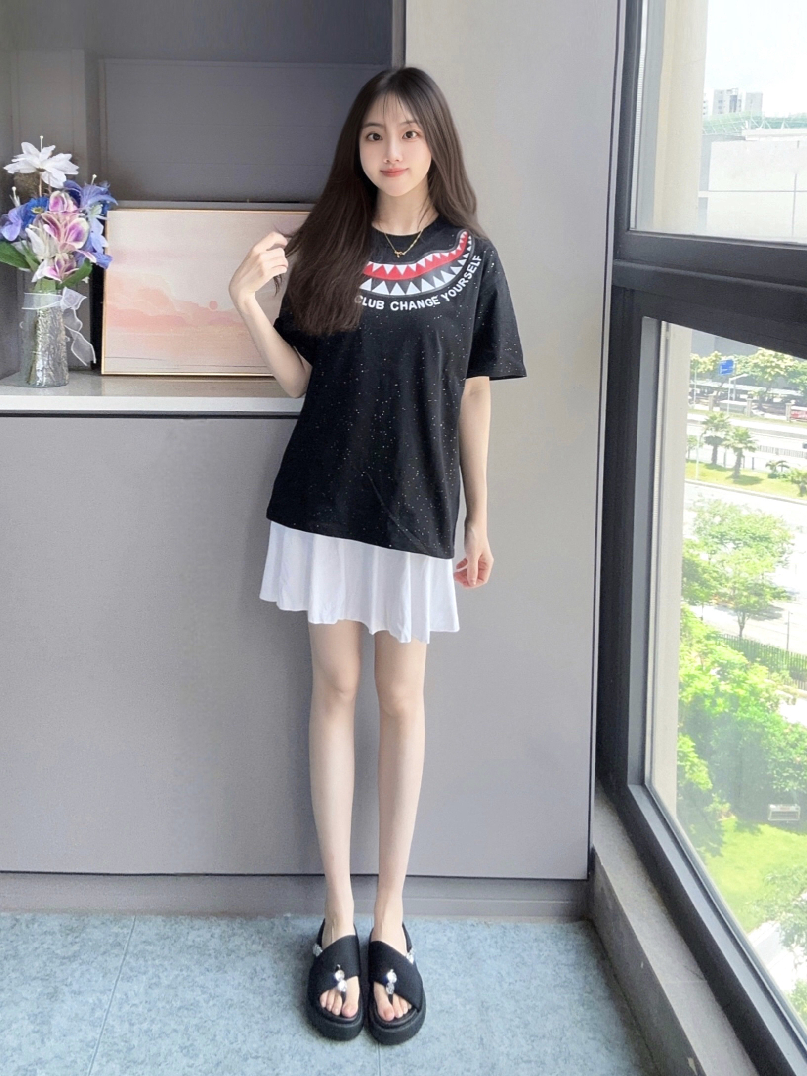 简单的黑白配Ootd一下吧🎱 黑色短袖搭配白色短裙 短袖满天星设计闪闪的✨很戳我 纯棉穿上身还是蛮舒服,自在感