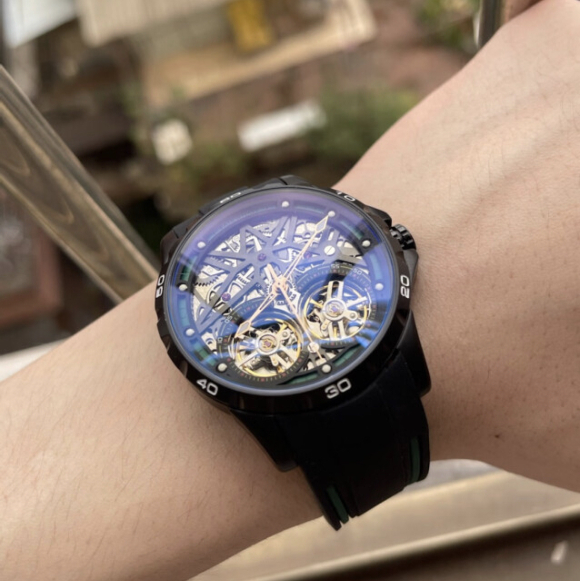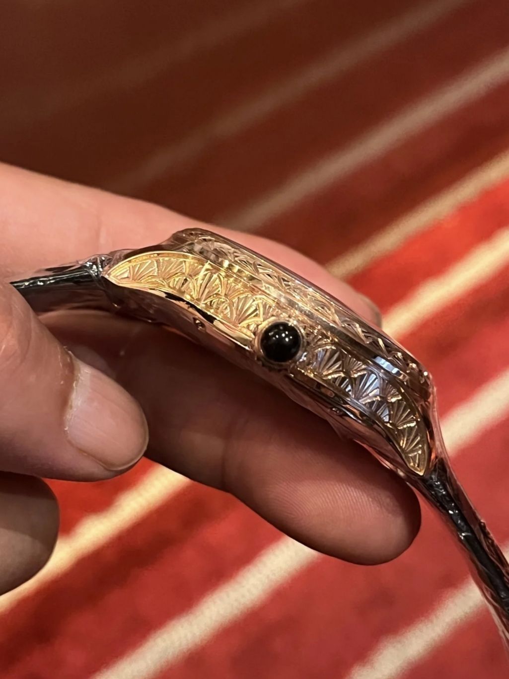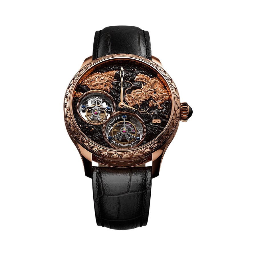 🐉 九龙金雕炸裂吸睛 玫金表壳搭配手工浮雕九龙纹饰,实物比官图更震撼。双陀飞轮窗口如龙眼般灵动,黑鳄鱼皮表带压住浮夸感,上手瞬间气场两米八,聚会绝对被追问品牌。 ⚙️ 双陀飞轮硬核玩家 两套独立擒纵系统同步运转,走时精度±5秒/天。背透可见龙纹夹板打磨,虽比不过百万瑞表,但5万档的工艺对得起价格,机芯观赏性吊打同价位瑞士统芯。 💰 国产复杂功能性价比王 相比瑞士双陀飞轮动辄百万,这块只要零头价...