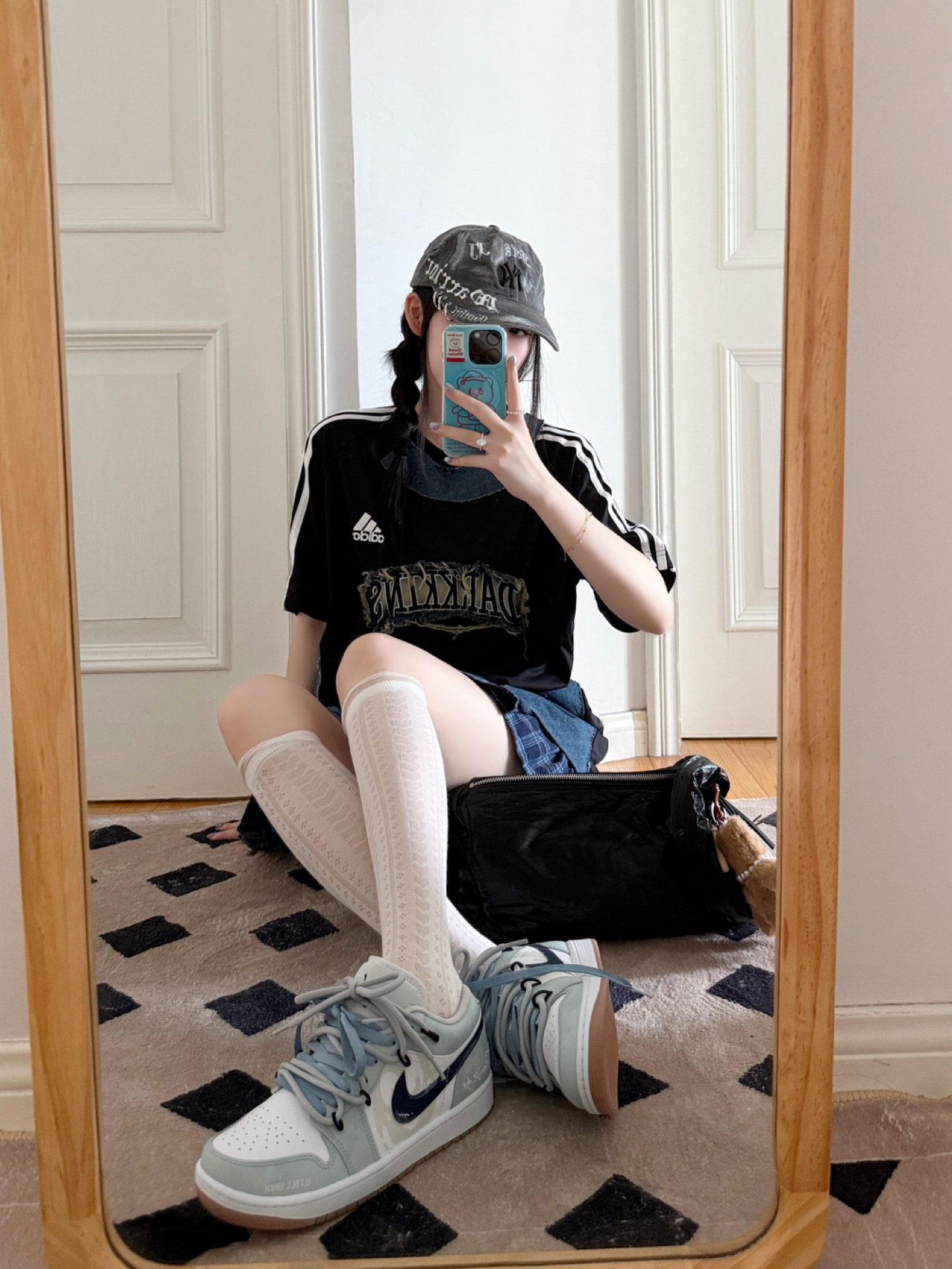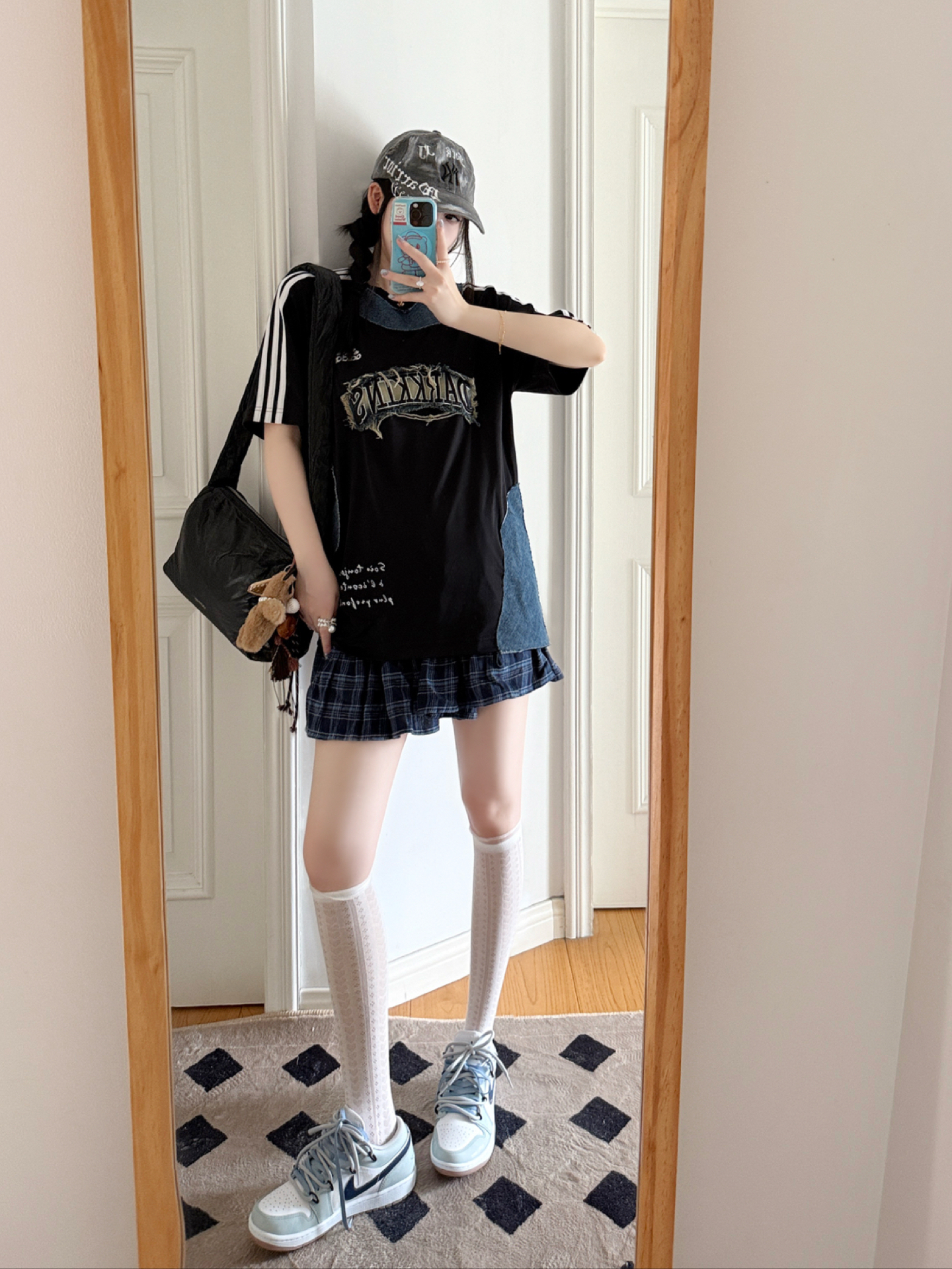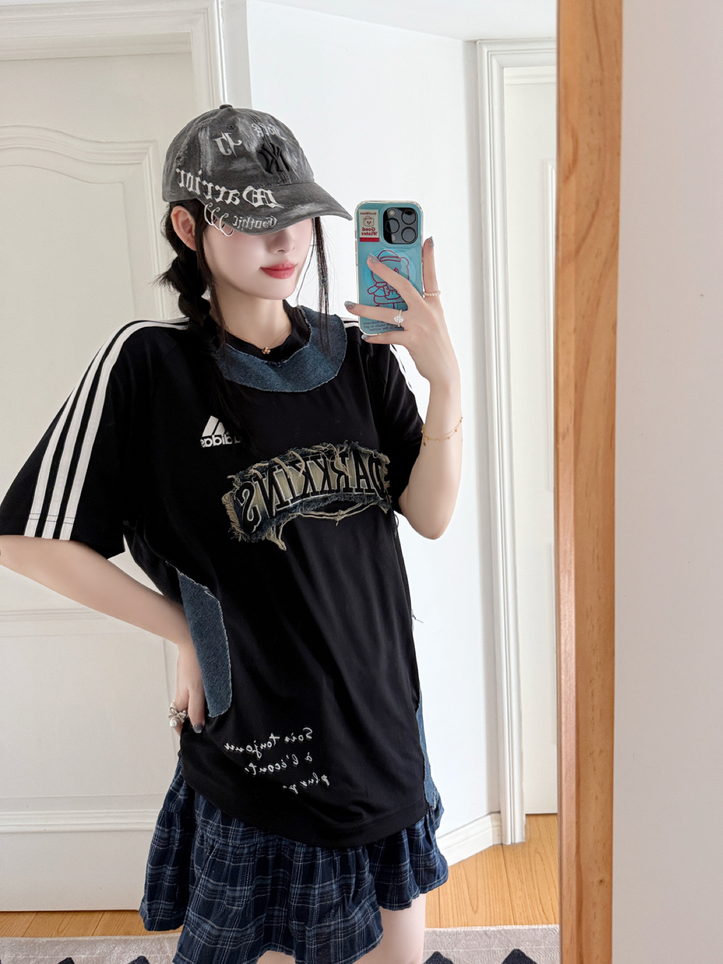 今日份的adidas girl穿搭来啦❕ 定制款ad T恤🎧➕MLB鸭舌帽🧢 T恤牛仔拼接的设计✨好有时髦感 很有y2k千禧辣妹的氛围感🖤 鸭舌帽的金属环🆒尊滴是泰酷辣 帽子很修饰脸型哦👀素颜也可以驾驭 搭配这双定制款AJ1👟甜酷感拉满 海盐蓝色清新很有夏天的感觉 这样一套好戳我呀💕