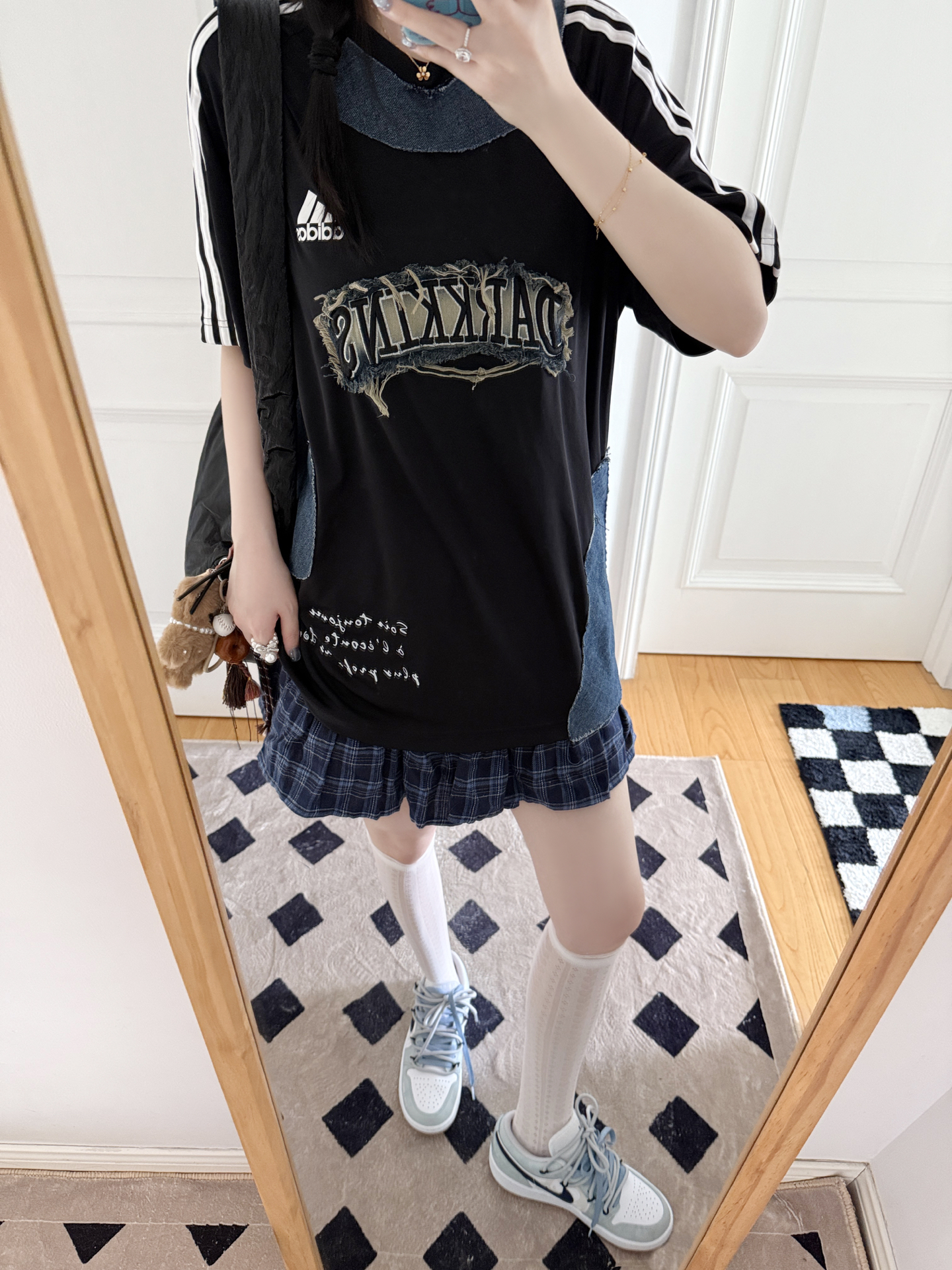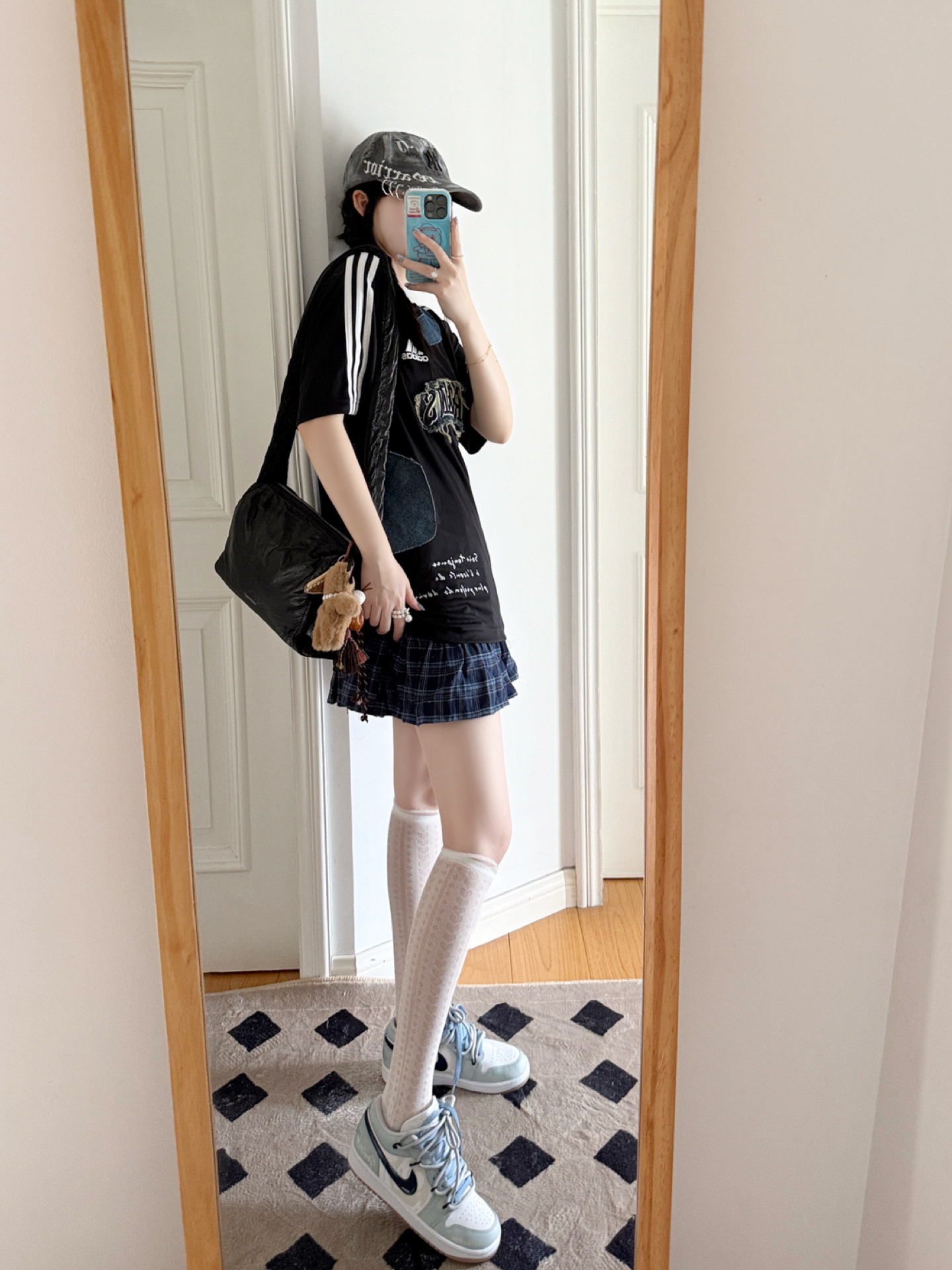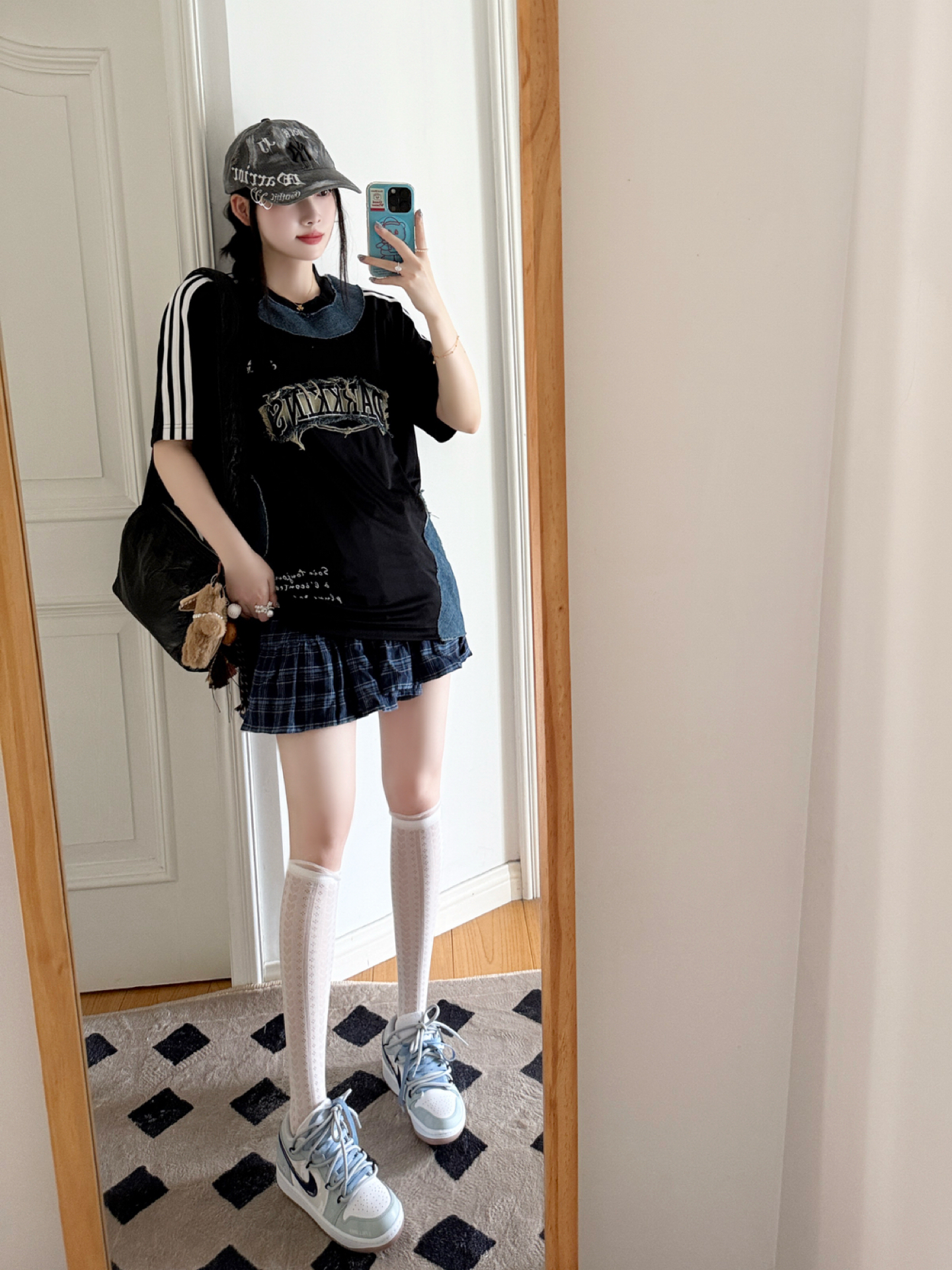今日份的adidas girl穿搭来啦❕ 定制款ad T恤🎧➕MLB鸭舌帽🧢 T恤牛仔拼接的设计✨好有时髦感 很有y2k千禧辣妹的氛围感🖤 鸭舌帽的金属环🆒尊滴是泰酷辣 帽子很修饰脸型哦👀素颜也可以驾驭 搭配这双定制款AJ1👟甜酷感拉满 海盐蓝色清新很有夏天的感觉 这样一套好戳我呀💕