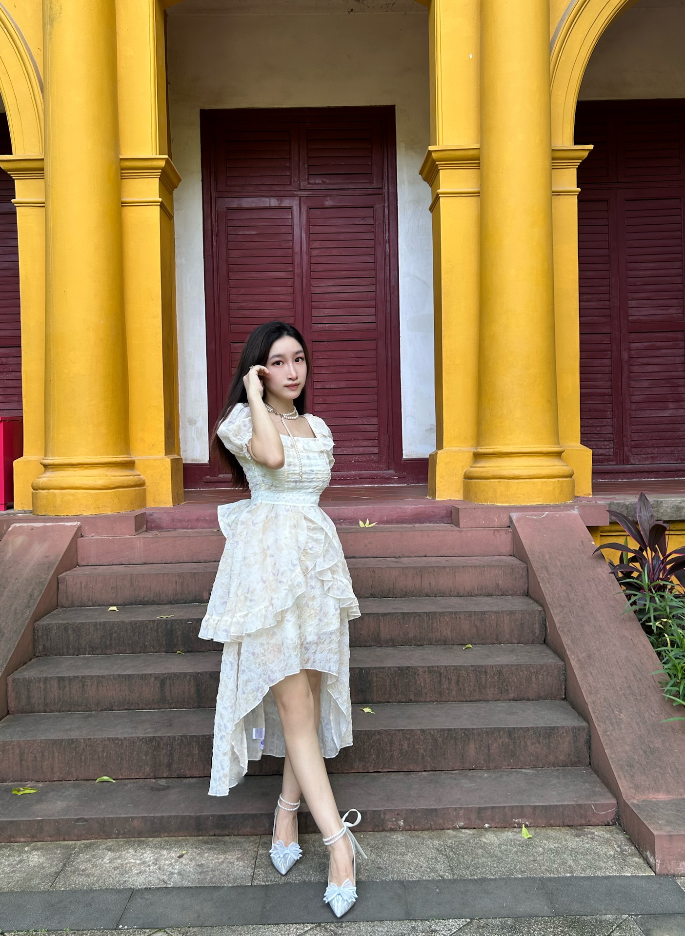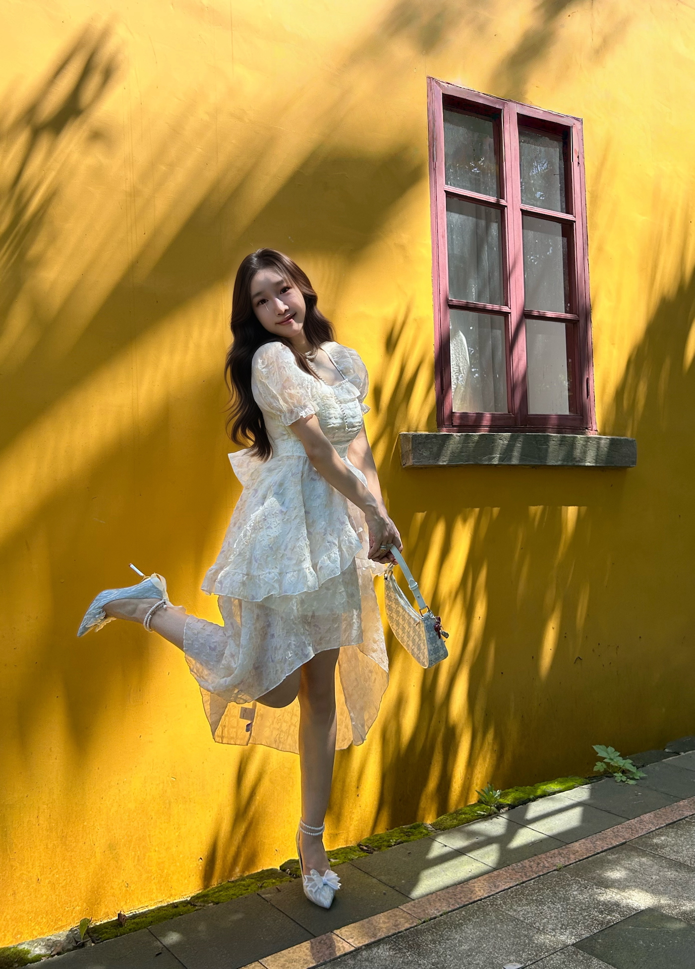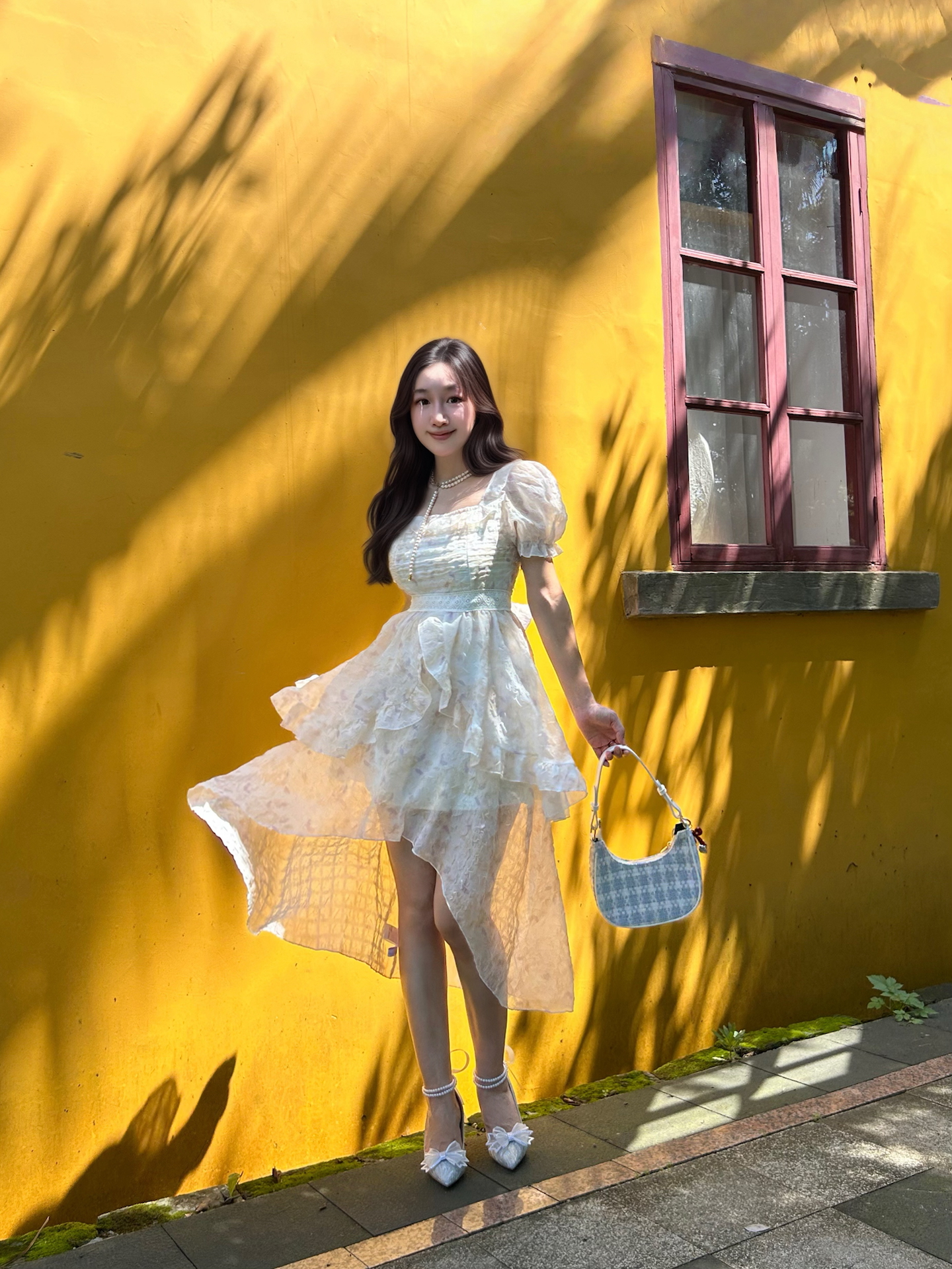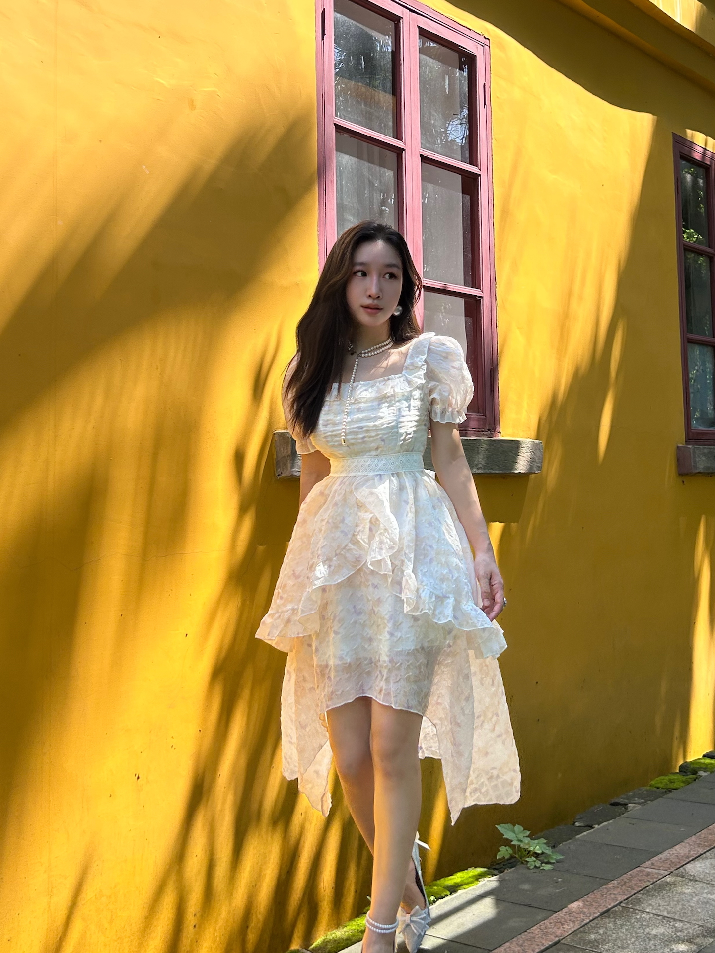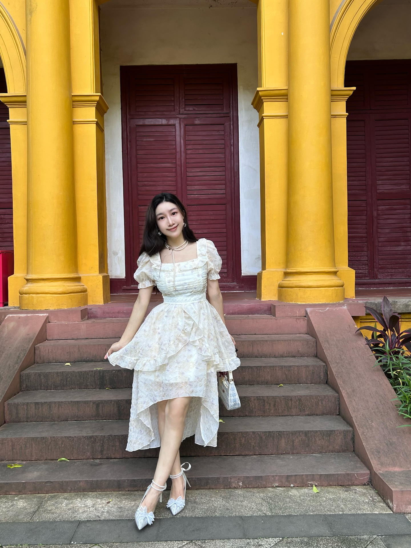 今天去庄园玩了一天 小波浪发型+珍珠水晶鞋 公主风穿搭轻松get☑️ 裙子是轻盈的雪纺,我轻轻一转裙摆就会飞扬起来,蝴蝶结是可以调节,可以放在胸前,我今天把蝴蝶结放在背后,也好可爱! 今天天气很热,可是裙子很凉快哈,前短后长的设计显得我腿好长!喜欢! 图源网络侵删