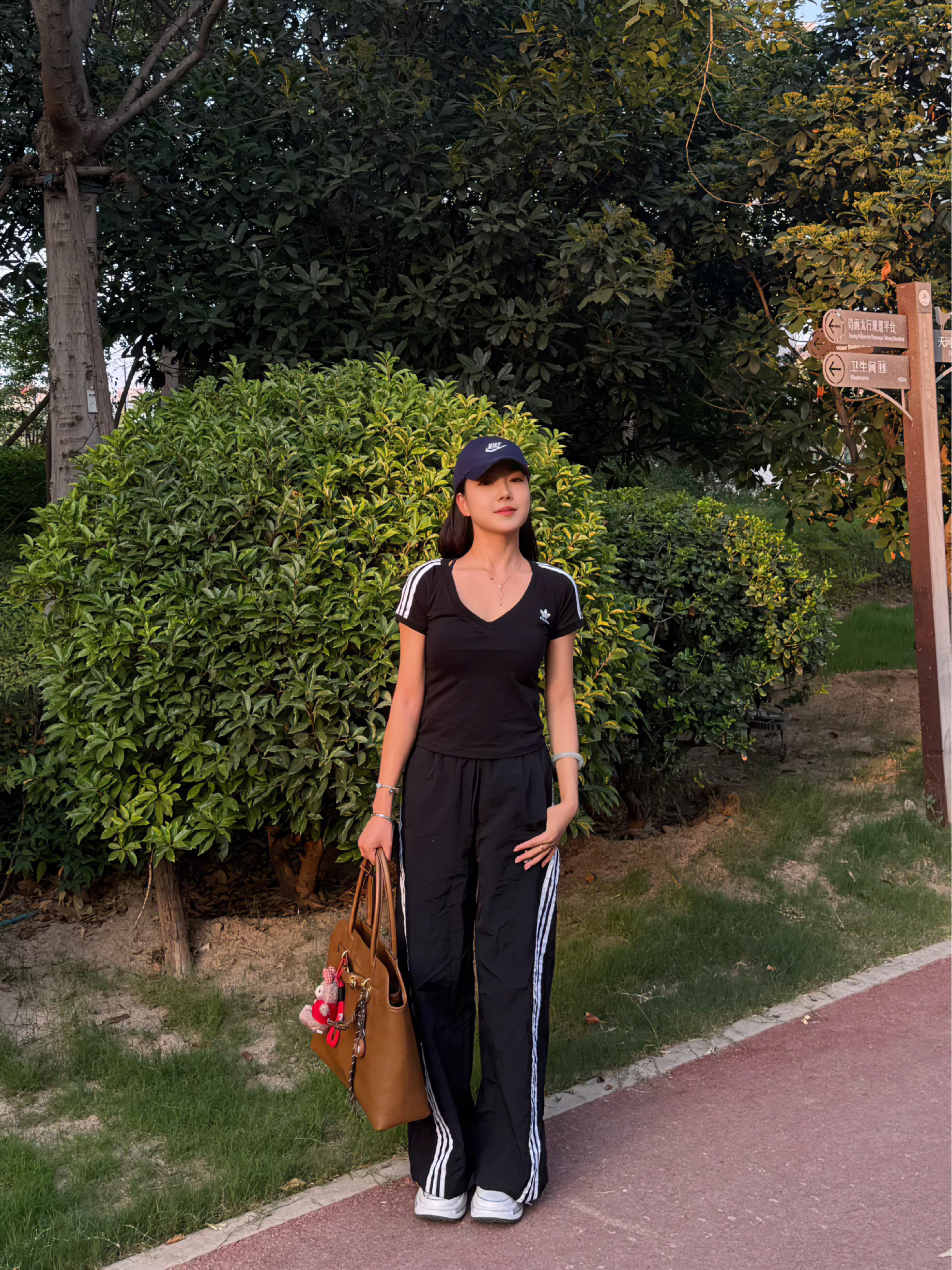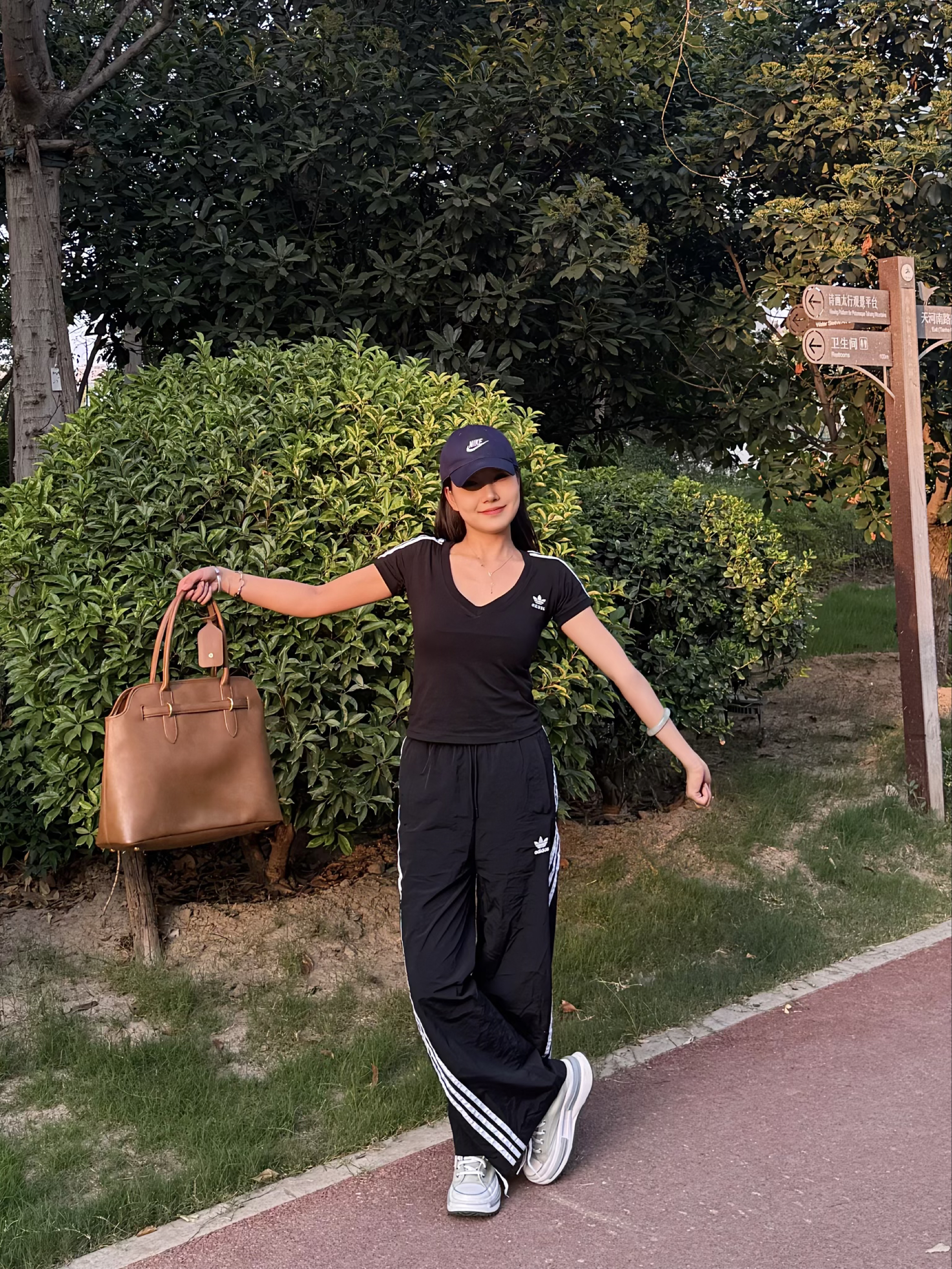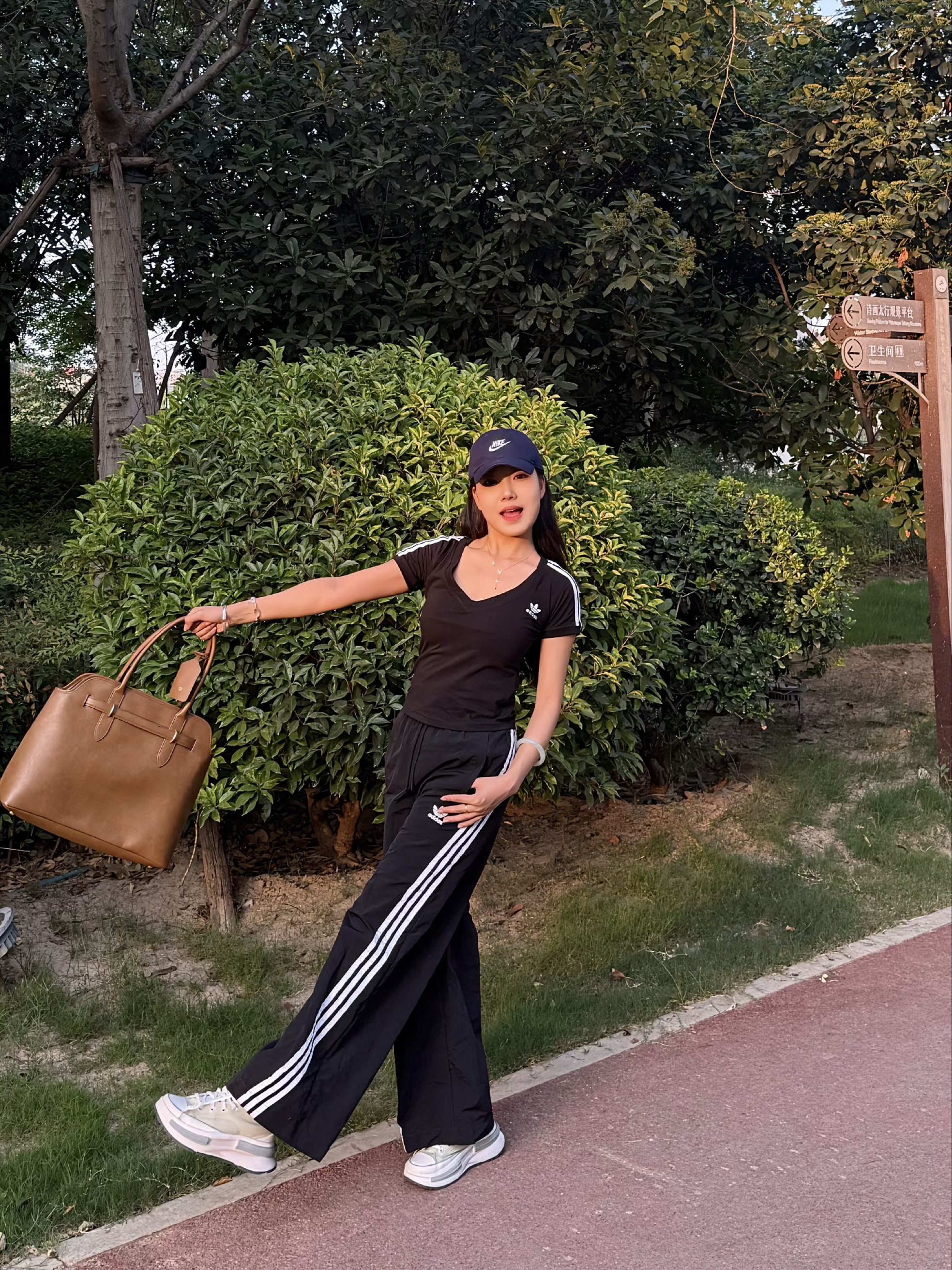 黑色阿迪V领短T,显身材又有范儿,紧身版型勾勒曲线,辣妹必备✔️ 搭配经典三条杠运动裤,阔腿裤型走路带风,藏肉又显腿长,松弛感直接拉满💨 棕色大包包一挎,蓝色棒球帽一戴,谁还不是个运动系酷girl啦~