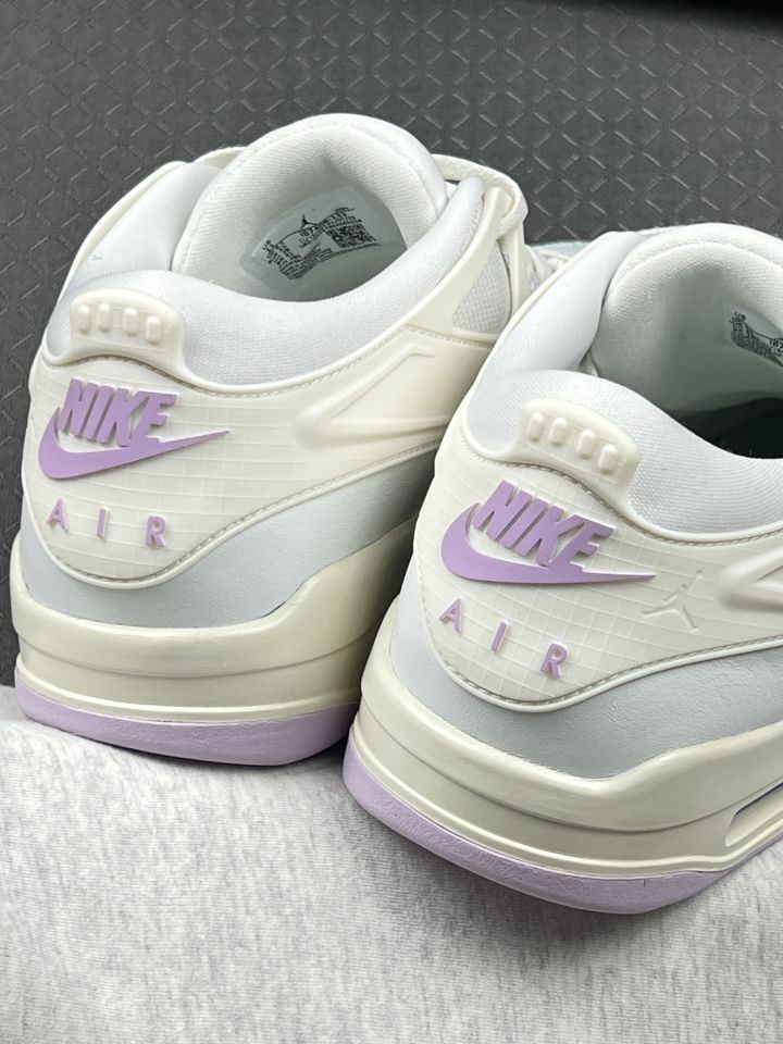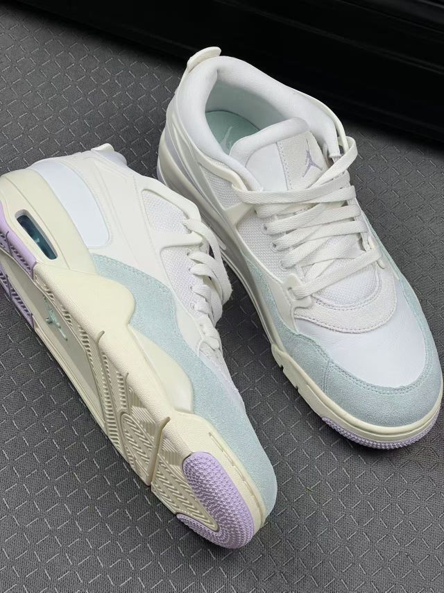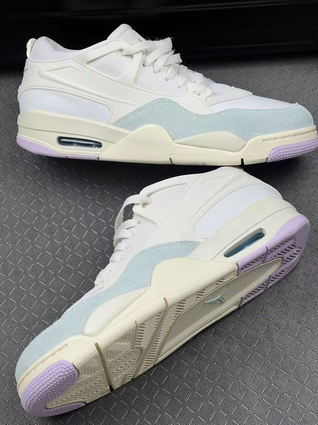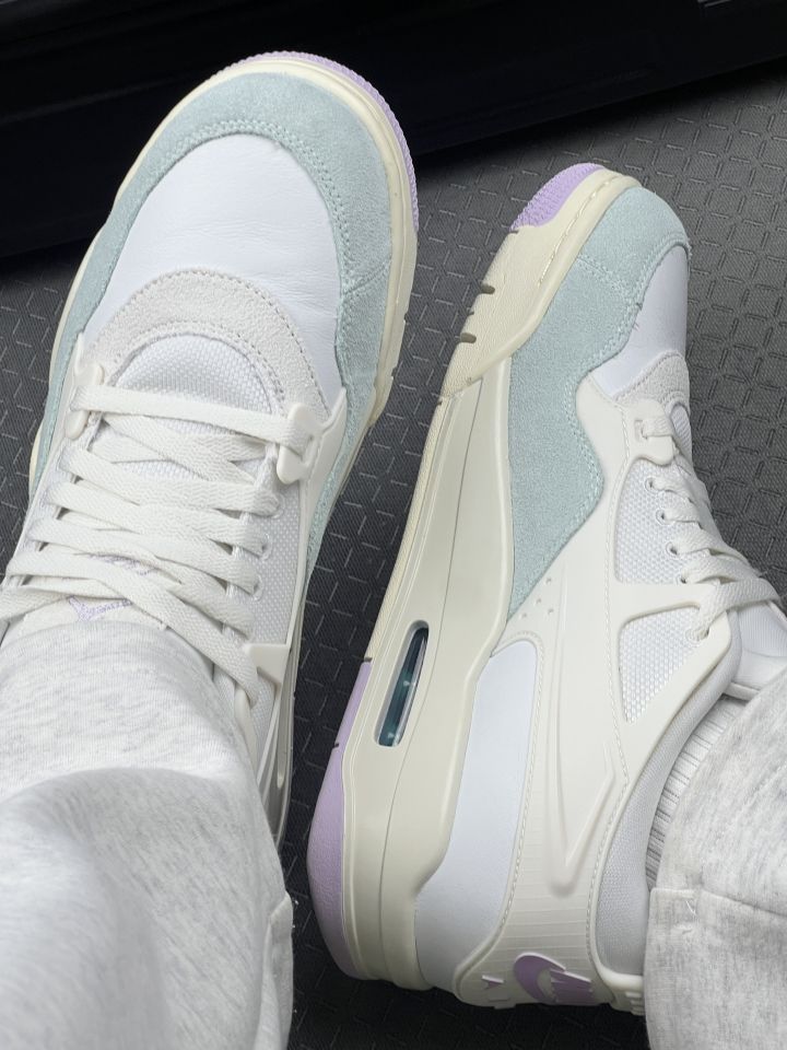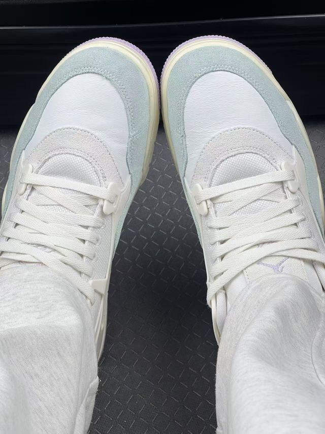 AJ4白绿简直我夏日出街“显眼包”鞋子 外观这个配色是白、浅绿、淡紫搭一起,低饱和马卡龙色调🎨现在夏天看着就感觉清新,后跟淡紫色的 Nike Air 标志,细节做的还不错 脚感的话刚上脚时,它有气垫挺明显的,走路能感受到但是走久,后脚跟就有点酸,而且鞋底不算特别软,整体还是很舒服,比较适合日常穿 缺点就是鞋头容易皱,才穿几次,褶皱就很明显