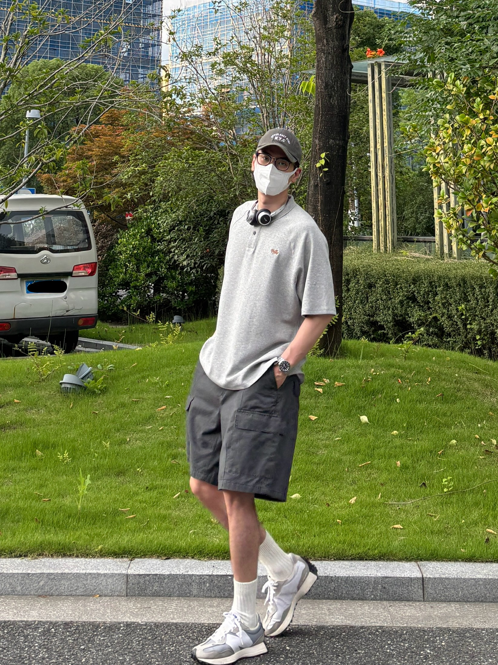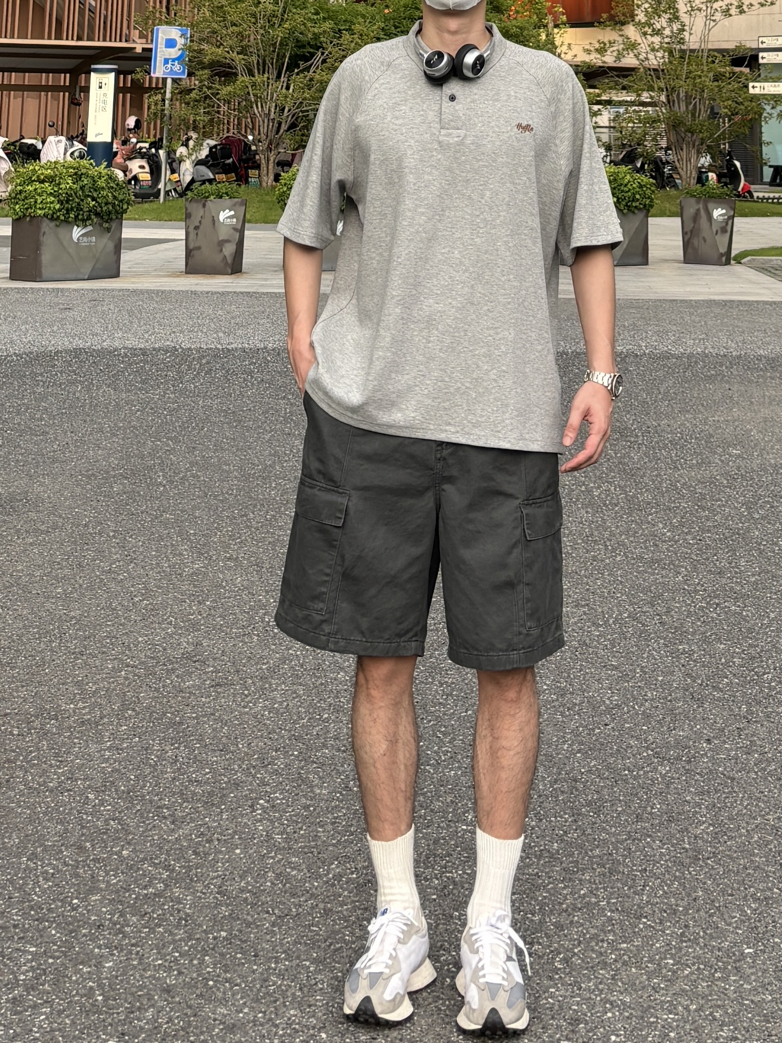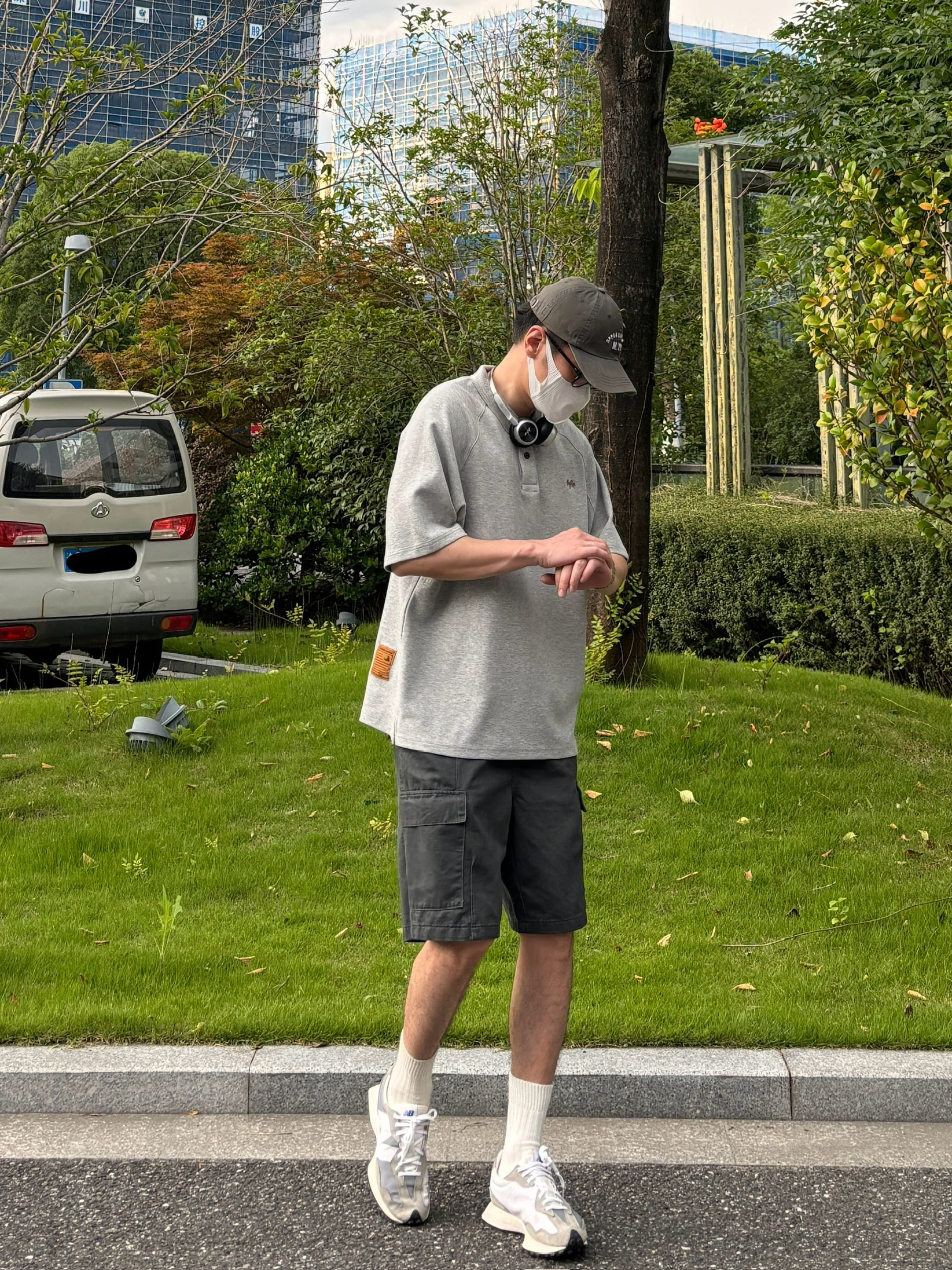 今天这套上衣穿了一件少年感十足的浅灰色宽松重磅小刺绣polo领短袖 ⬇️ 裤子选择简约大方的深灰色直筒水洗做旧多口袋工装短裤 ⬇️ 鞋子上脚经典百搭的nb327元组灰 ⬇️ 最后戴一副氛围感十足的银灰色蓝牙耳机 - 今日搭配 衣服裤子:NICE LILI 鞋子:NB327元组灰