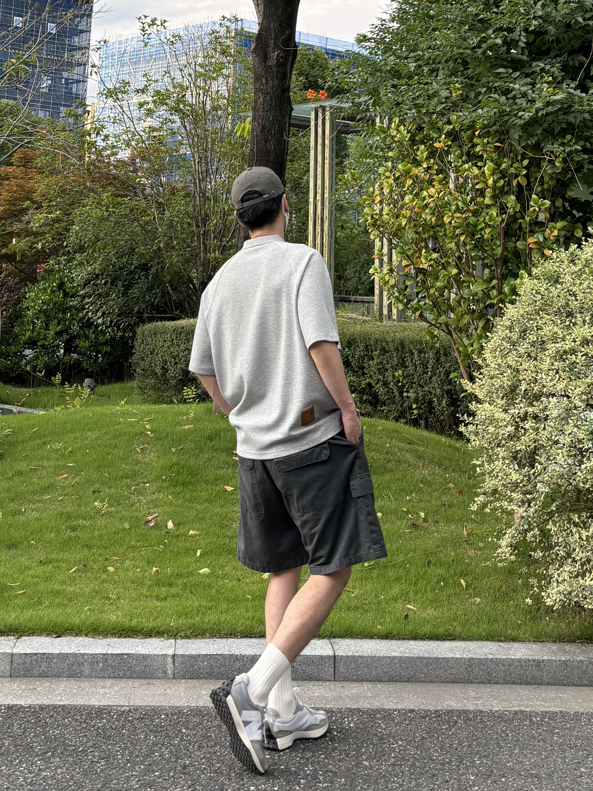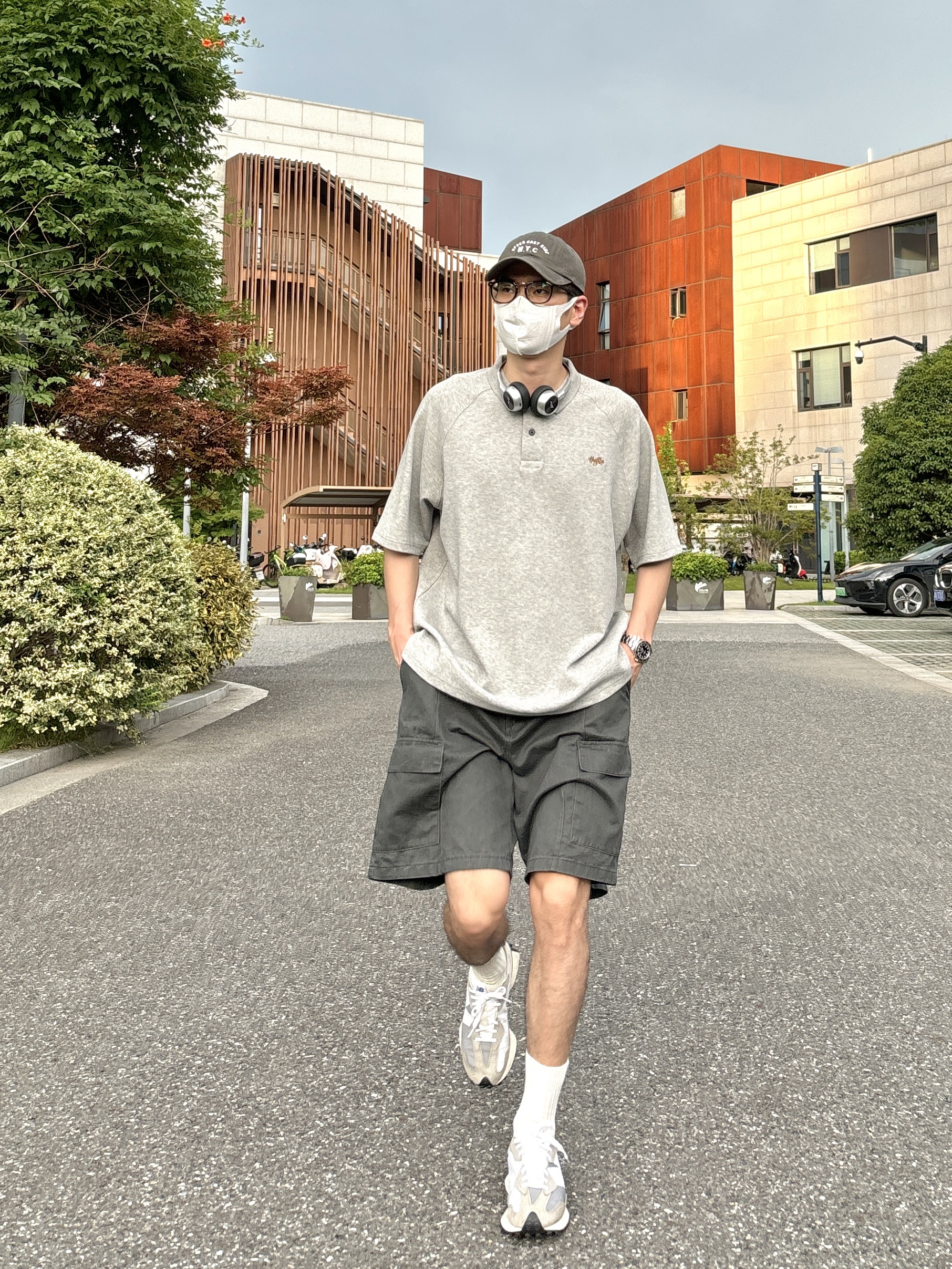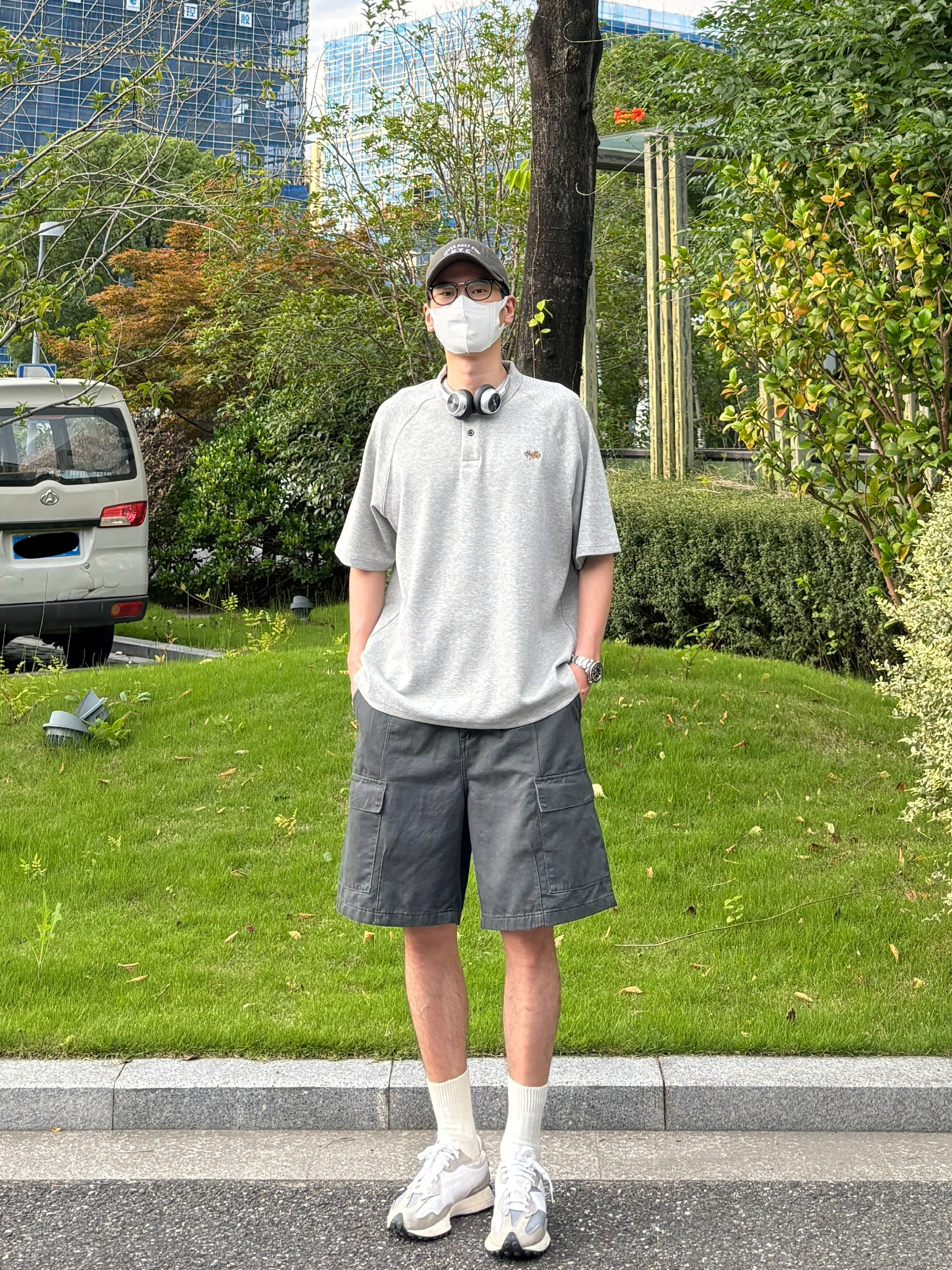 今天这套上衣穿了一件少年感十足的浅灰色宽松重磅小刺绣polo领短袖 ⬇️ 裤子选择简约大方的深灰色直筒水洗做旧多口袋工装短裤 ⬇️ 鞋子上脚经典百搭的nb327元组灰 ⬇️ 最后戴一副氛围感十足的银灰色蓝牙耳机 - 今日搭配 衣服裤子:NICE LILI 鞋子:NB327元组灰