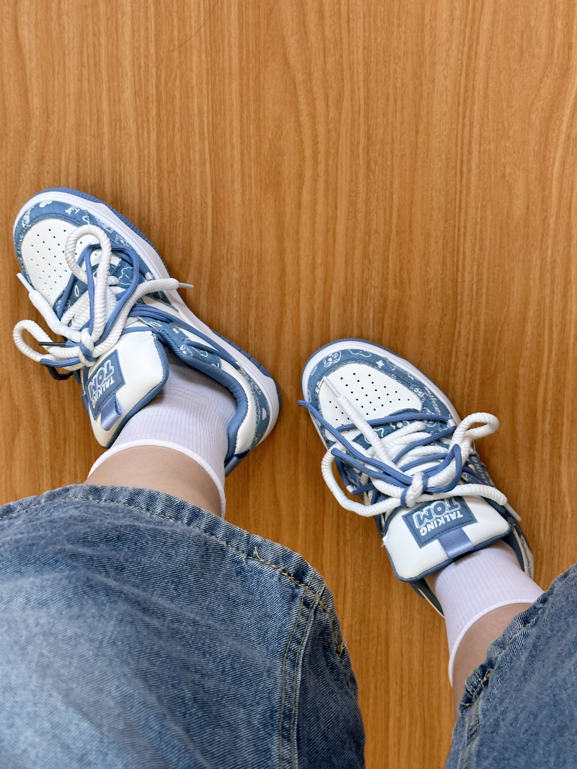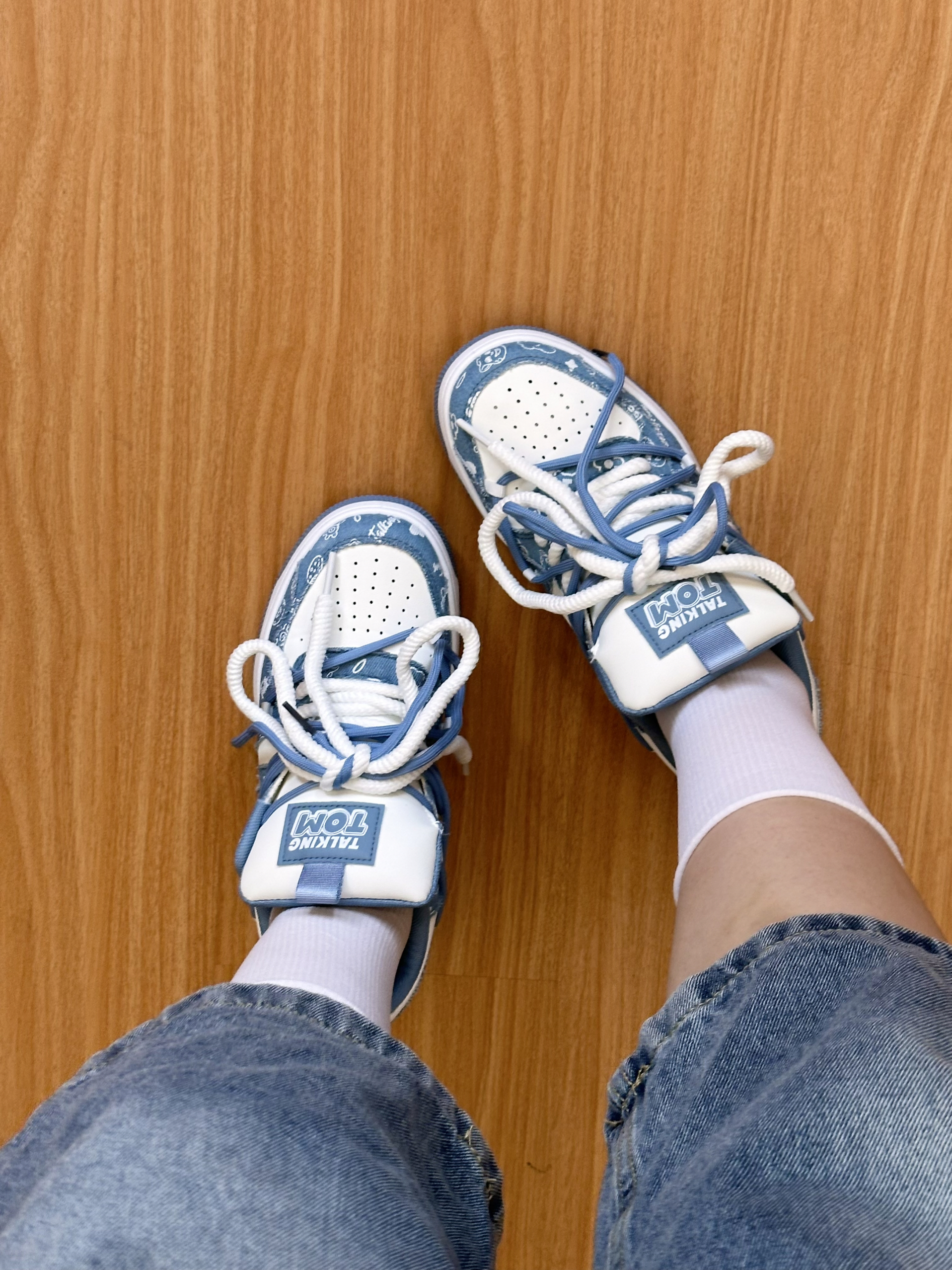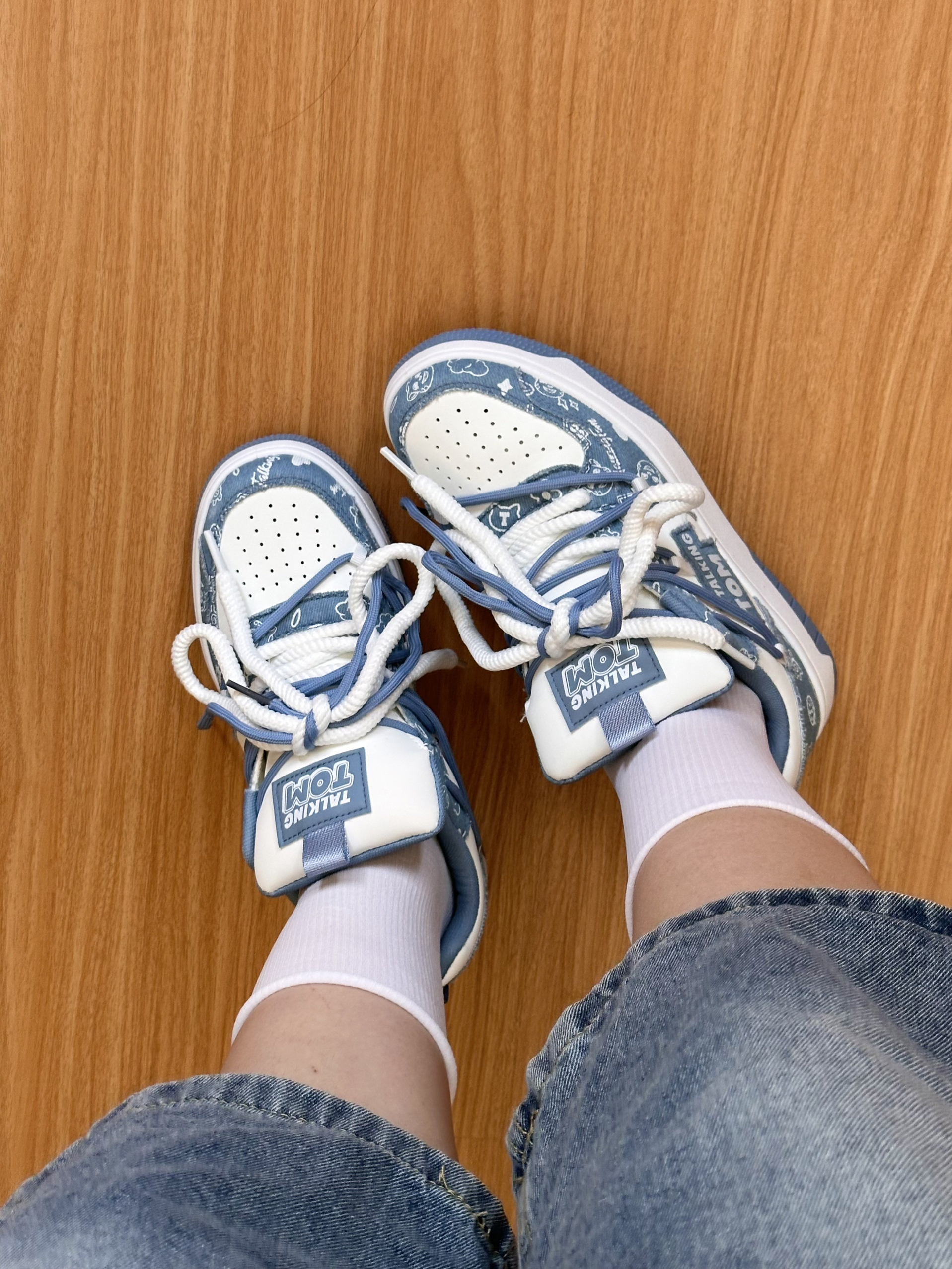 汤姆猫板鞋太可爱了! 蓝白配色清爽干净,鞋身印着超萌的汤姆猫图案 鞋面是柔软帆布➕皮质 透气又轻便,搭配牛仔裤、短裙都超有氛围感! 鞋垫软软的,减震效果也不错 暴走逛街也不累脚! 和对象穿情侣款出街,超吸睛哒