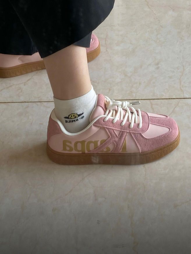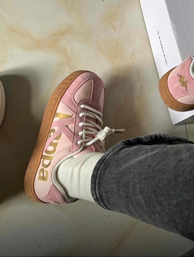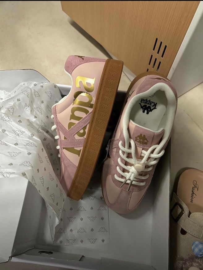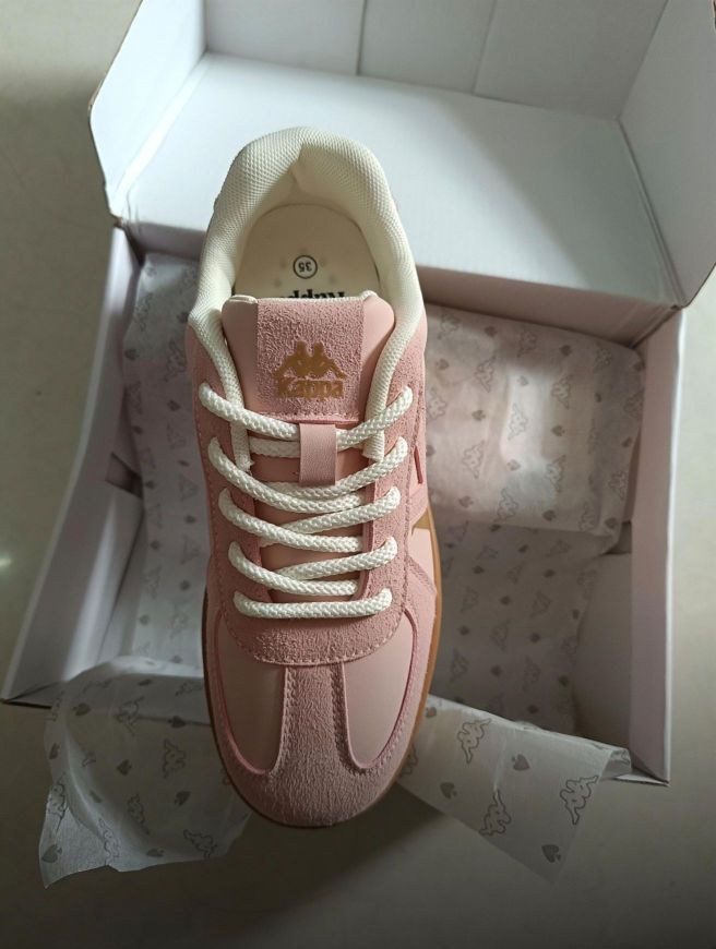 刚拆箱就被这双Kappa可爱到!浅粉鞋面+烫金logo ,复古板鞋型超对味✨ 麂皮拼接细腻又有质感,生胶底自带松弛感,配小裙子、短裤都很绝,是能从春天穿到夏天的宝藏单品~ 有没有同款粉鞋爱好者?求一波神仙穿搭灵感呀!
