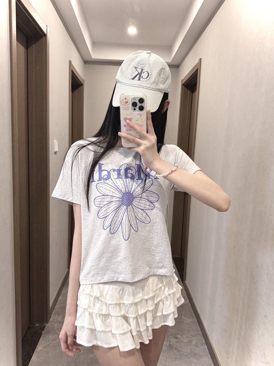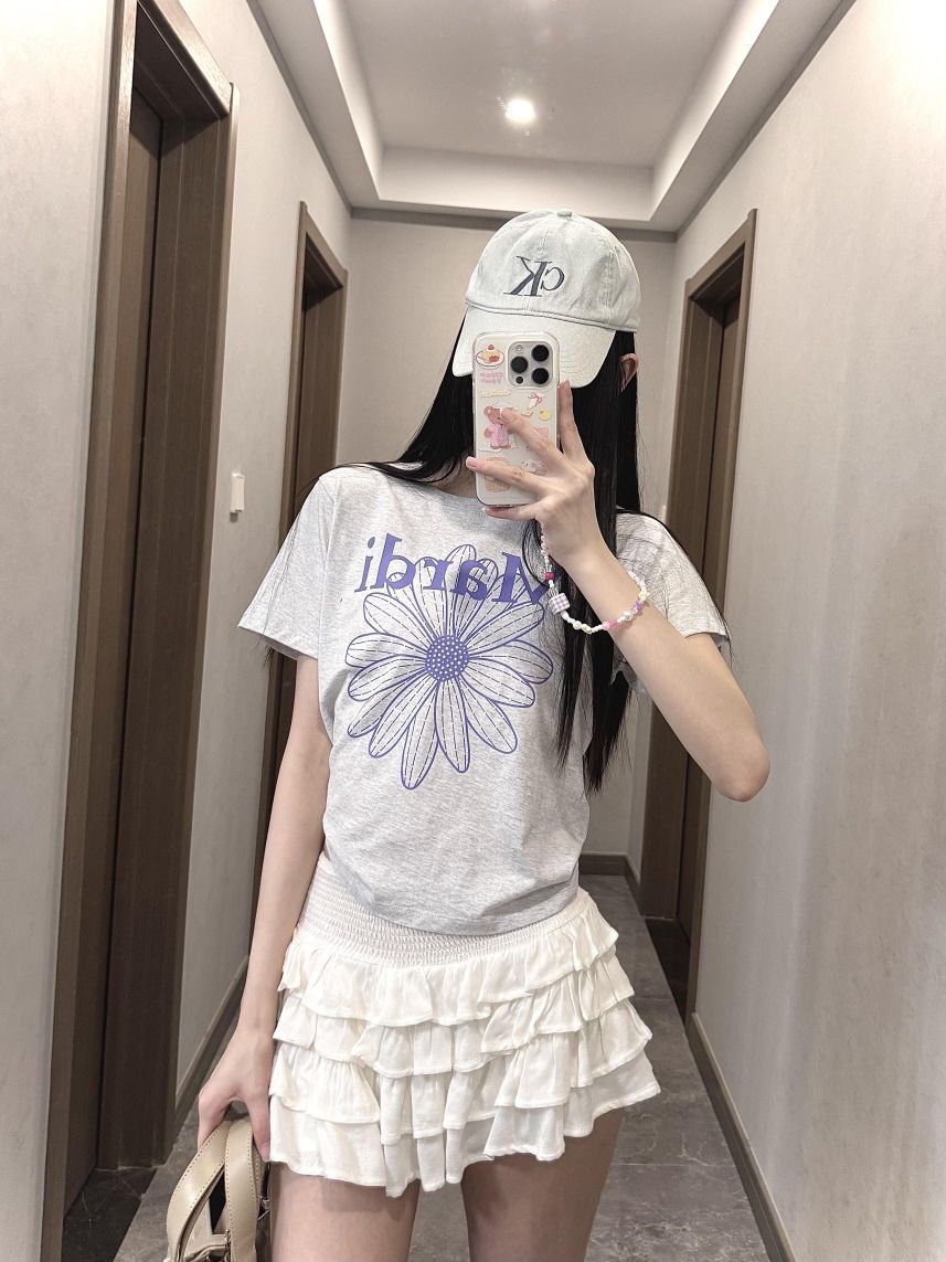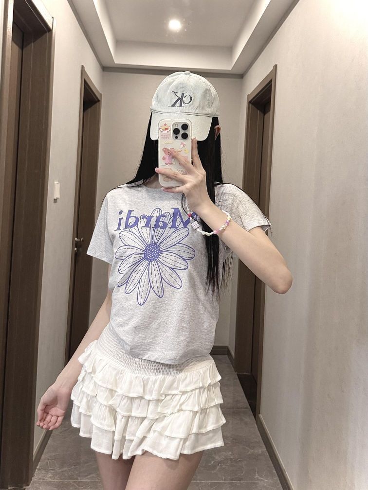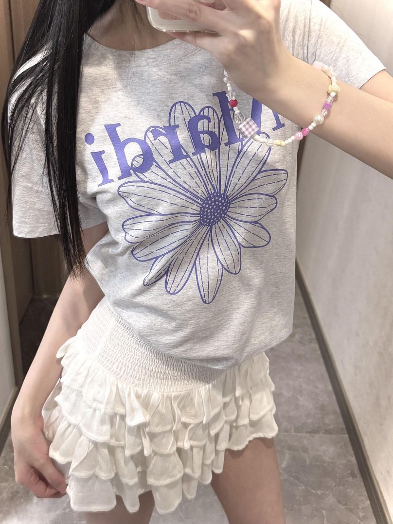 是我是我!!!不好意思标题党啦~这件Mardi也太韩了吧!浅灰色小T印着紫调大花,清新又韩系,搭配白色蛋糕裙,纯欲氛围直接拉满~Mardi女孩们在哪,直接闭眼冲呀🌼
