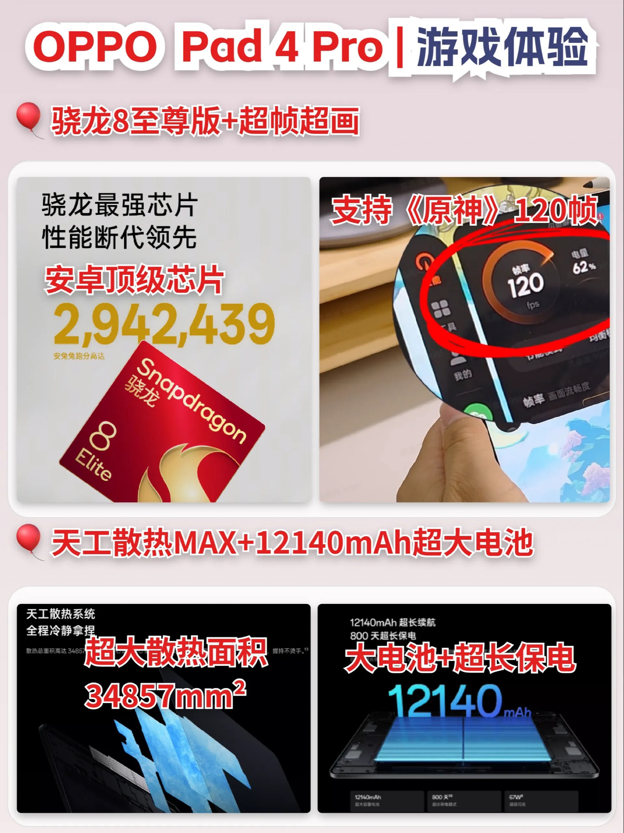 大家好,我是爱数码的J同学,最近入手了一款安卓平板——OPPOPad4Pro,今天给宝子们盘点下这款产品的特点,马上选购平板的宝子们先码后看哦~ 🎈旗舰性能:搭载骁龙8至尊版芯片,安兔兔跑分近300万,支持《原神》2.1K/120帧,游戏性能强悍;超大散热面积34857mm²,石墨+VC复合结构散热效率超高! 🎈大电池+闪充:搭载12140mAh超大电池,带出去游戏办公追剧一整天,67W极速闪充补...