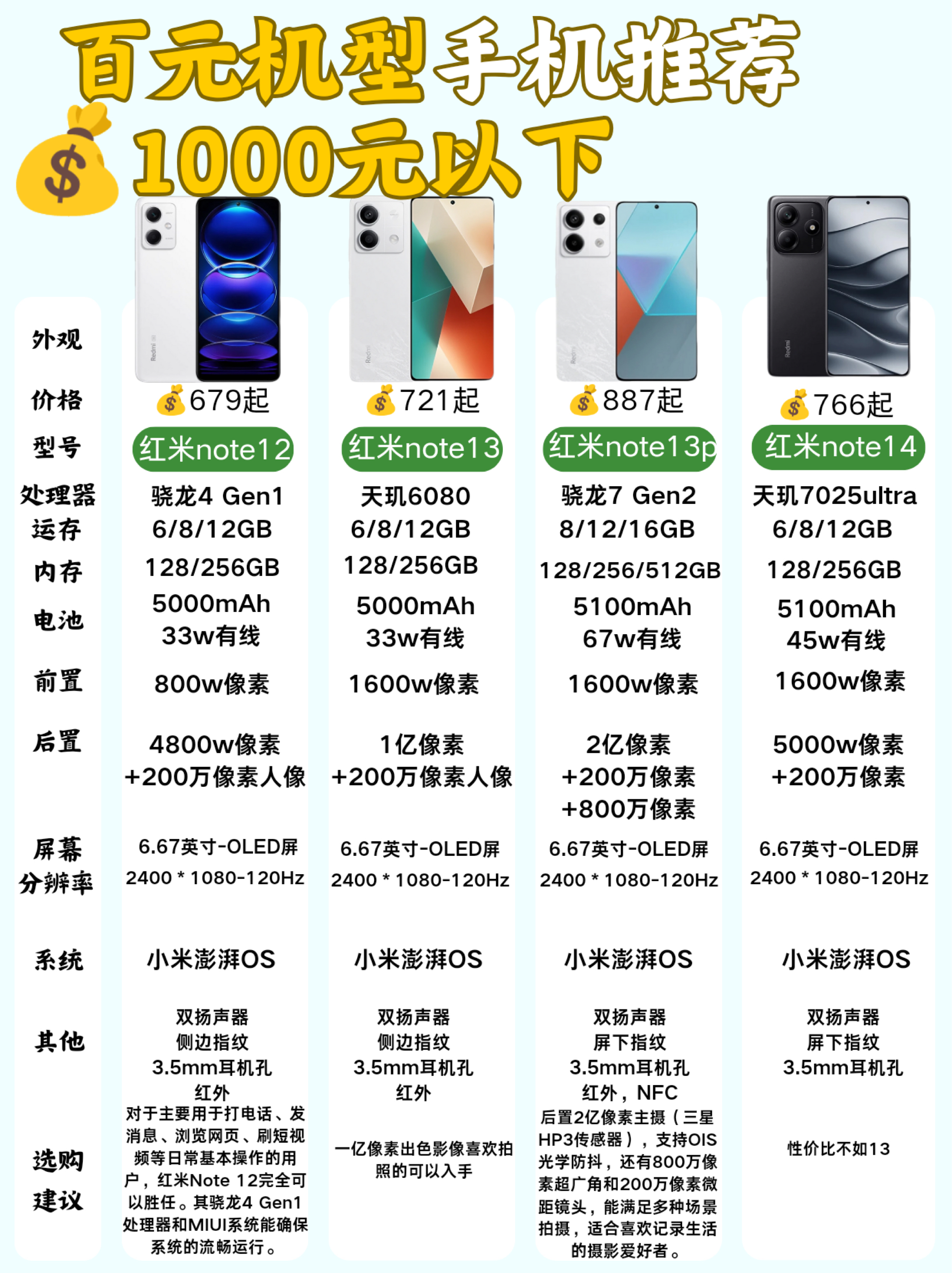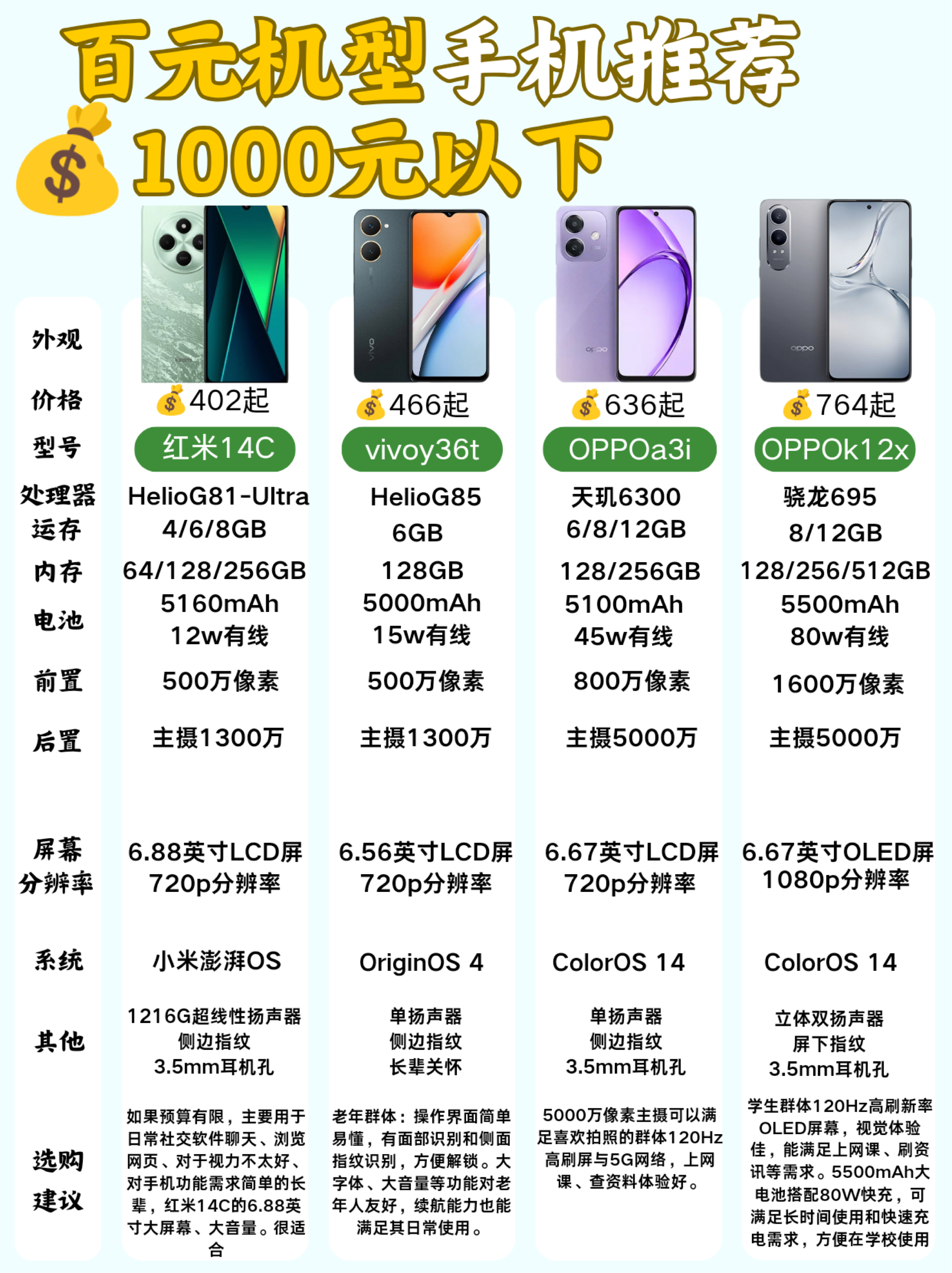 2025年的百元手机怎么选❓进来看看‼️ 在2025年,也有不少朋友想入手新📱,预算不足的学生党,不想用太贵手机的长辈选手机本篇就帮大家梳理了25年3月份有哪些手机值得选,希望给大家带来一些帮助~ 👉🏻关于手机的配置和说明,图里面都有,请大家自行查看哦~ 👇🏻本期选择的手机: ✅600以内 红米14c vivoy36t ✅600-800 OPPOa3i OPPOk12x 红米note1...