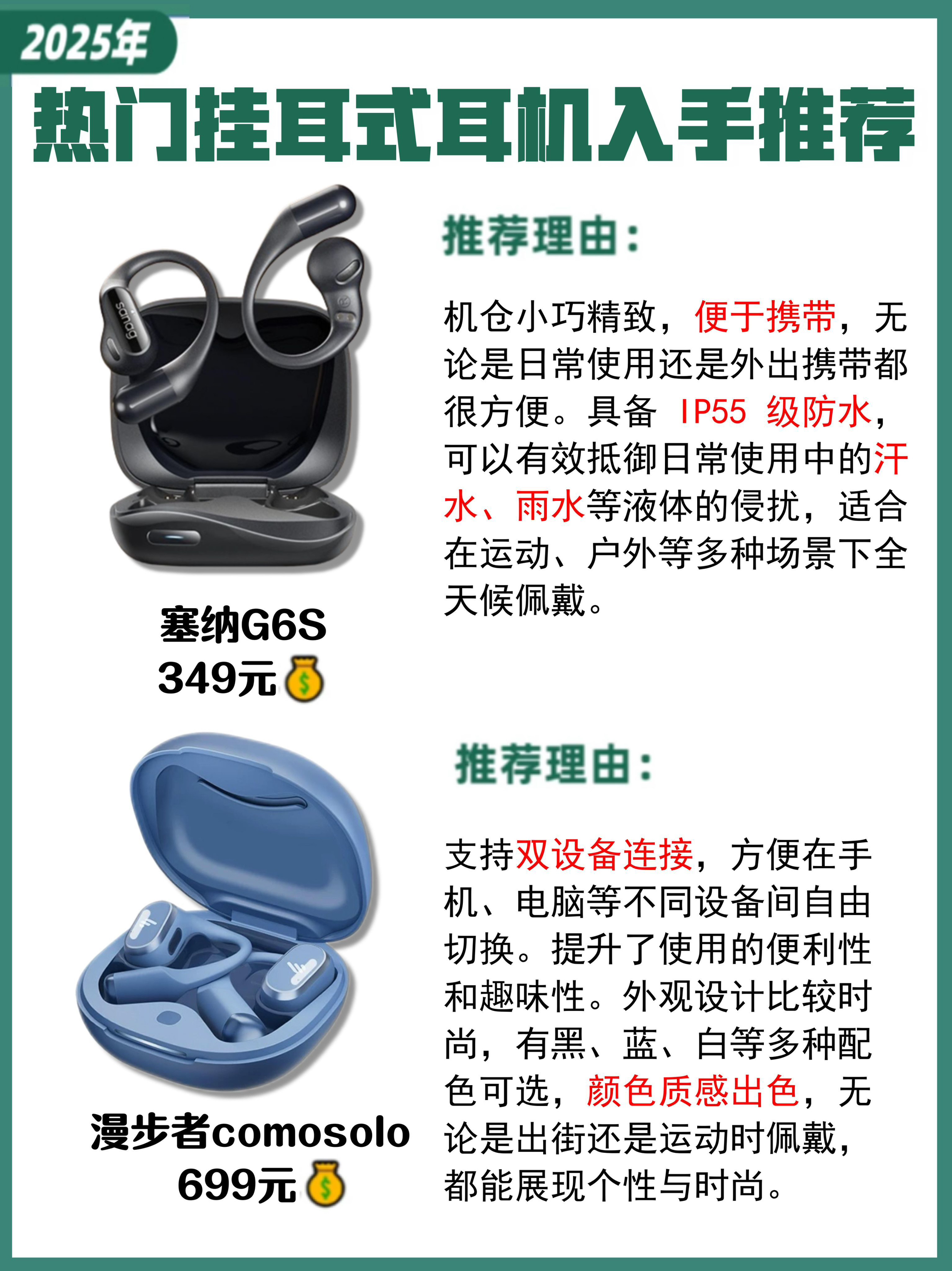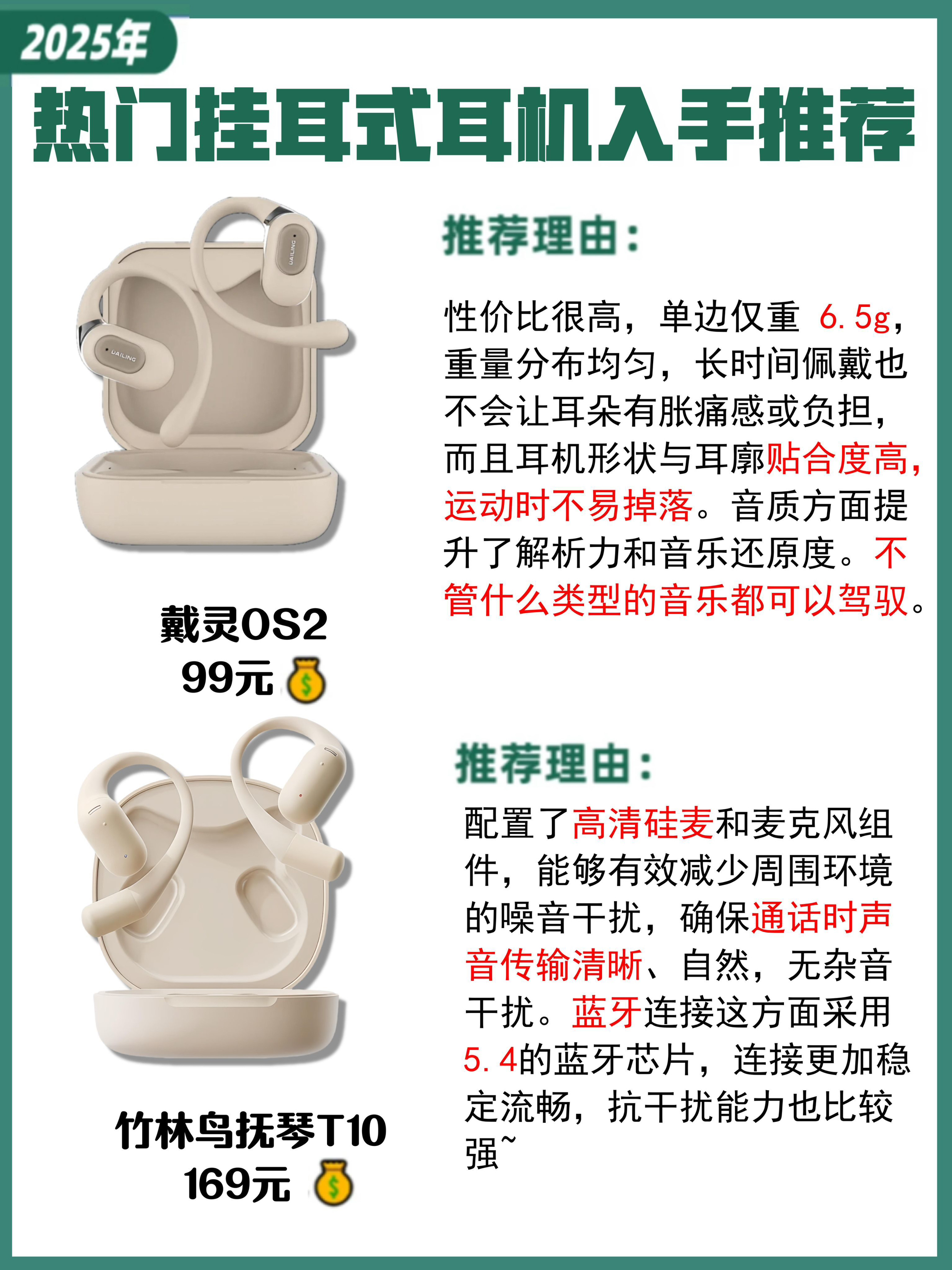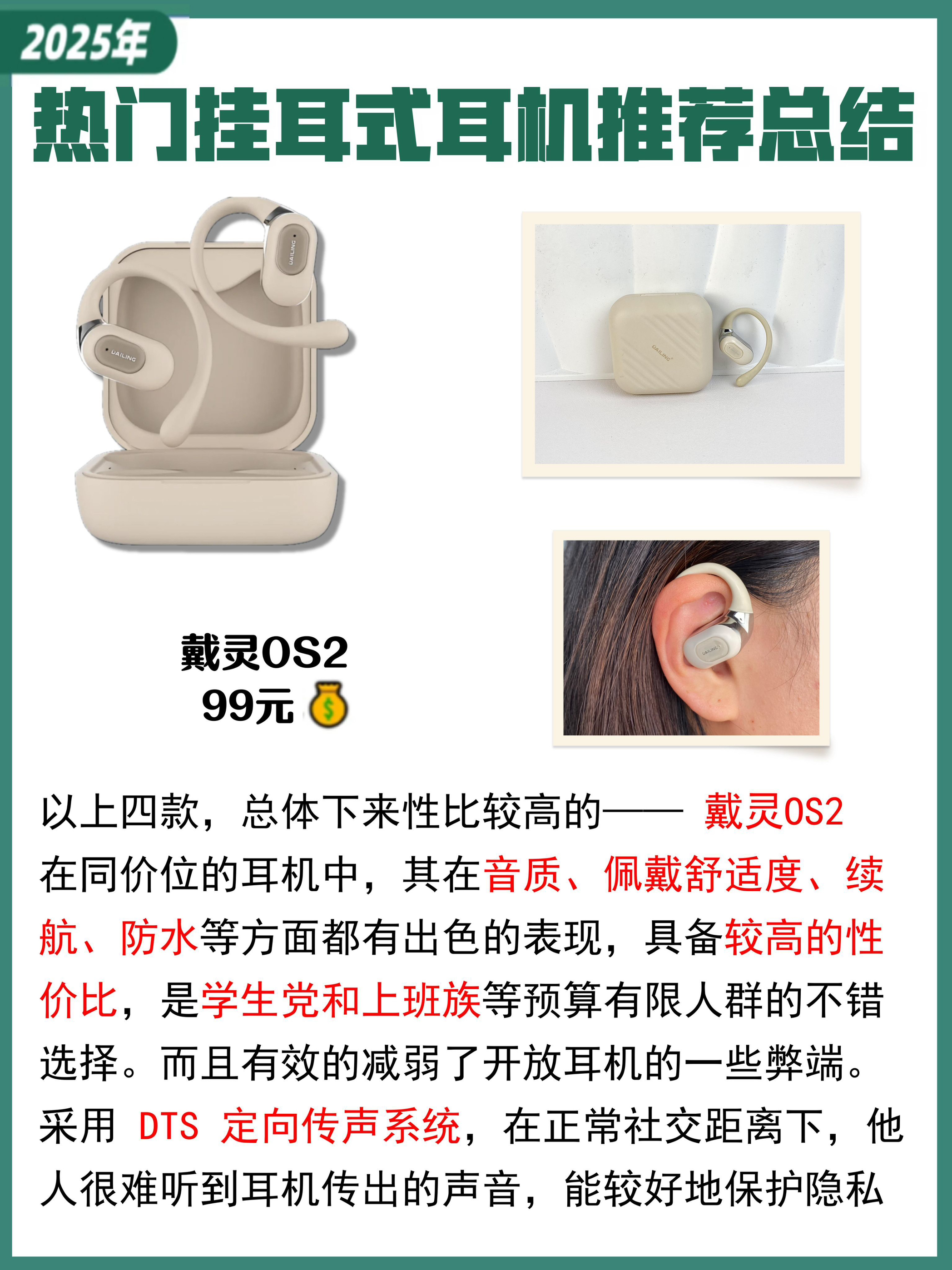 本篇笔记关联了DAILING/戴灵 OS2 挂耳式 蓝牙耳机 定向传音 通话降噪 防水 真无线 环绕音 超长续航 开放式 不入耳 暖日白、Edifier/漫步者 Comfo Solo 挂耳式 蓝牙 耳机 真无线 通话 高音质 空间音频技术 舒适稳固 长续航 开放式 不入耳 气传导 降噪骨传导概念 碧落蓝、竹林鸟 抚琴OWS T10 挂耳式 无线蓝牙耳机 运动跑步 好音质 暖日白等商品,为用户提供真实的使用体验和购买参考。
