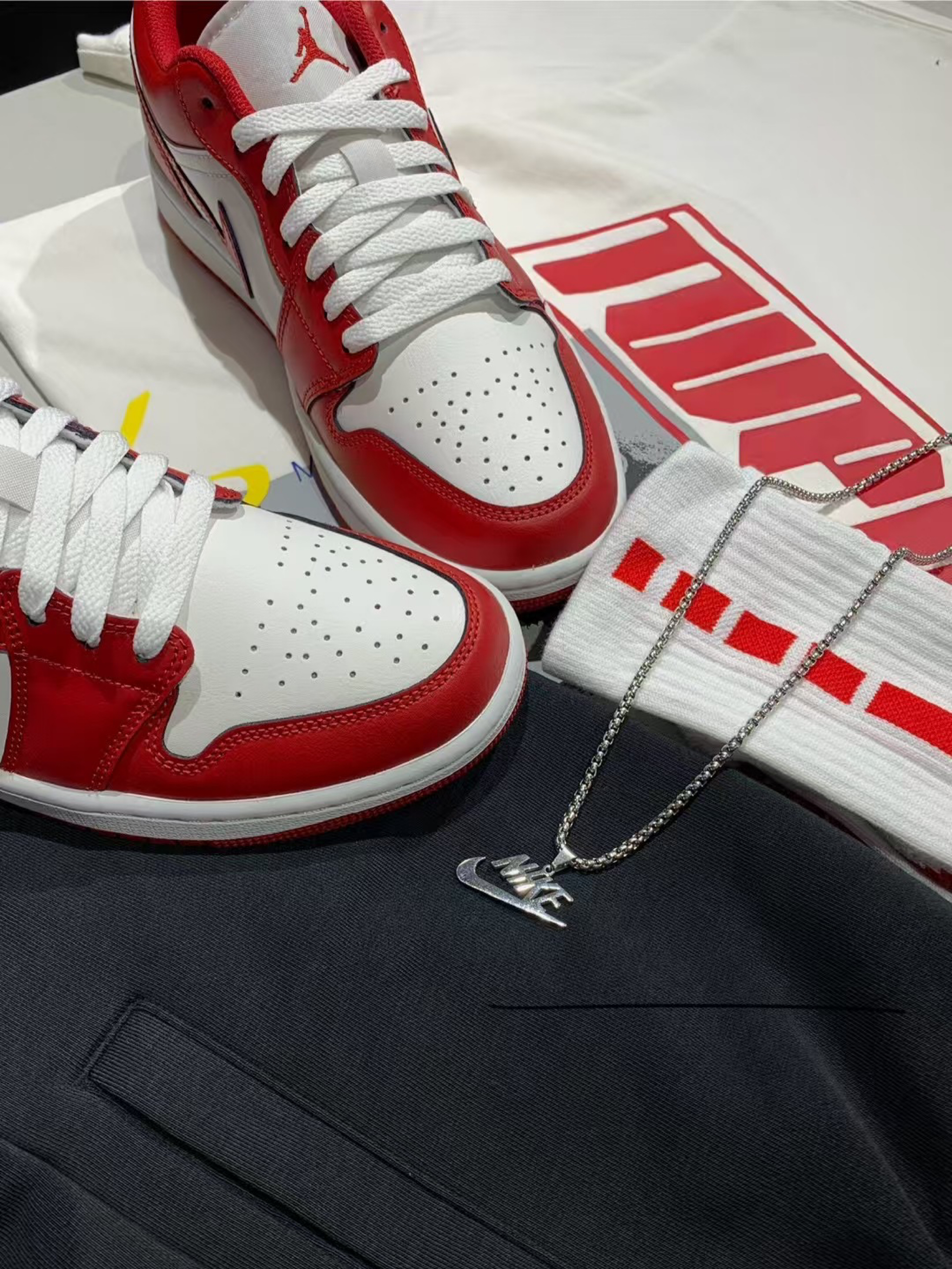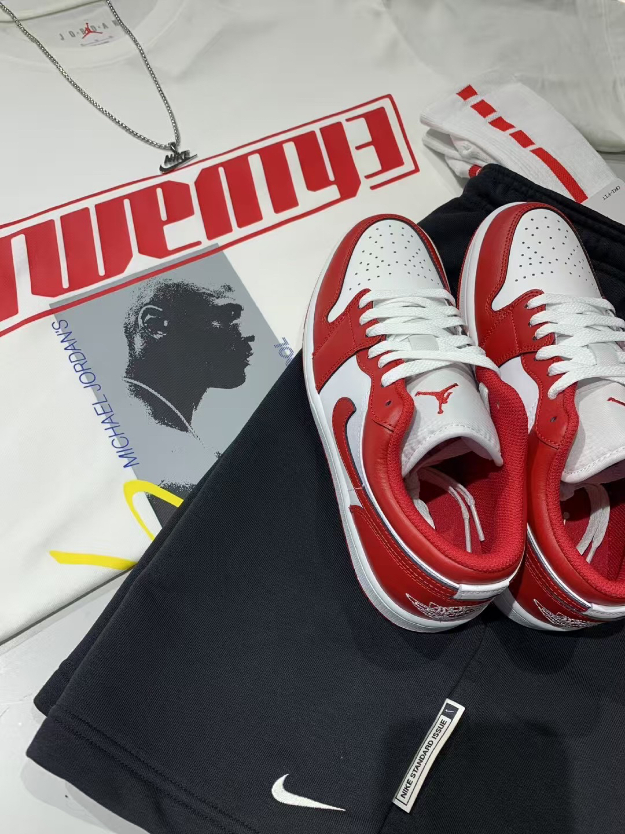 运动穿搭灵感💡 AJ 鞋+同系列 T 恤+Nike 短裤,经典红白黑配色超正,街头感拉满,舒适又潮酷,运动出街都适配~🆒 谁穿谁帅,种草一波✨
