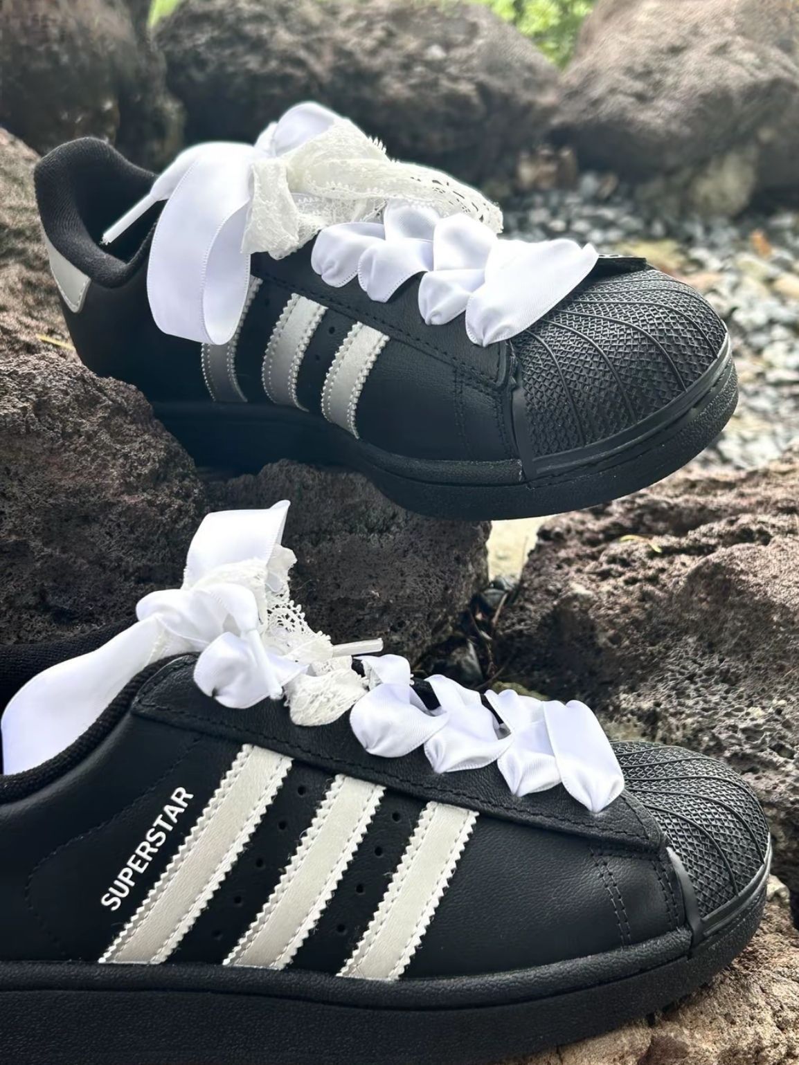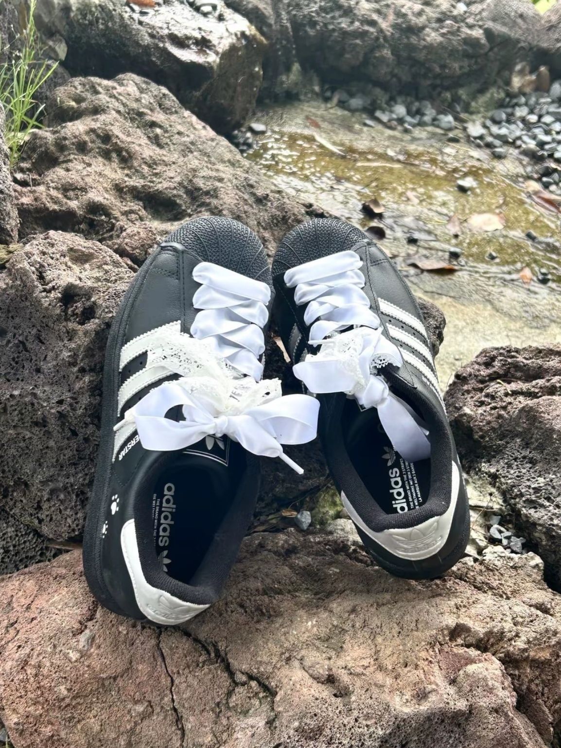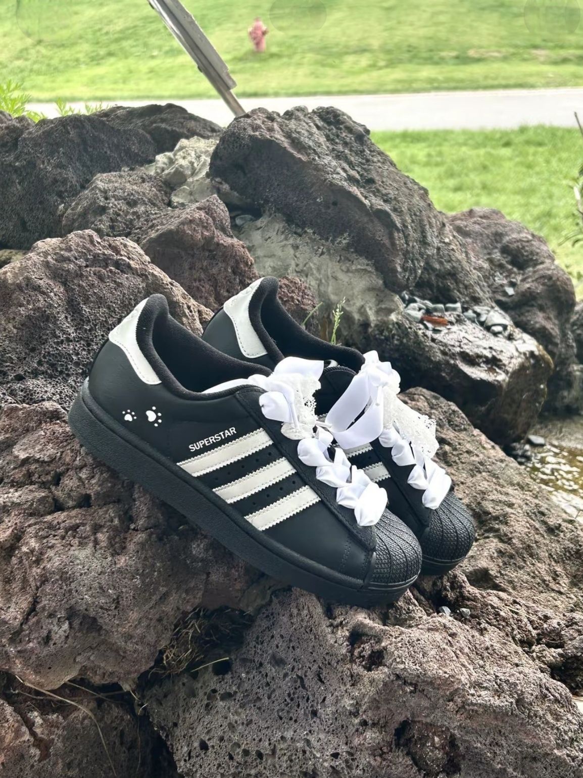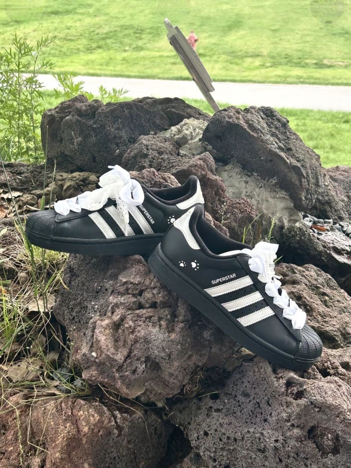 一、外观设计:甜酷风格再创新 阿迪达斯 Superstar 本就是经典鞋型,此次改造款在保留贝壳头、三条纹等标志性元素基础上,以黑色为主调,搭配白色缎带鞋带与蕾丝装饰,还加入可爱爪印图案,将经典运动风与甜酷少女感融合,打破传统 Superstar 的硬朗,增添柔美元素,适配多种穿搭风格,从甜系裙装到街头风裤装,都能轻松营造独特氛围 。 二、材质工艺:延续与升级 鞋面依旧采用皮革材质,质...