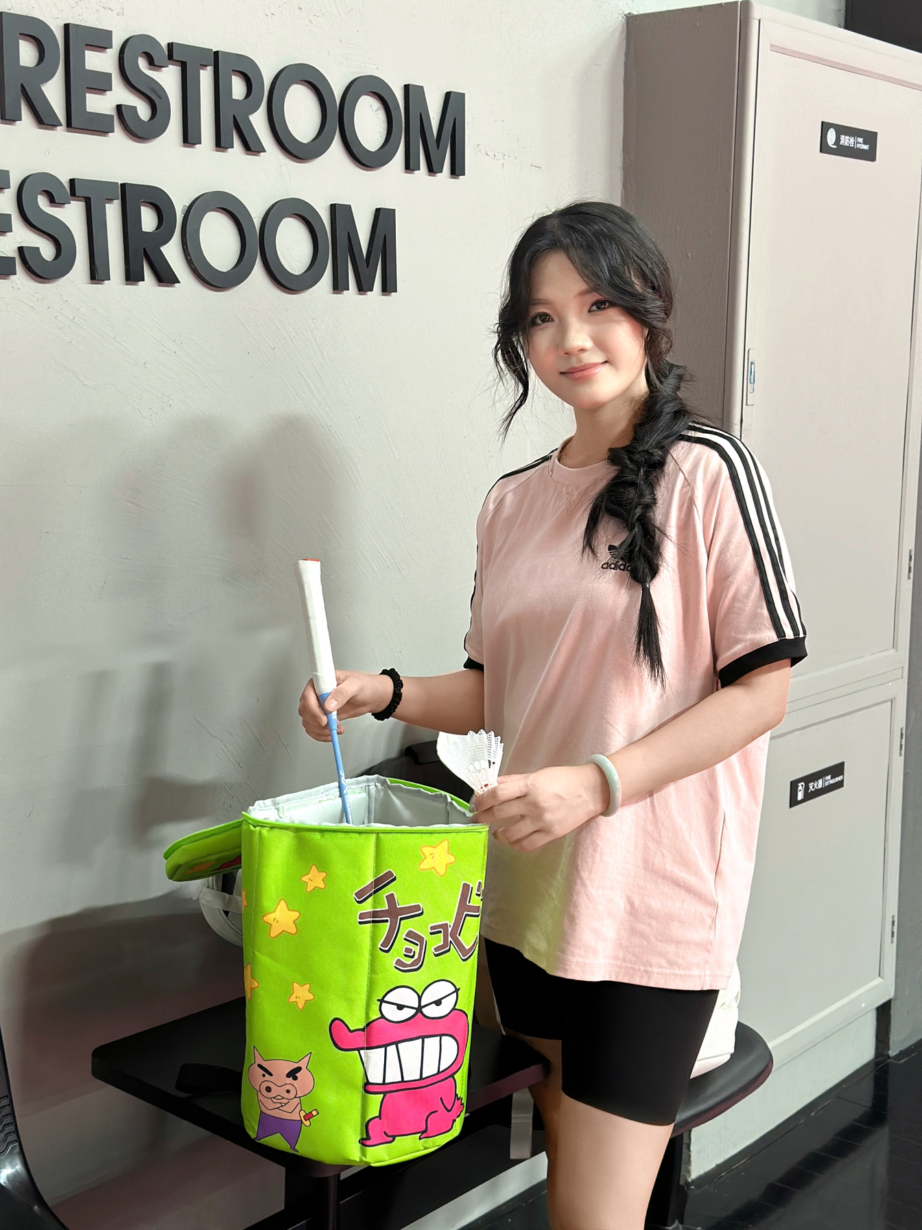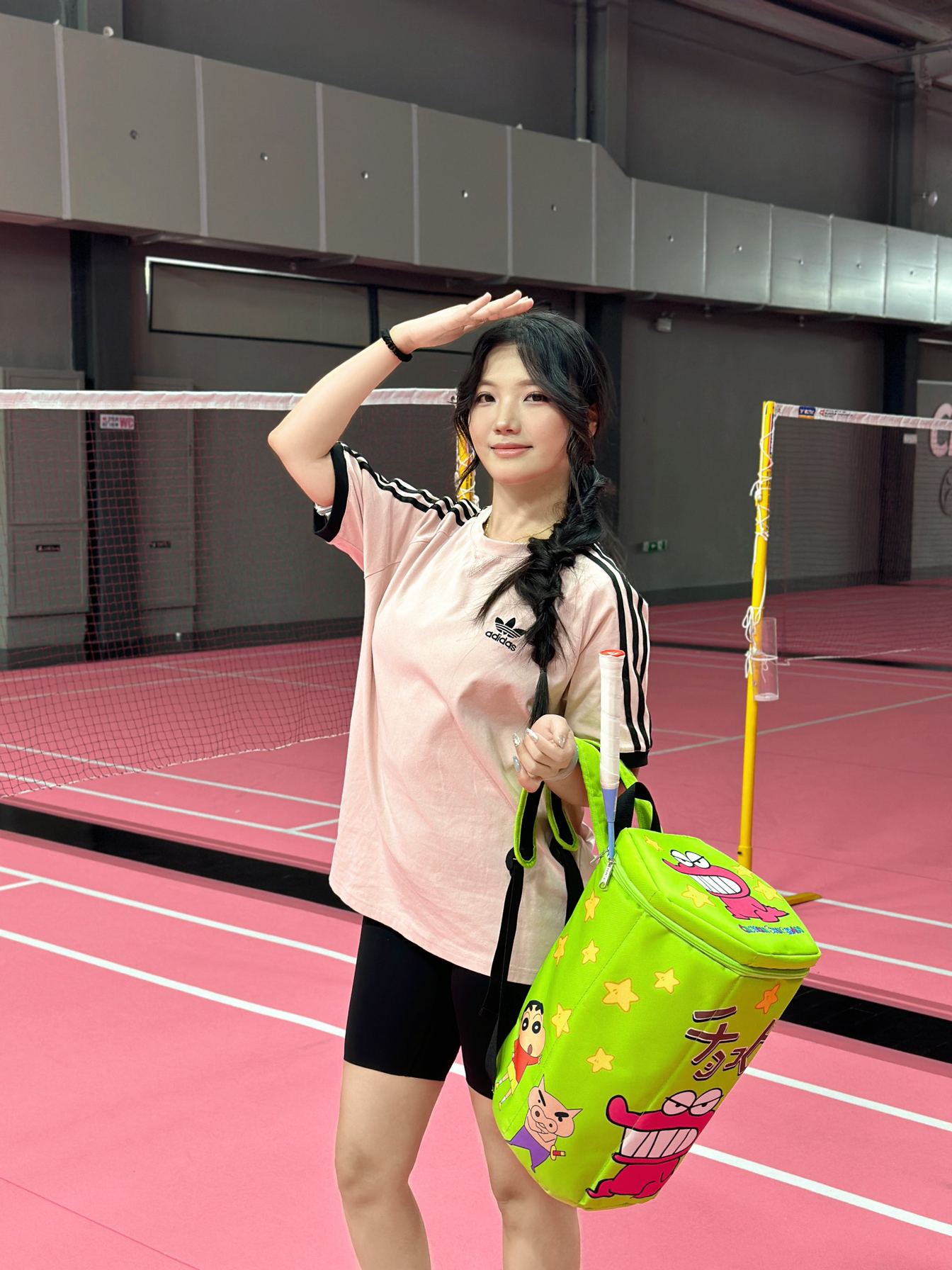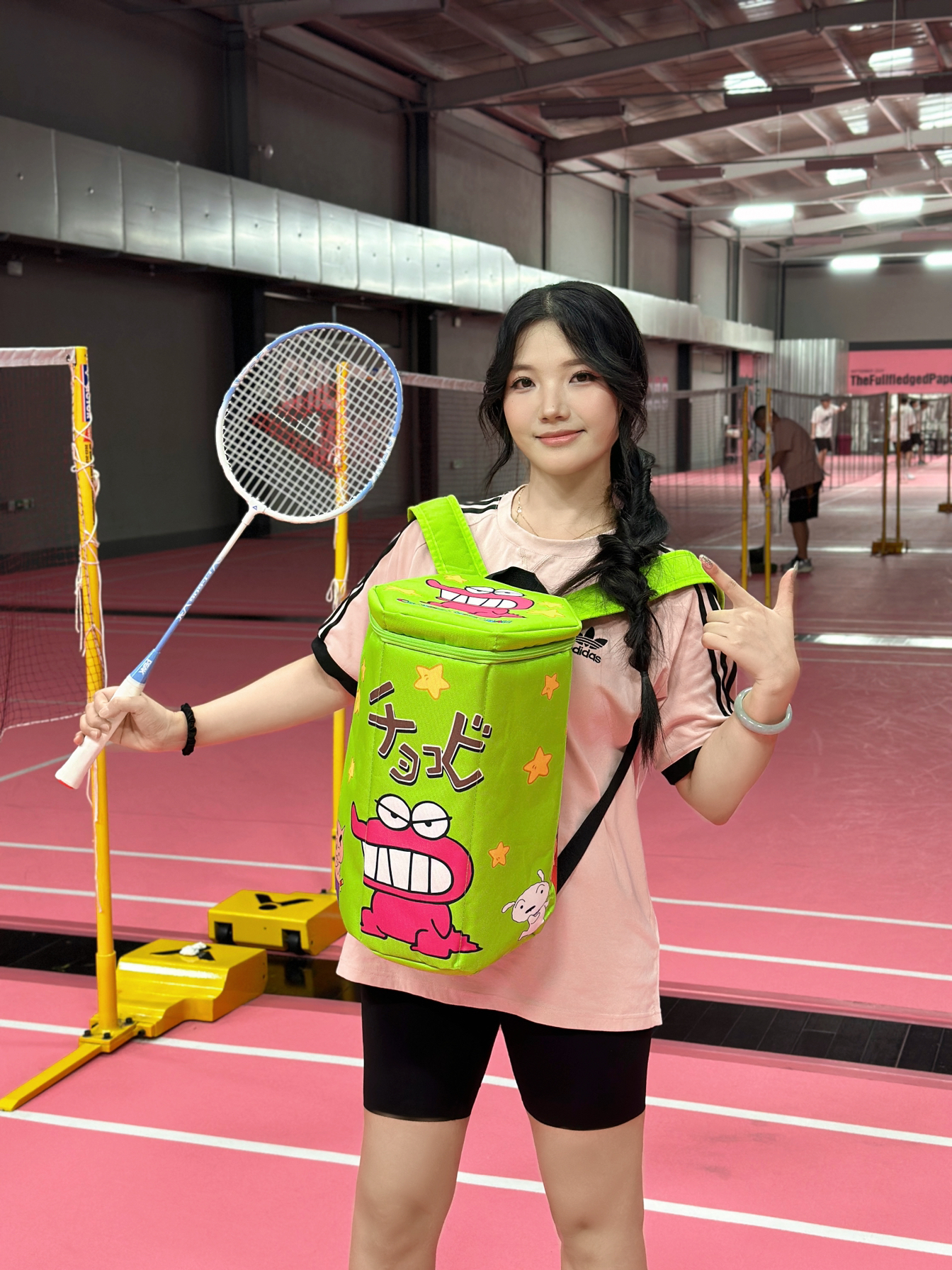 是我!这个太可爱啦!打羽毛球有专属包包啦 造型是独特的六边形!背着去羽毛球馆很吸睛! 穿的是阿迪的这件粉T恤,质感真的很好!!!!很喜欢经常穿