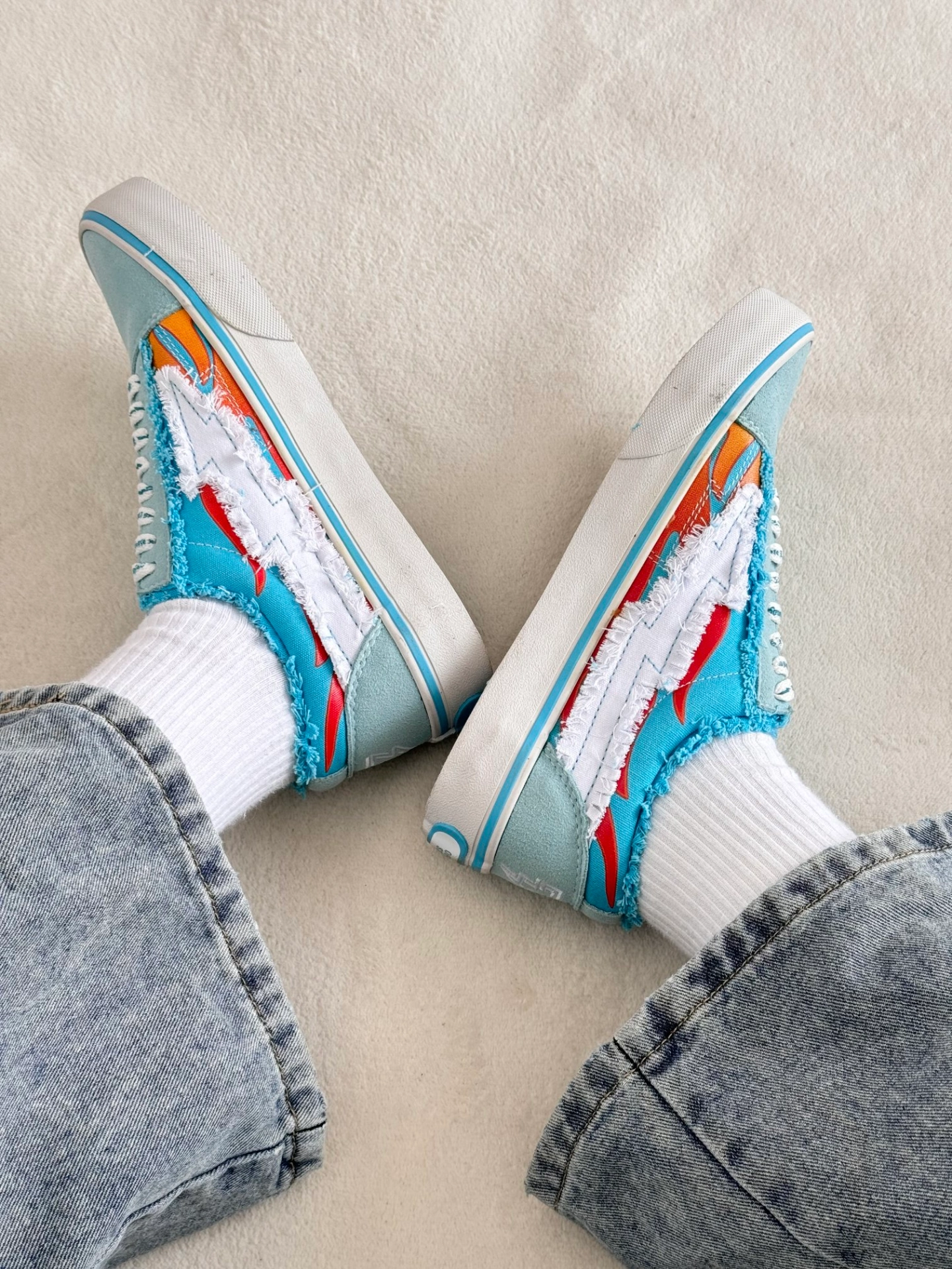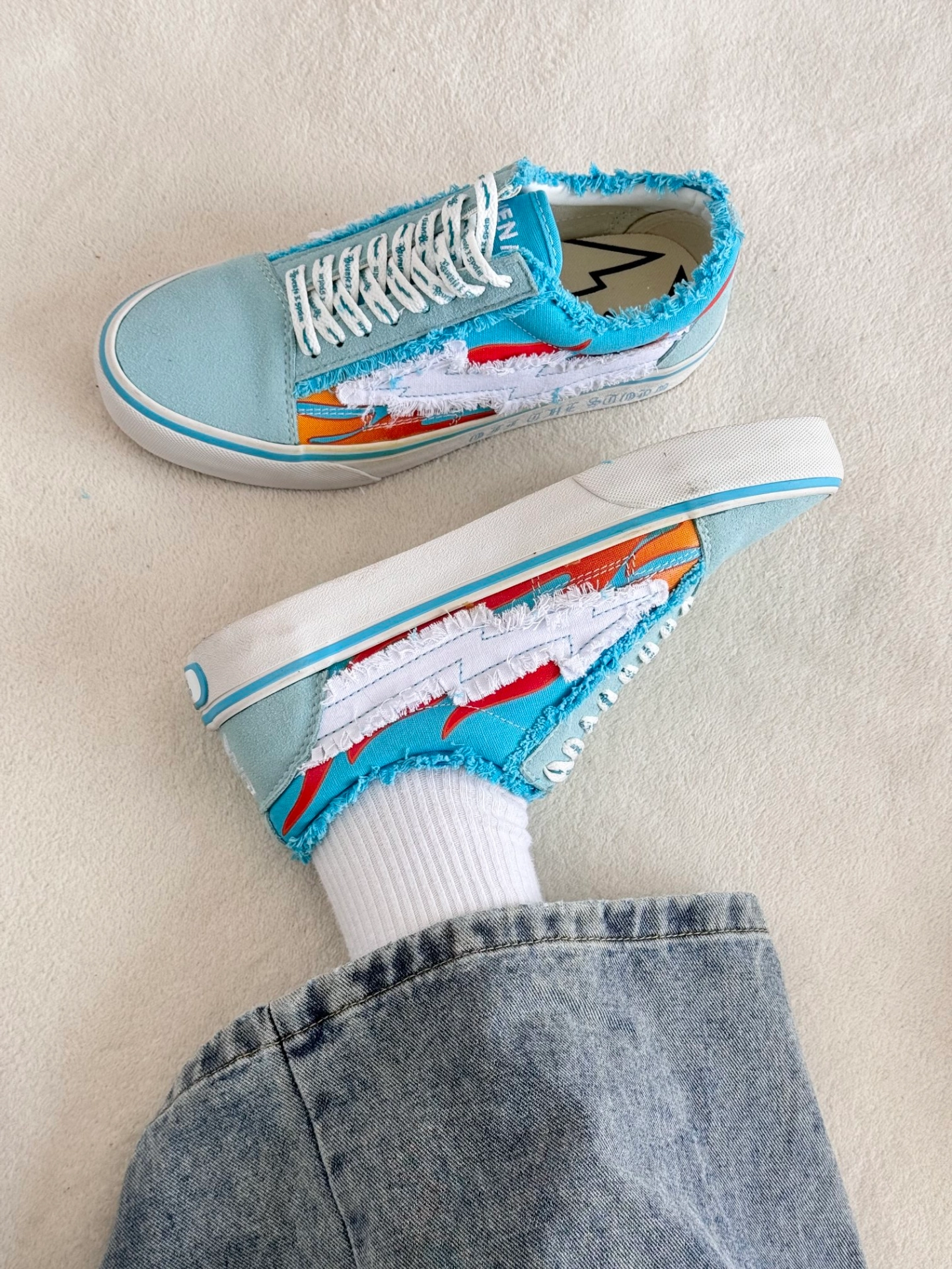 这双板鞋好有设计感 ~ 🔥➕⚡️logo 上🦶好好看~ 浅蓝配黄色!真的很吼吼看😍 鞋面是翻毛皮的~ 好穿不磨脚🫐很百搭! 脚感很好!穿起来软乎乎🍞 春天穿它去春游尊嘟美鼠了